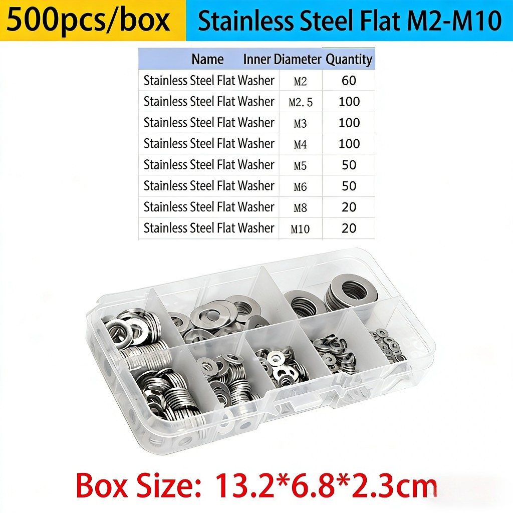 Stainless Steel Flat Washers Kit - 180/360/500pcs Assortment Box Plain Washer Gasket Ring