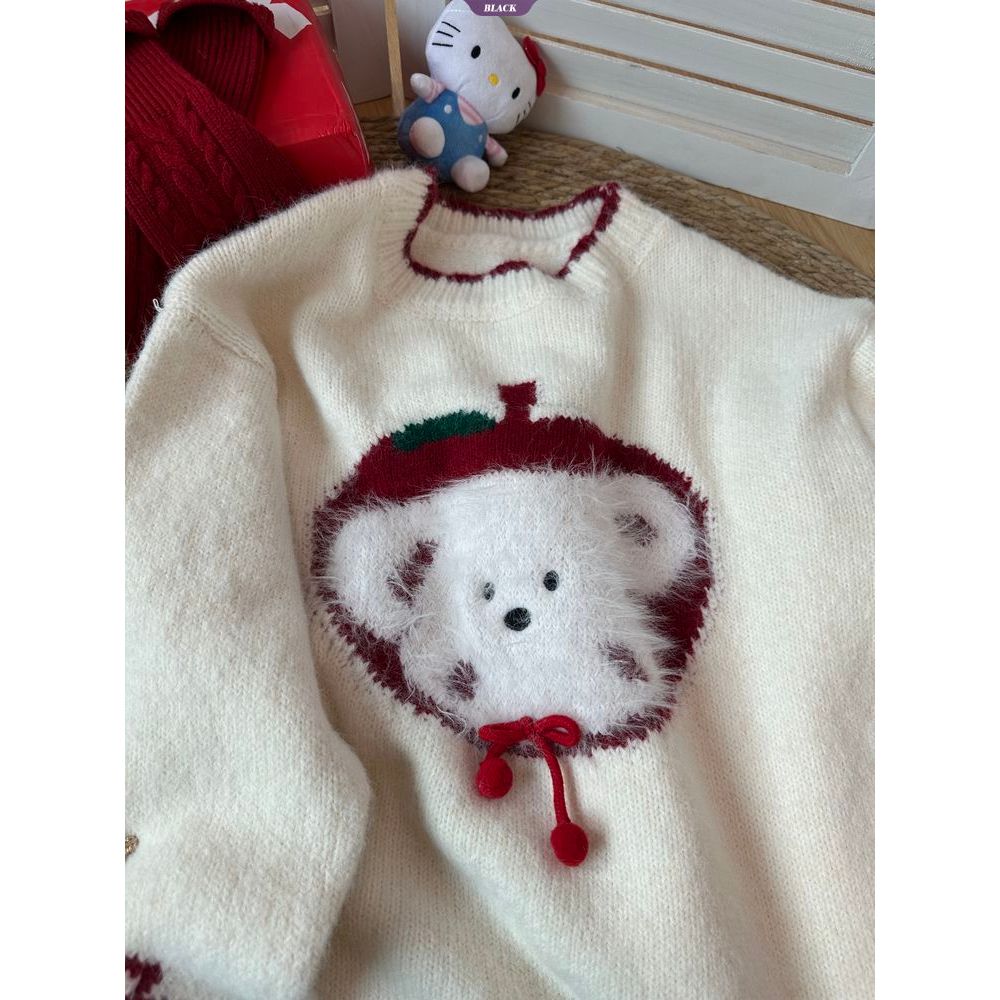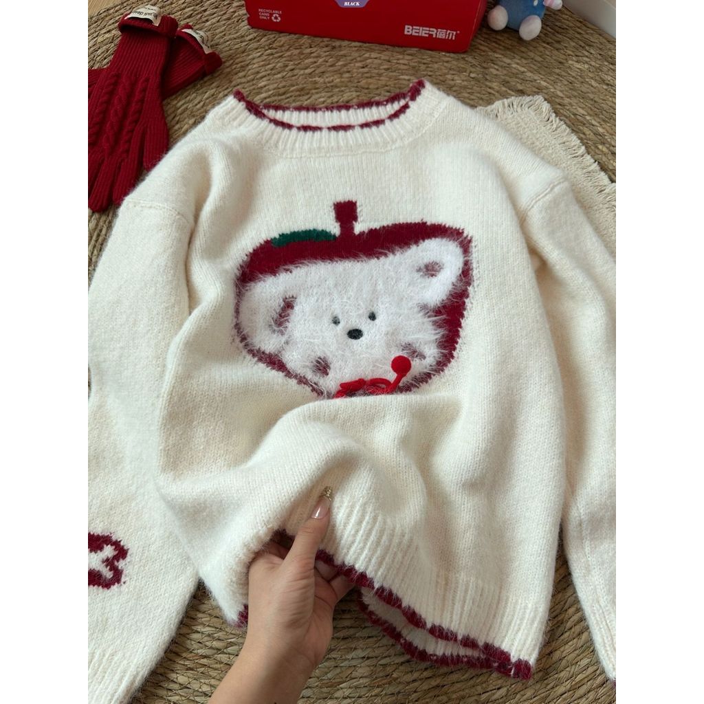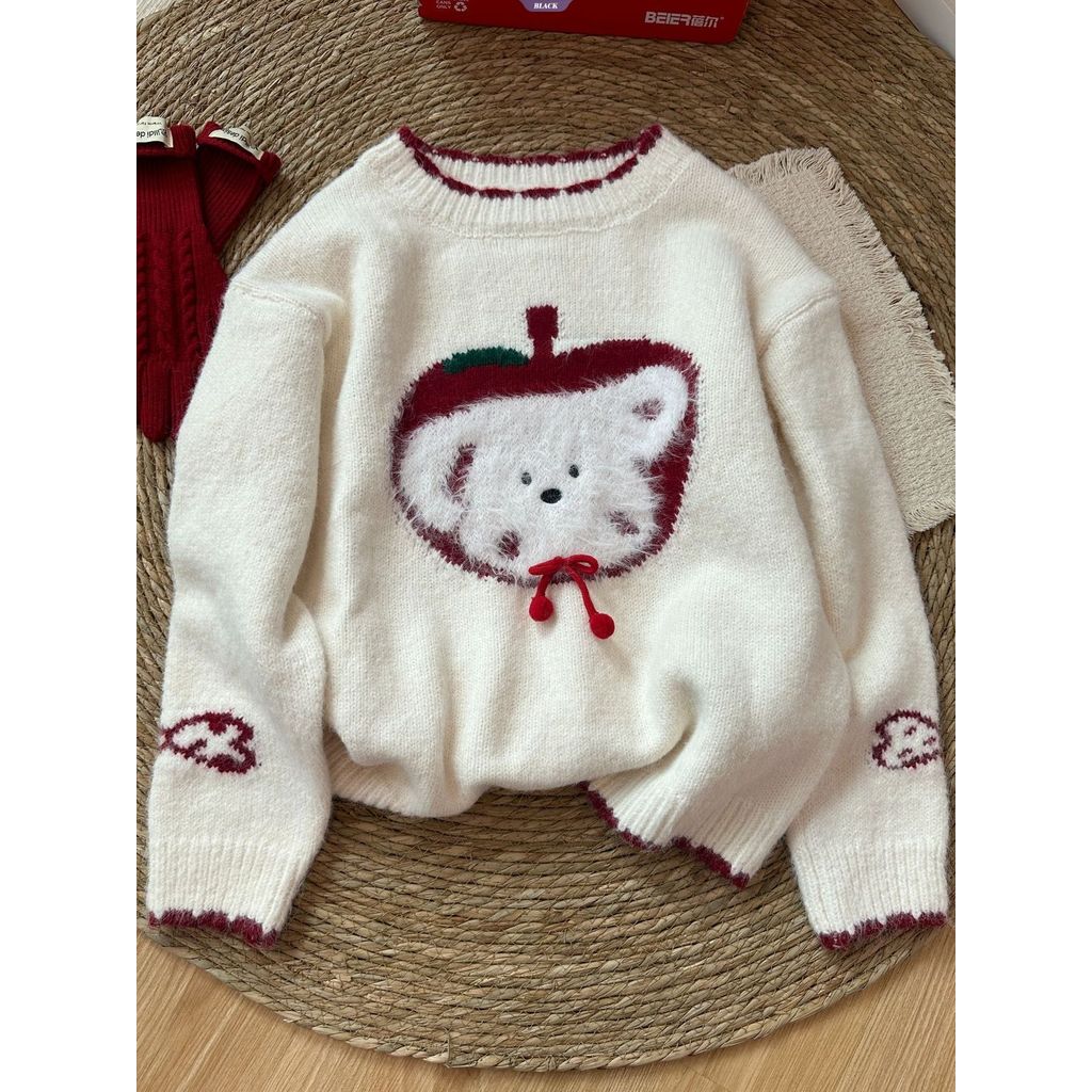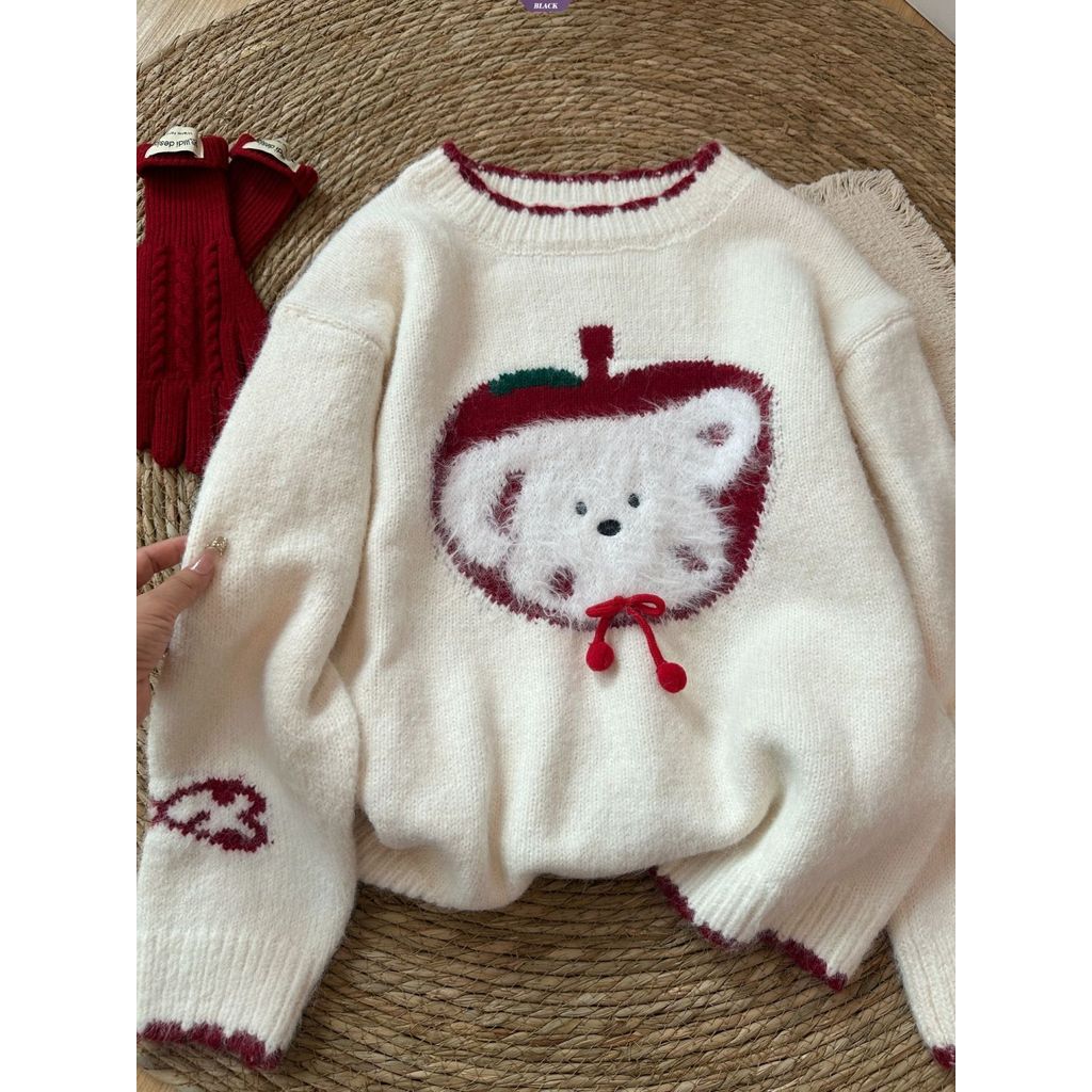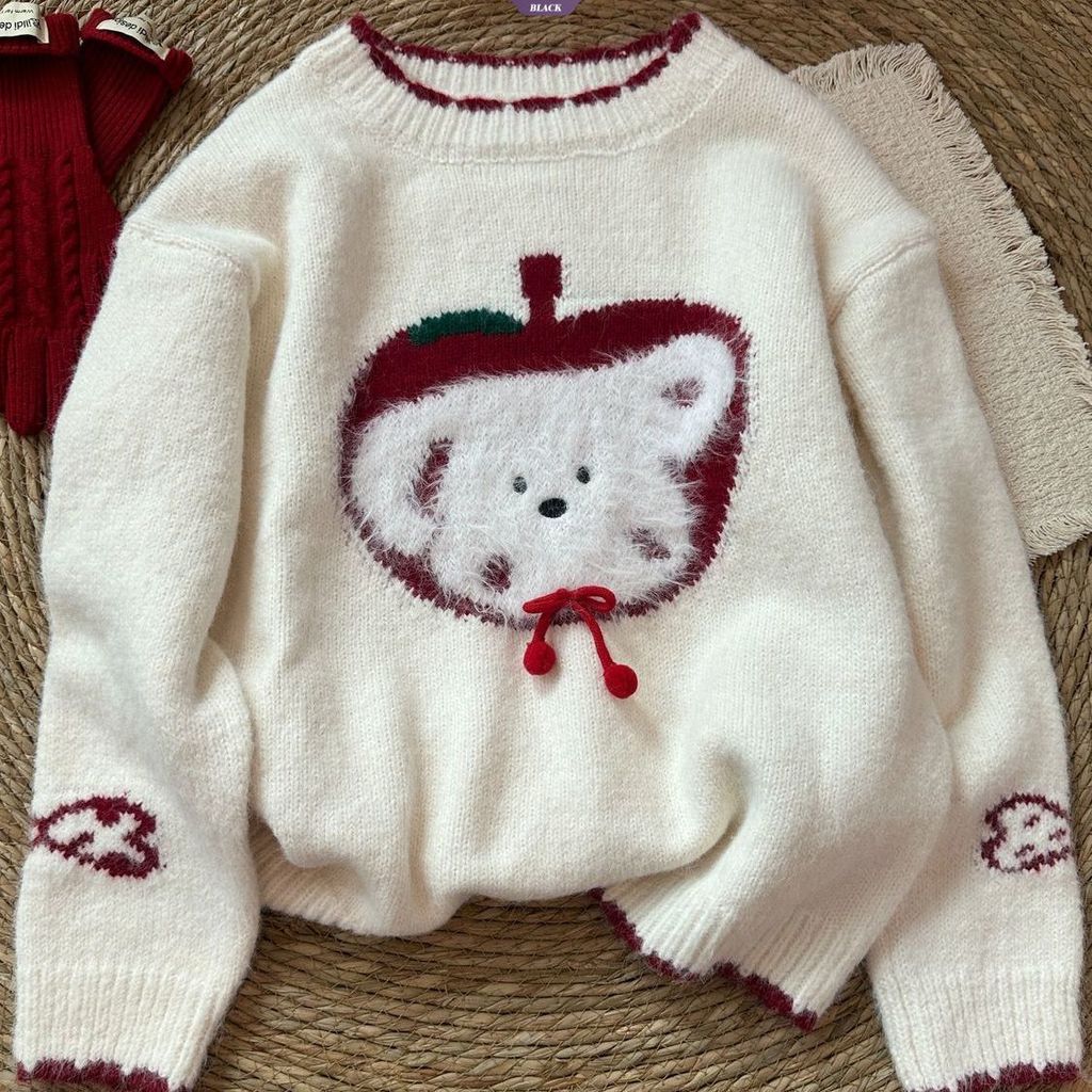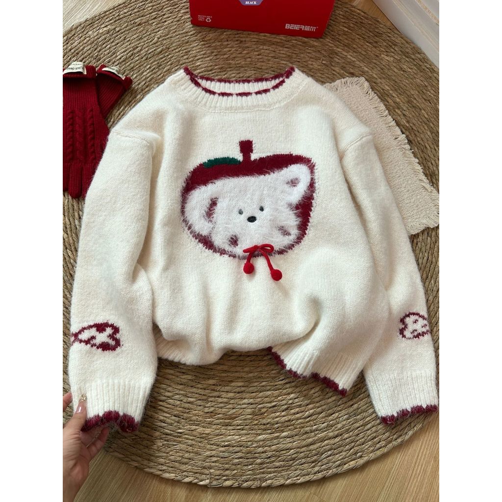 Cartoon Apple Puppy Winter Cute Sweater Women's Korean Style Crew Neck Loose Knit Top Warm Outerwear [BL]