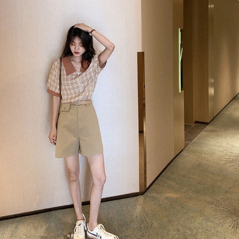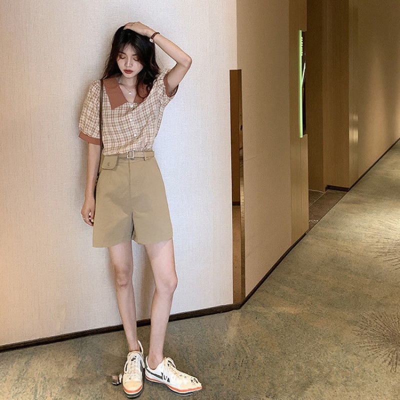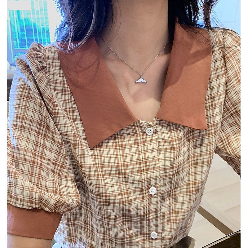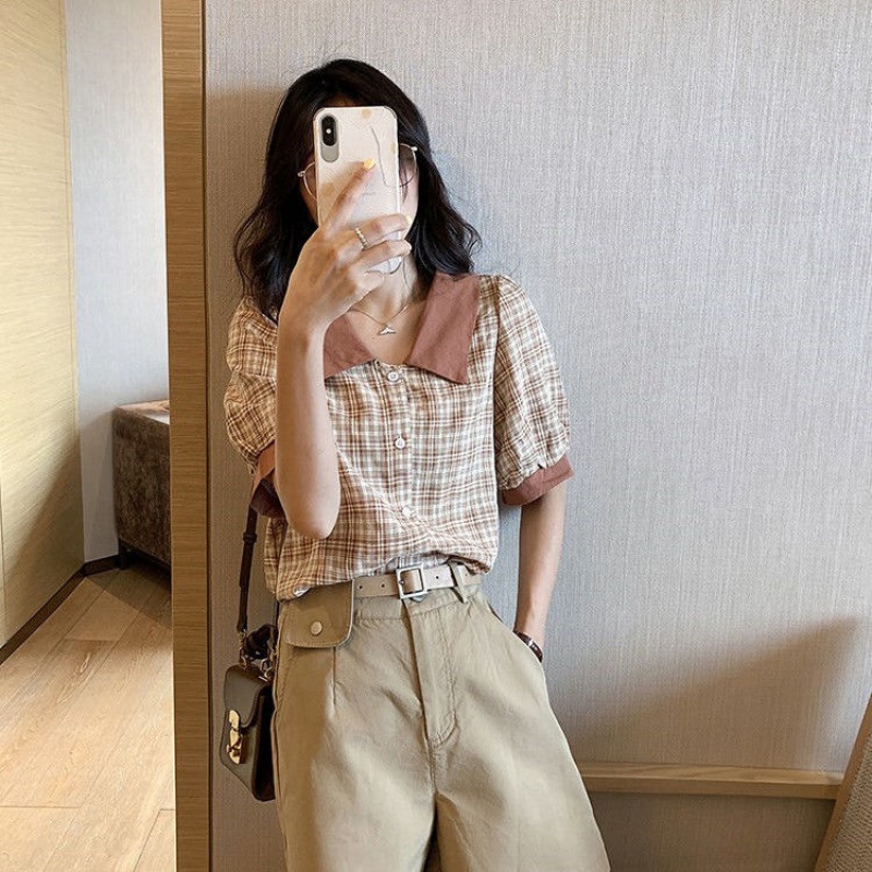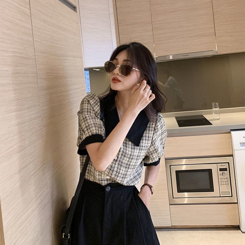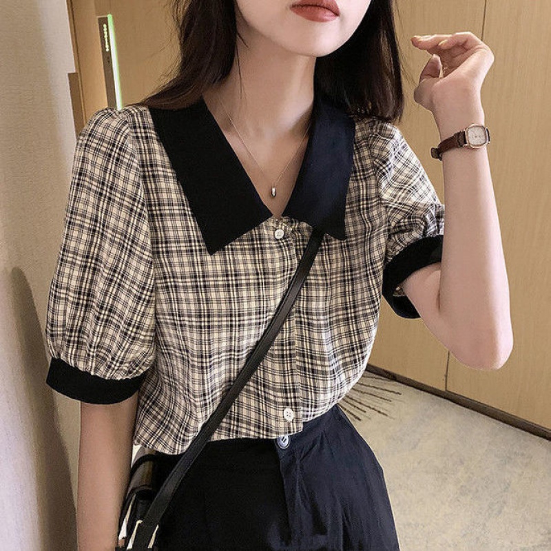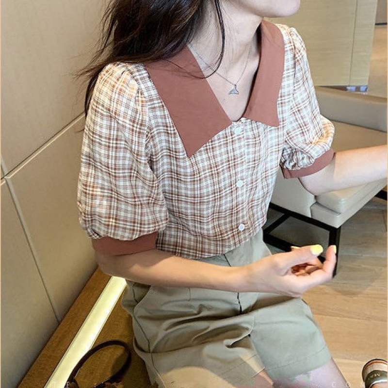 Plaid Shirt Women Blouse Summer New Design Sense Niche Top Retro Hong Kong Style Puff Sleeve