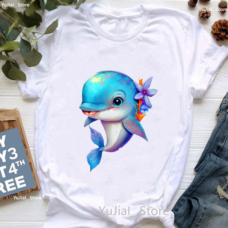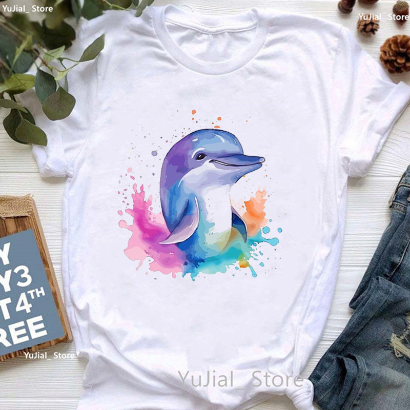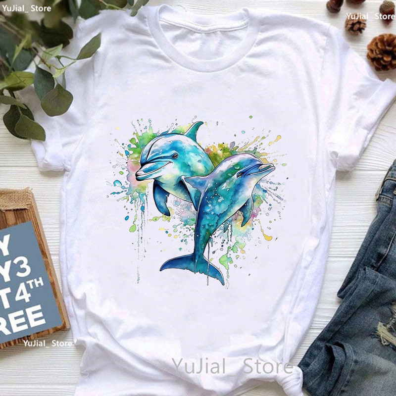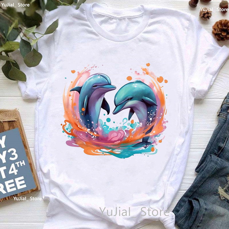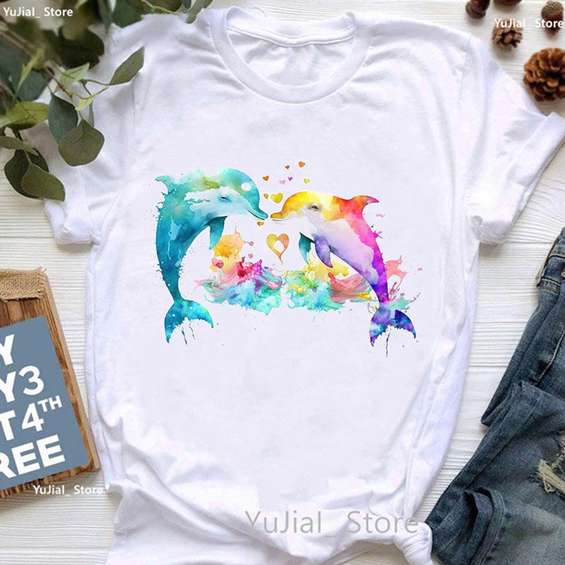 Watercolor Dolphin Love Printed Tshirt Women'S Clothing Harajuku Kawaii T Shirt Femme Summer Fashion Short Sleeve T-Shirt