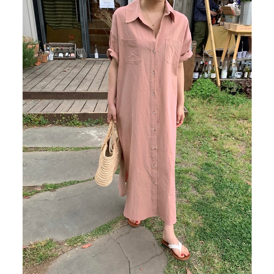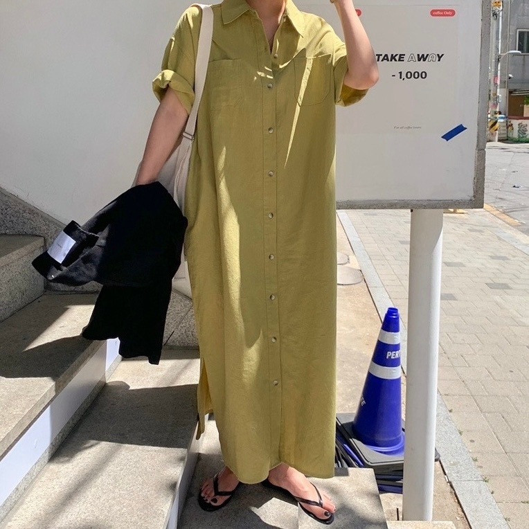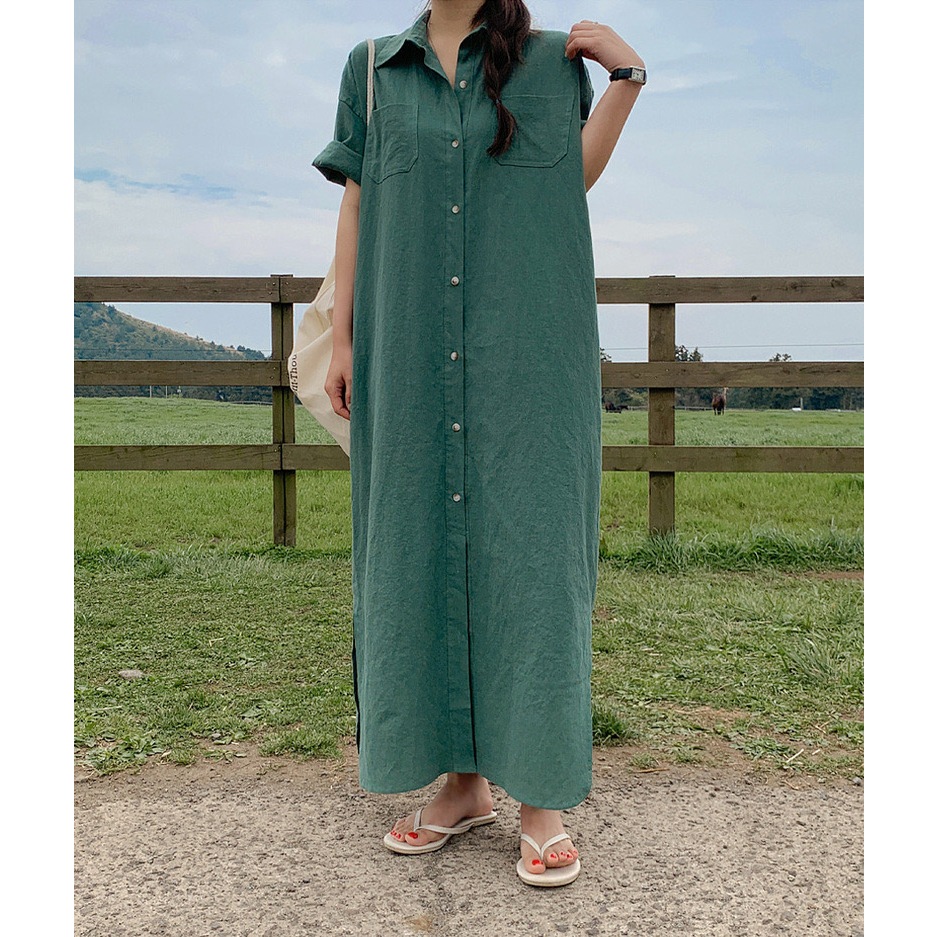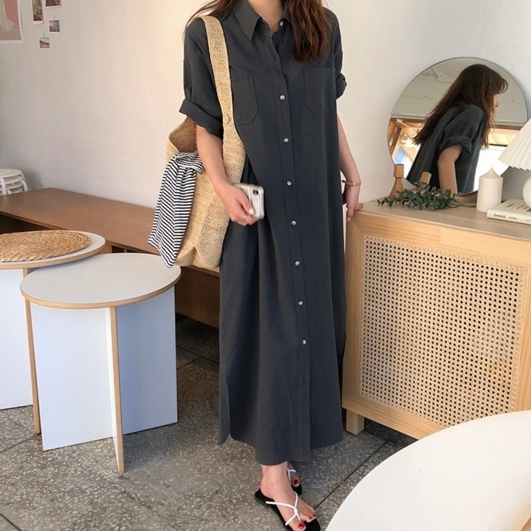 Y809 NEW Arrival Miss M Button Down Side Split Collar Neck Loose Dress w/ Front Pockets