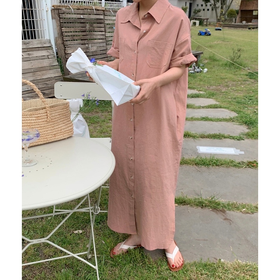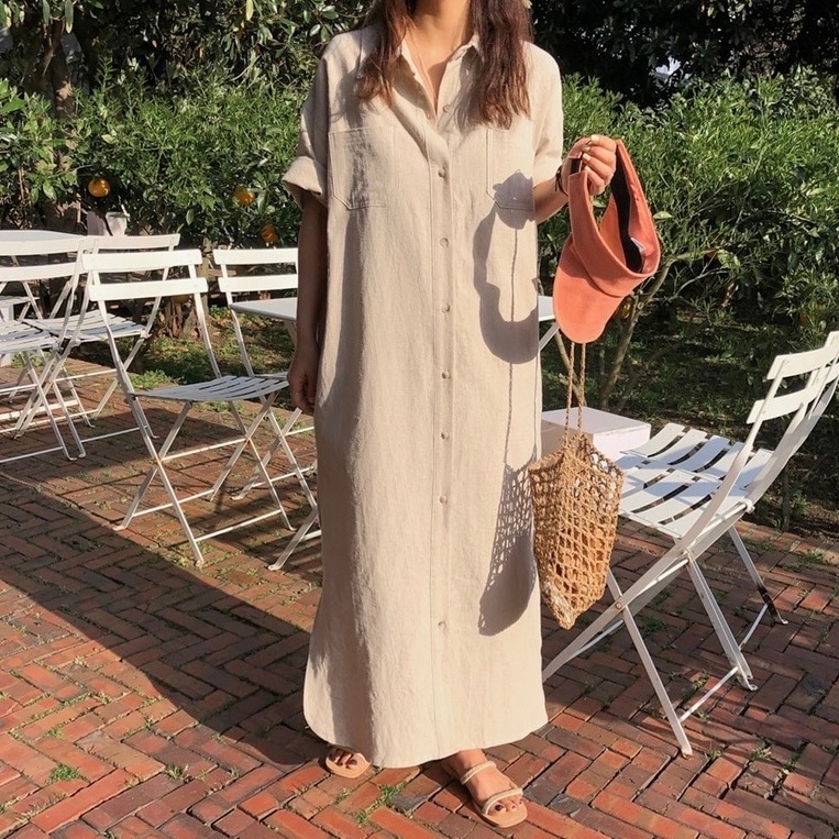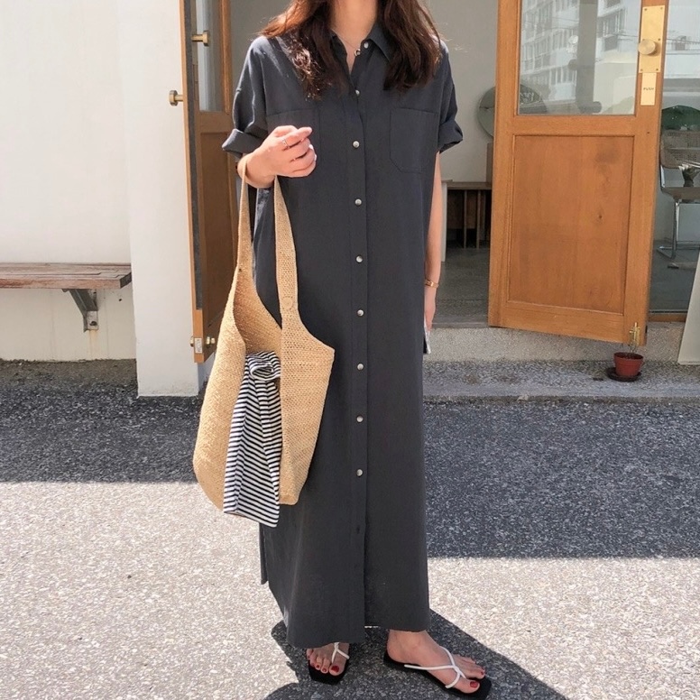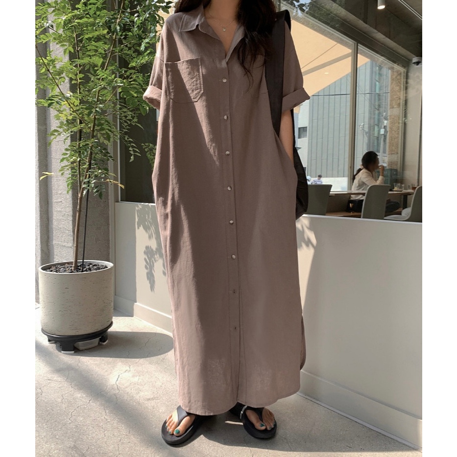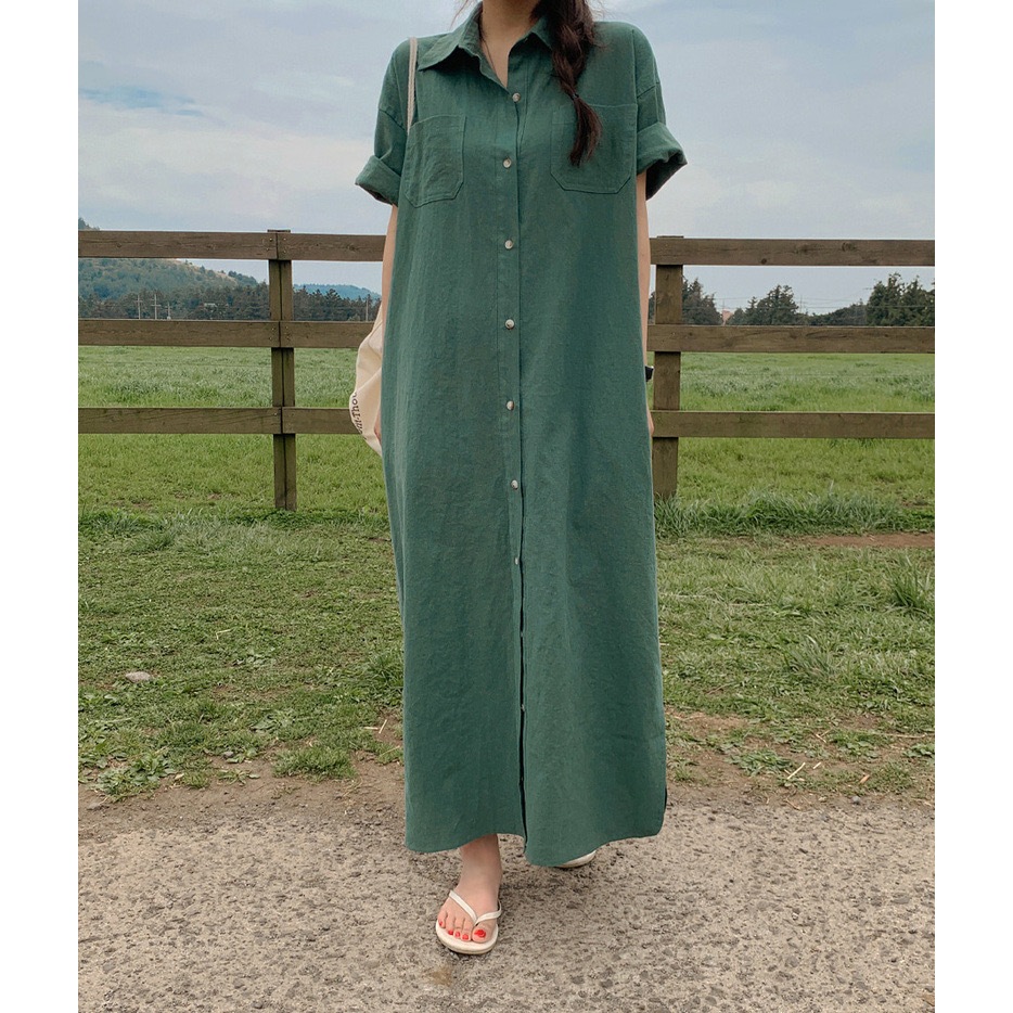 Y809 NEW Arrival Miss M Button Down Side Split Collar Neck Loose Dress w/ Front Pockets