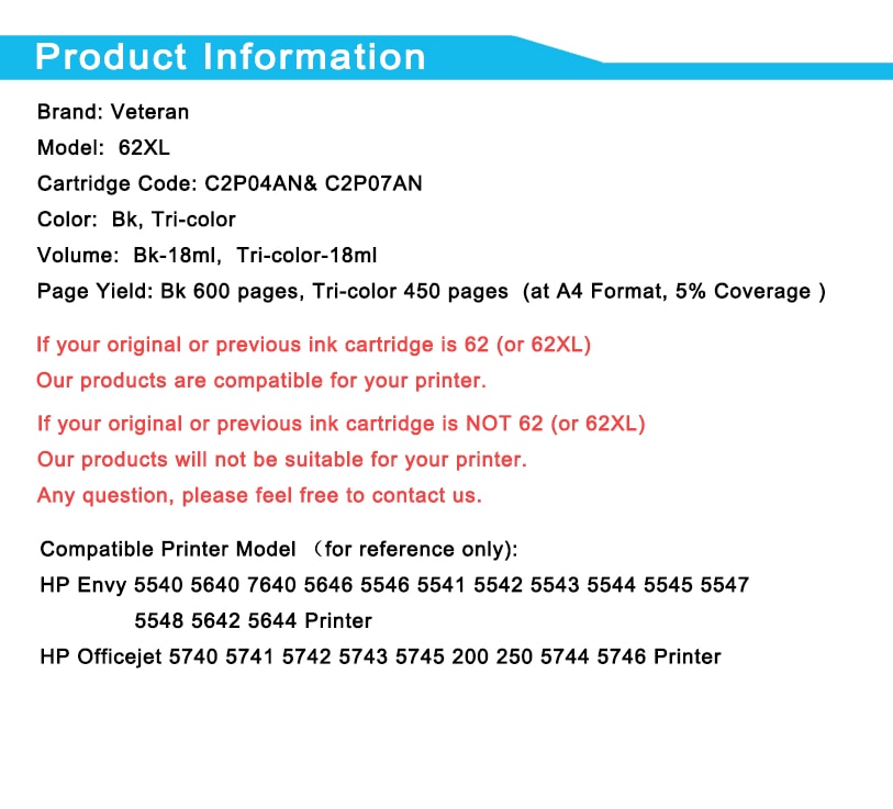 62XL Refilled Ink Cartridge Replacement for hp 62 XL hp62 for HP Envy 5640 OfficeJet 200 250printer