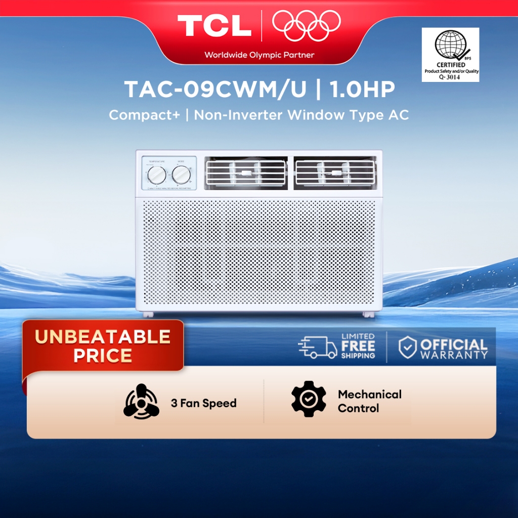 TCL 1.0HP Aircon Window Type - TAC-09CWM/U, R32 Refrigerant, Auto-Restart, 3 Fan Speeds, 8-Way Air