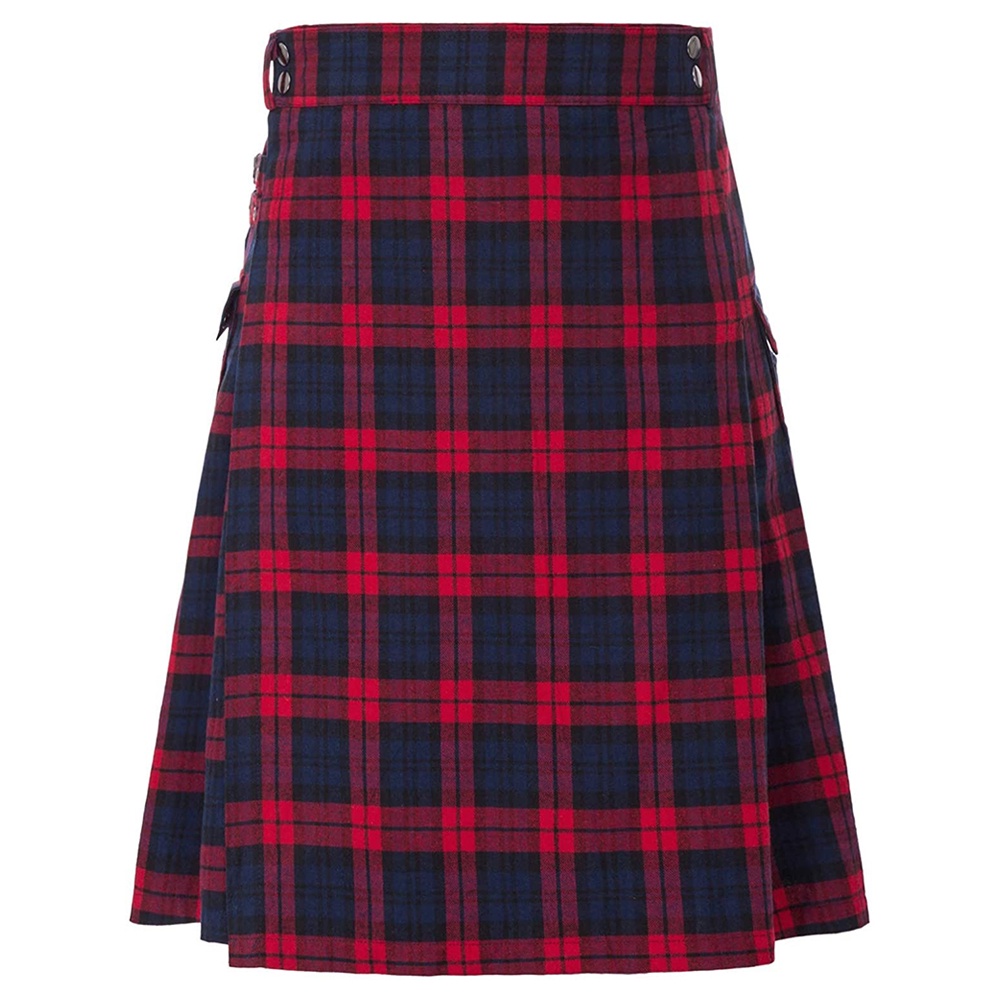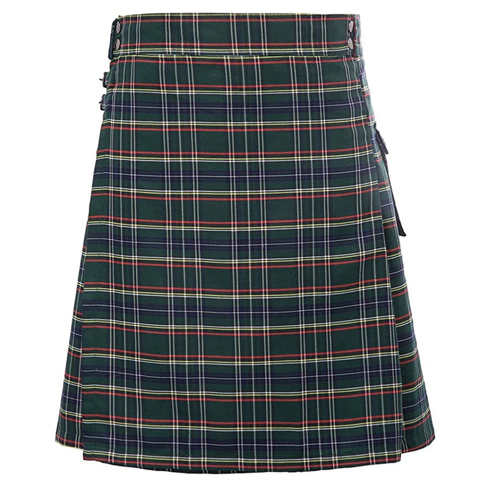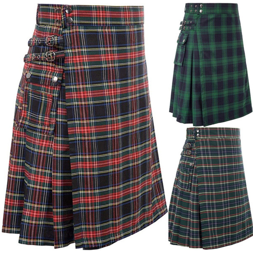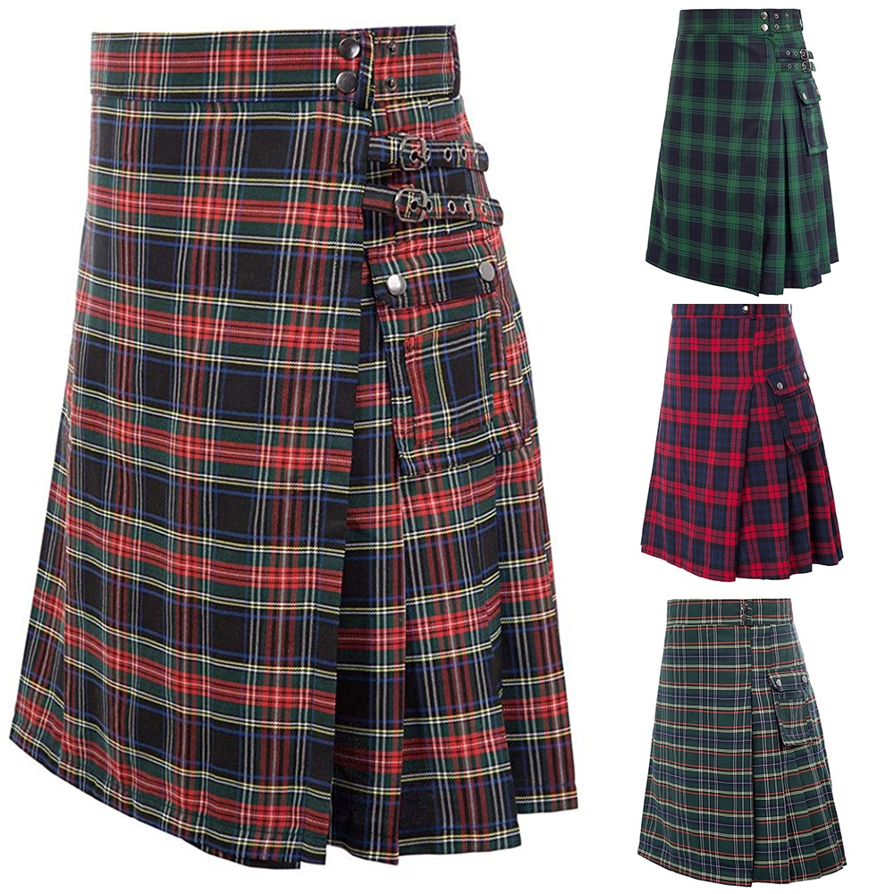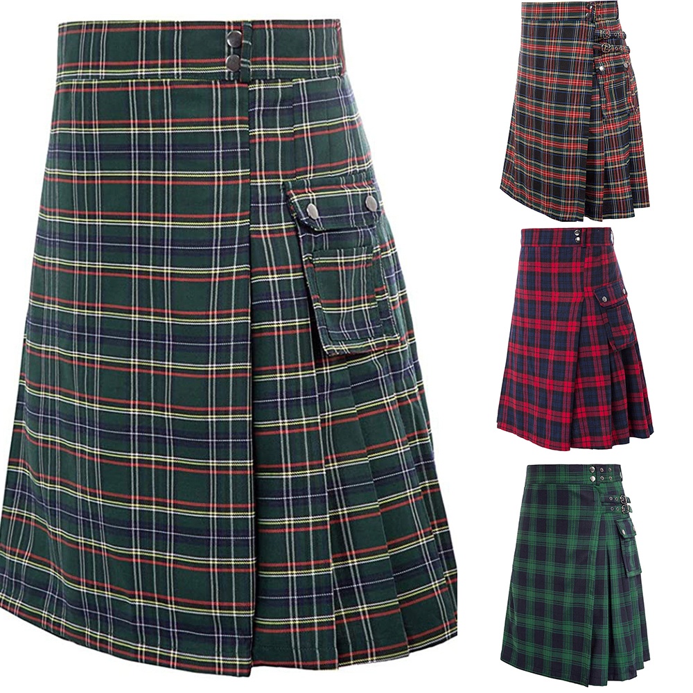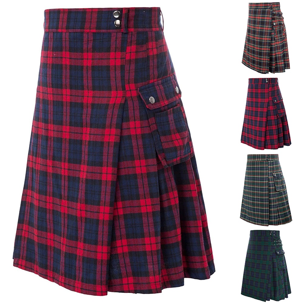 Men's Casual Kilt Highland Scottish 4 Colors Contrast Pleated Skirt with Pockets