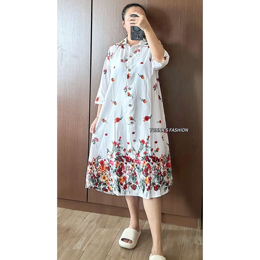 XL-XXL Women's Plus Size Floral Dress Collared 3/4 Sleeves Bangkok Straight Loose Midi Dress 1182