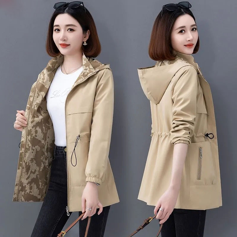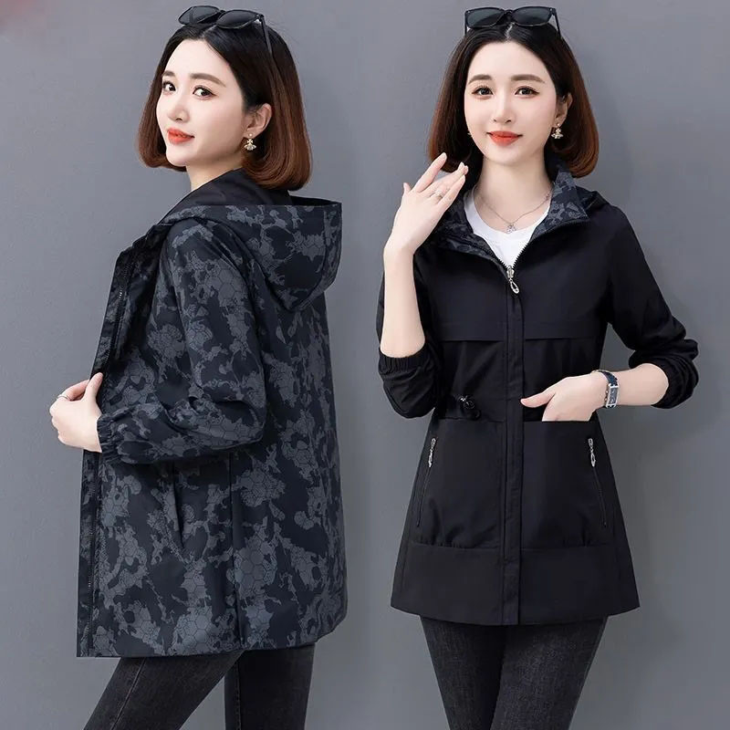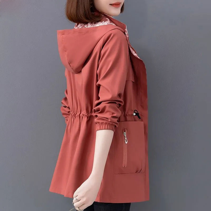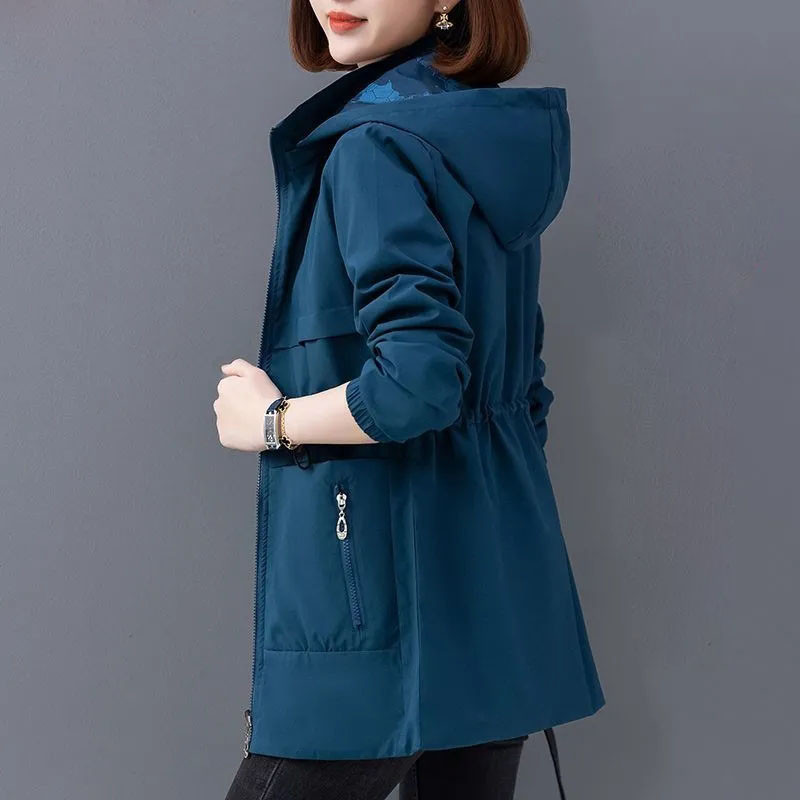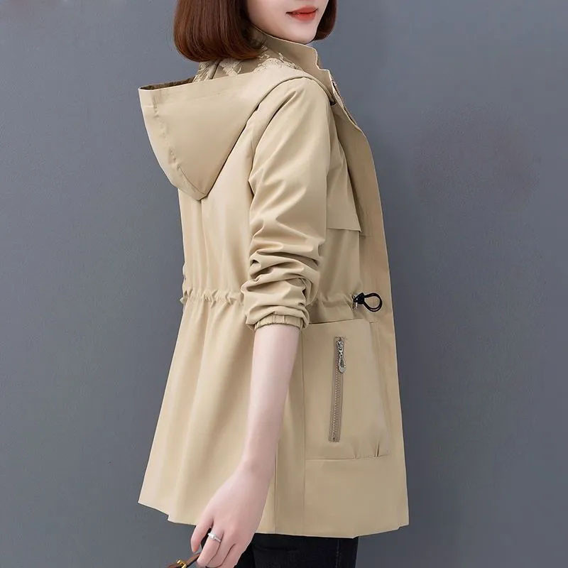 S-4XL Women Trench Jacket Hooded Zipper Short Printed Lining Spring Autumn Fashion Casual Elegant Slim Loose Windbreaker Coat Plus Size Mother Black Khaki Red Blue