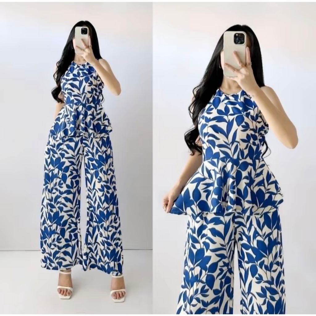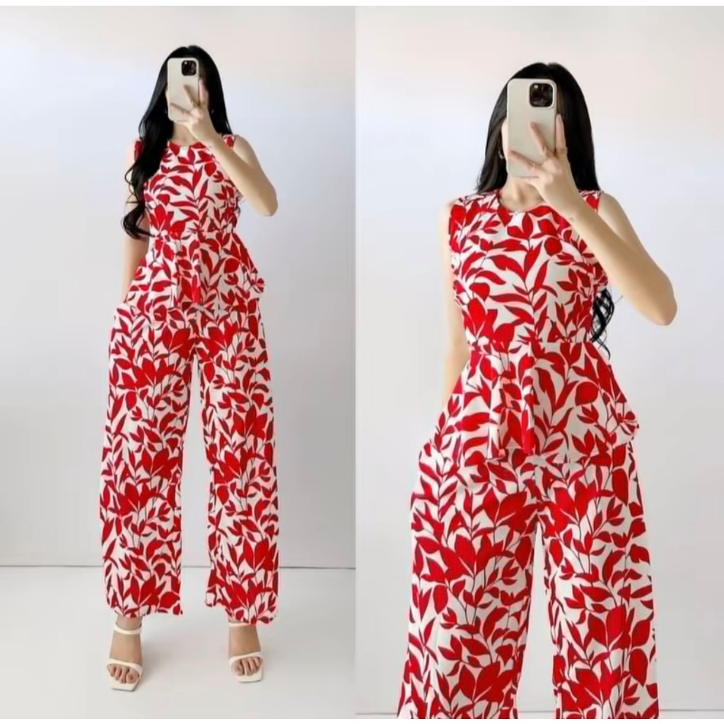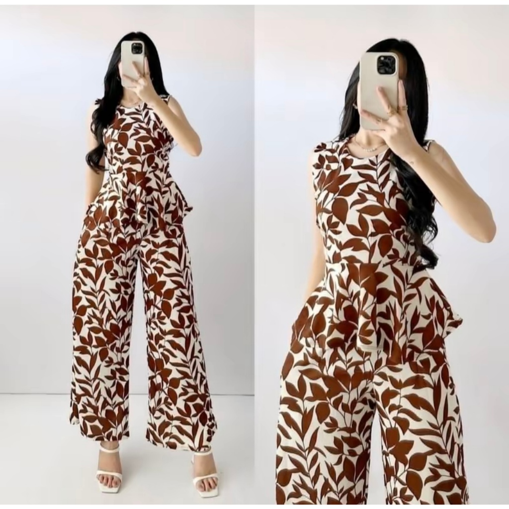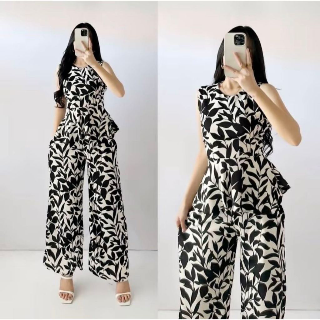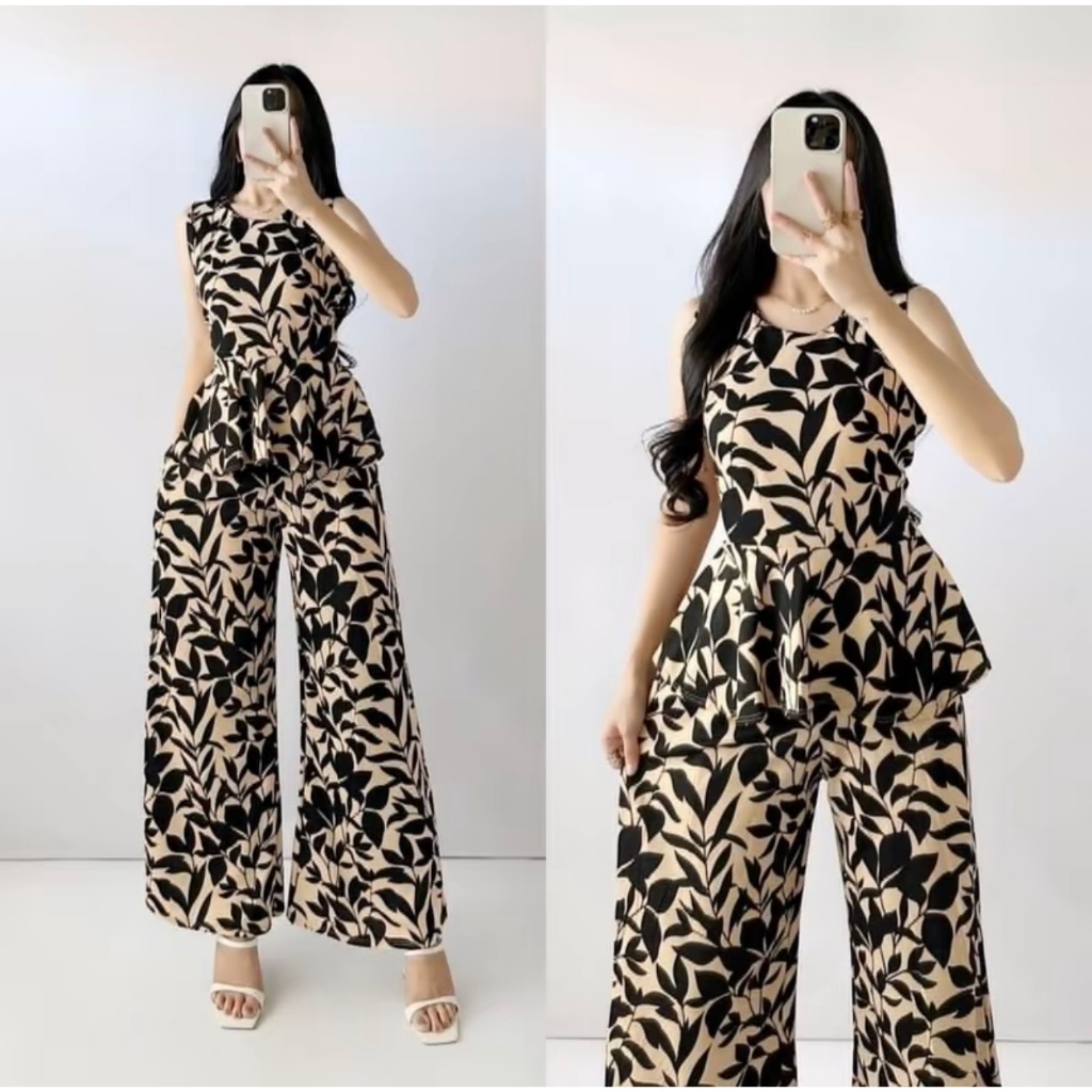 Vernice Print Casual Crepe Terno with Peplum Top & Wide Leg Pants for Women - Stylish Everyday Wear