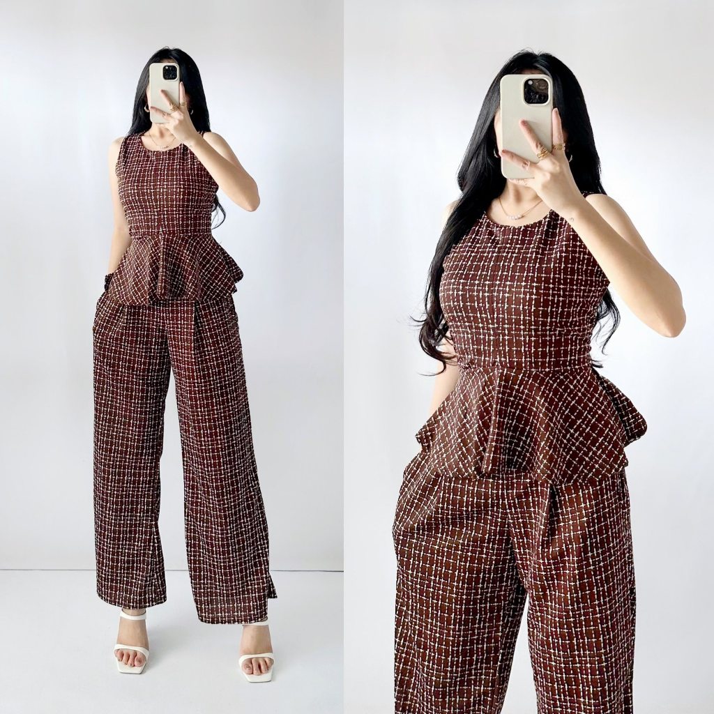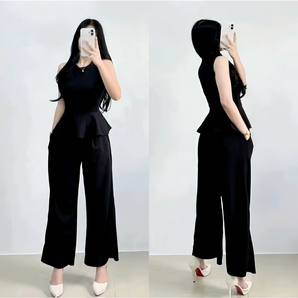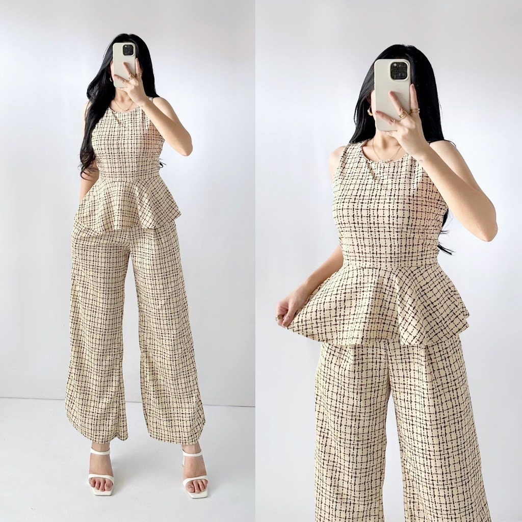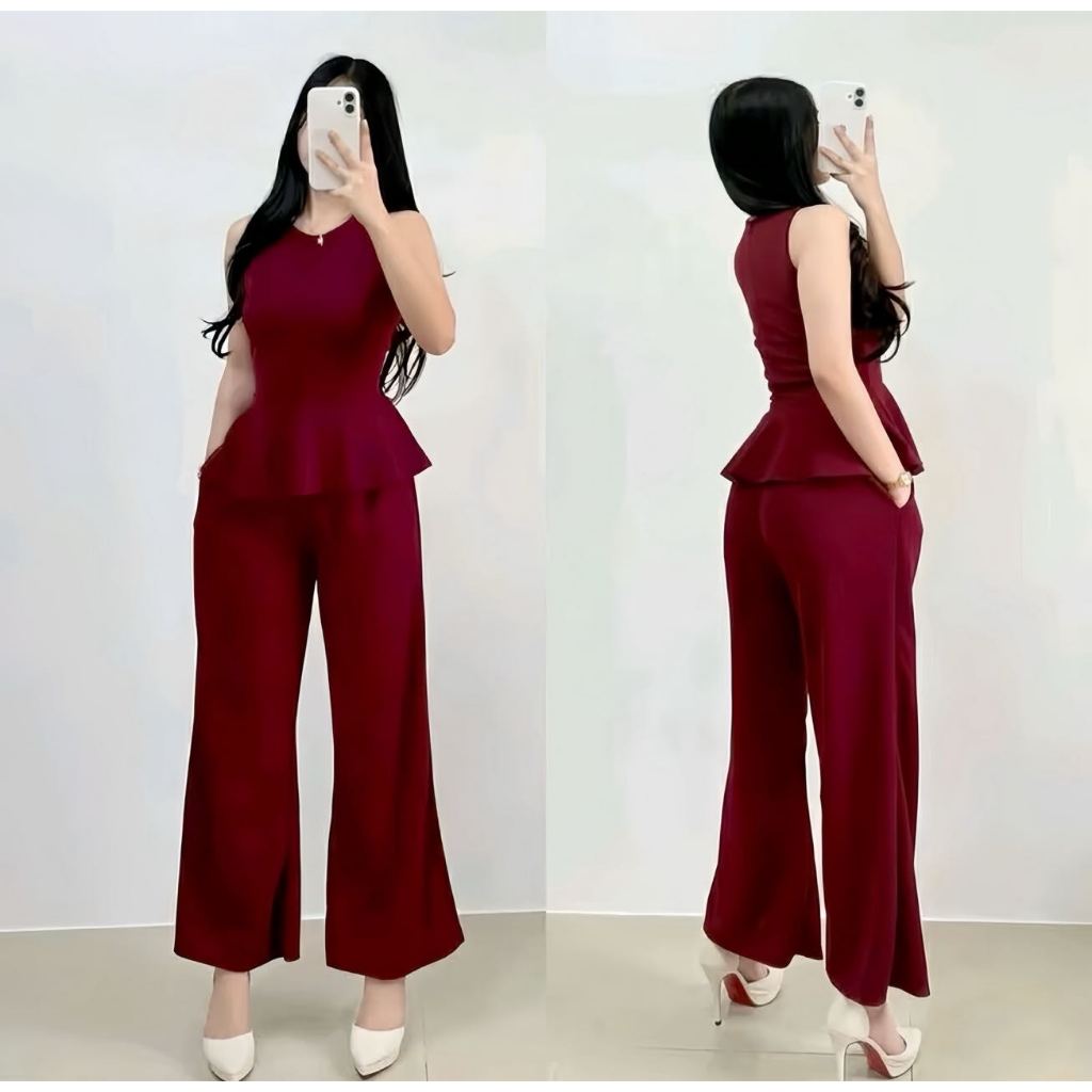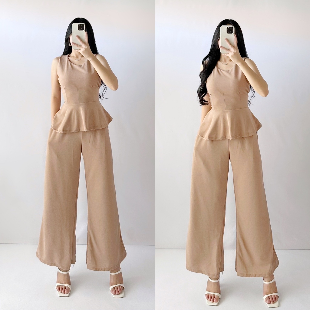 Vernice Print Casual Crepe Terno with Peplum Top & Wide Leg Pants for Women - Stylish Everyday Wear