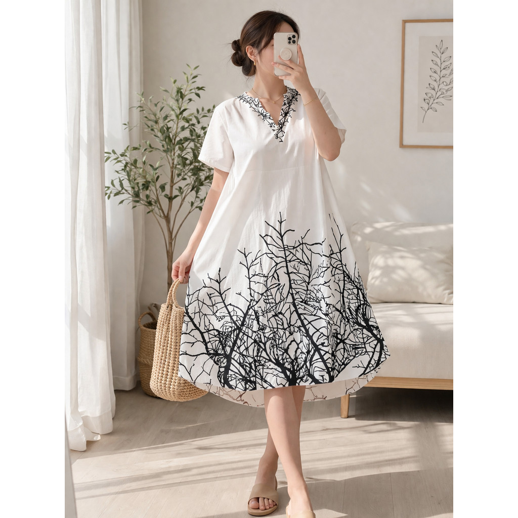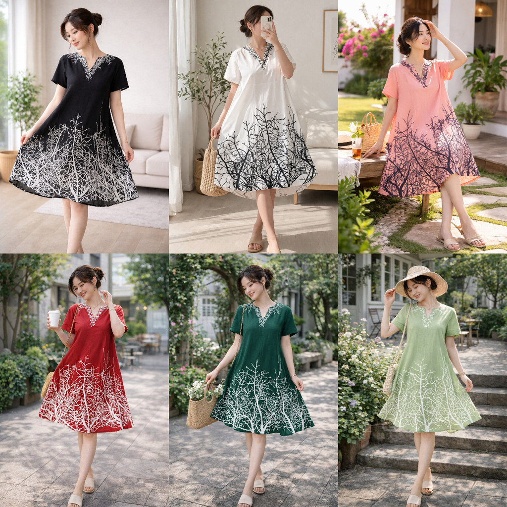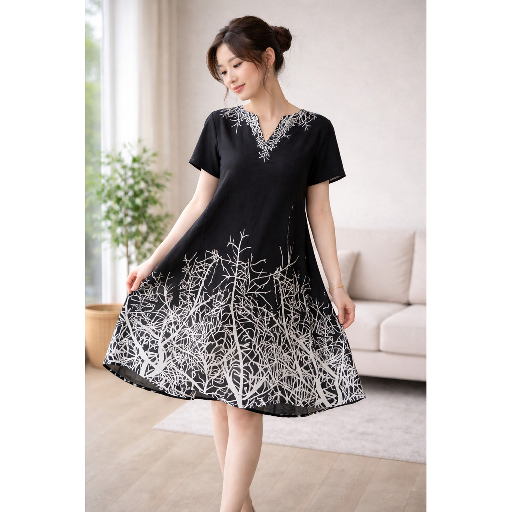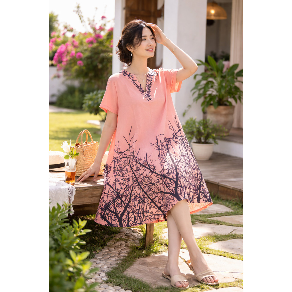 New Style Bangkok Printed V Neck Short Sleeve Women's Straight Dress Loose Relax Plus Size
