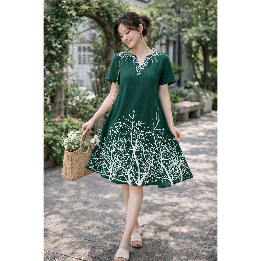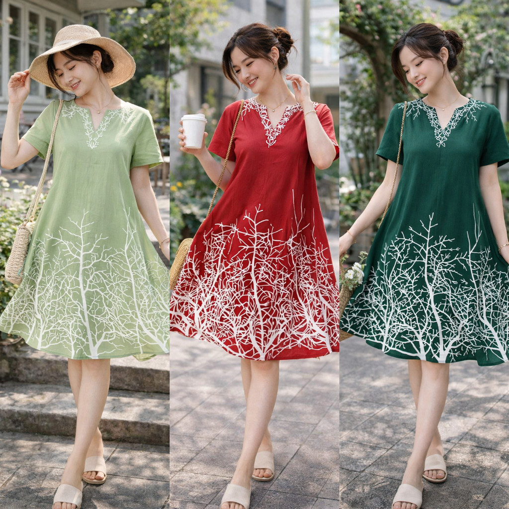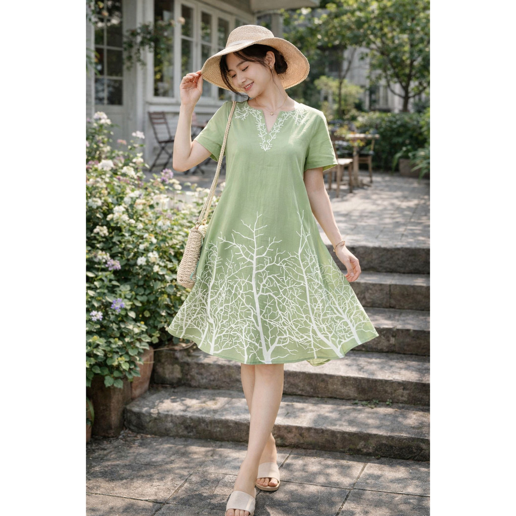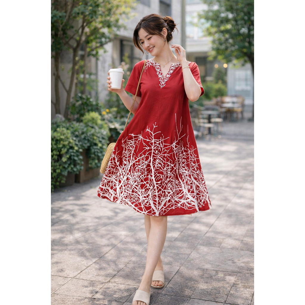 New Style Bangkok Printed V Neck Short Sleeve Women's Straight Dress Loose Relax Plus Size