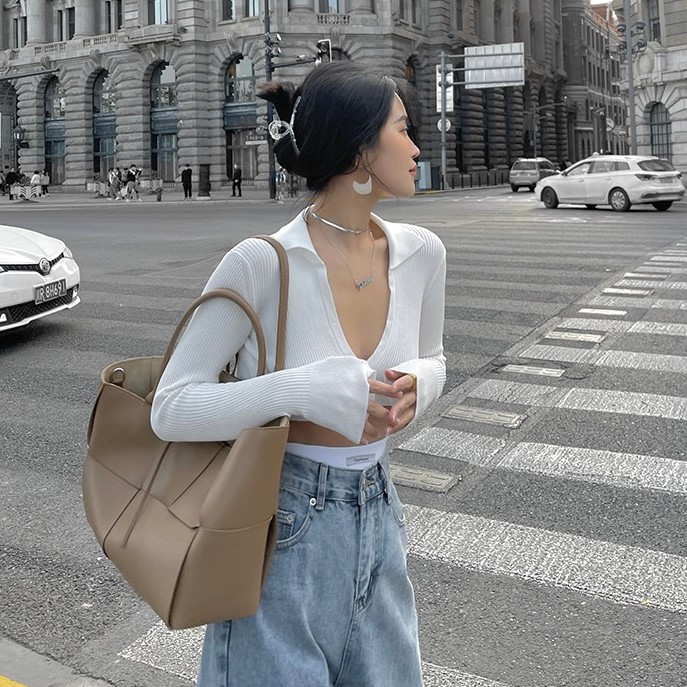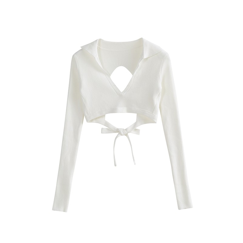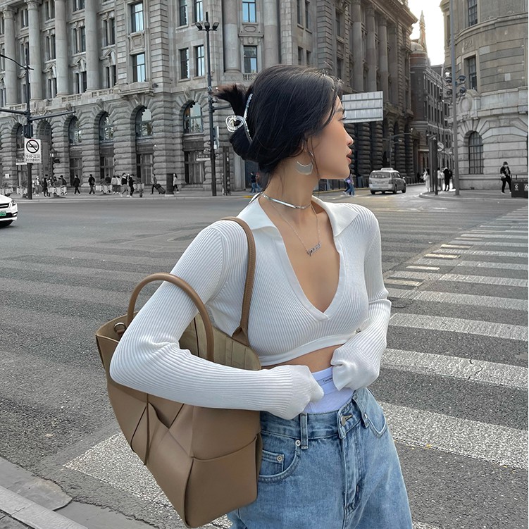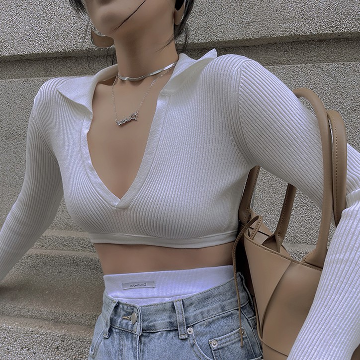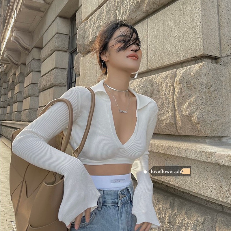 [Spot goods] Korean Ladies White V-neck Long Sleeve Knitted Shirt T-Shirt Top