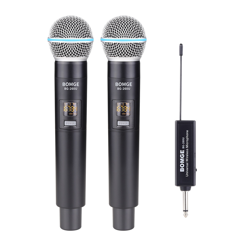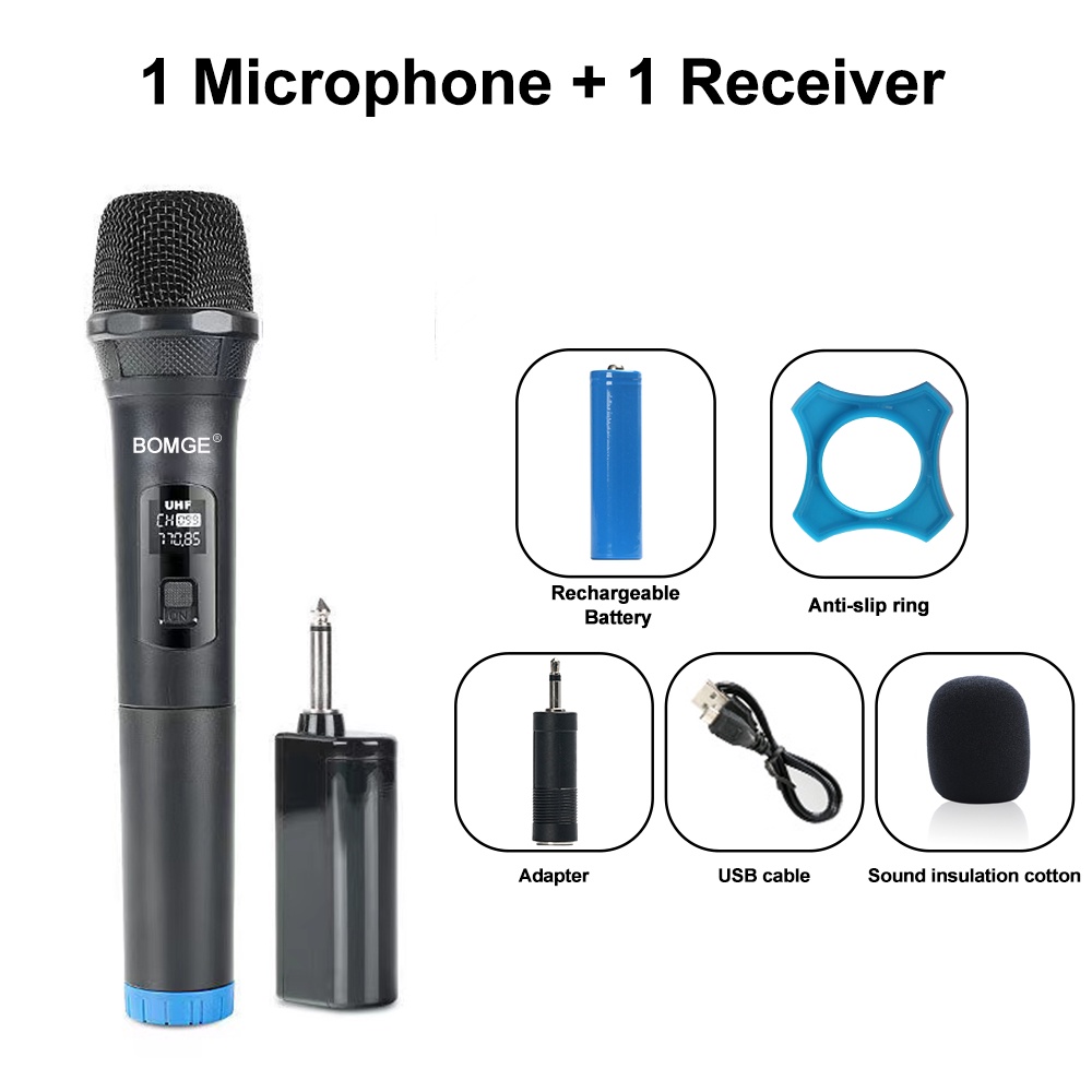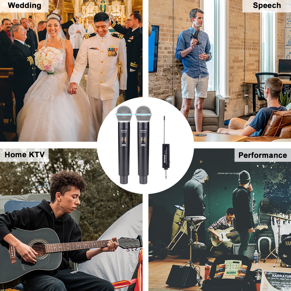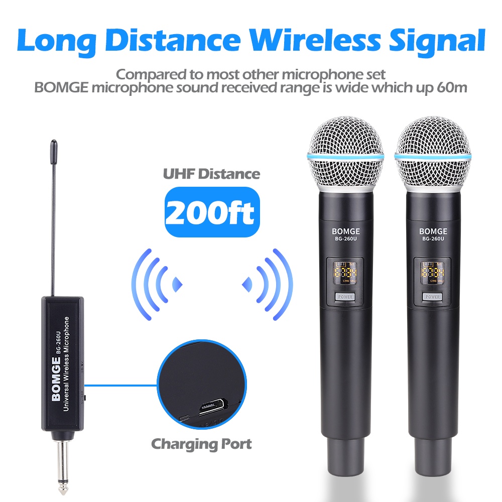 BOMGE UHF Dual Cordless Wireless Microphone System, 30 adjustable channels, with rechargeable receiver, suitable for karaoke singing, party, church, classroom use, 200 feet