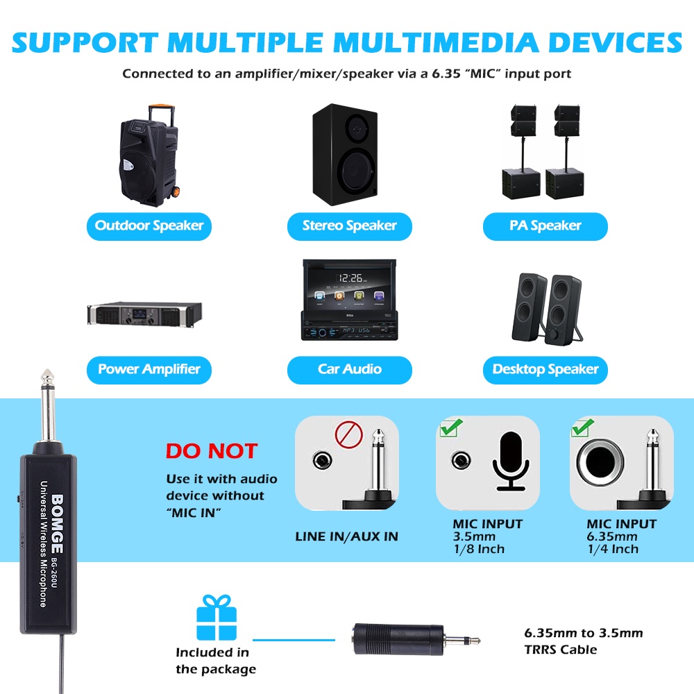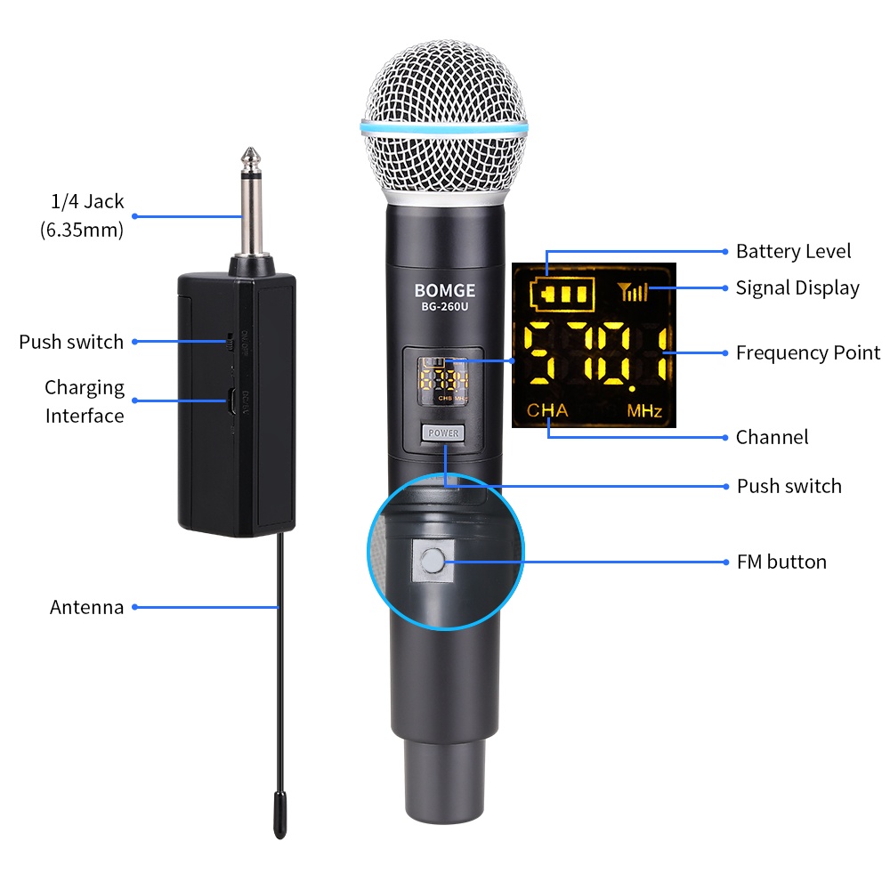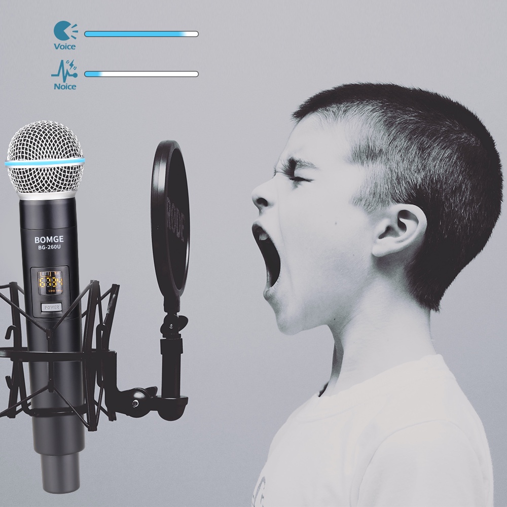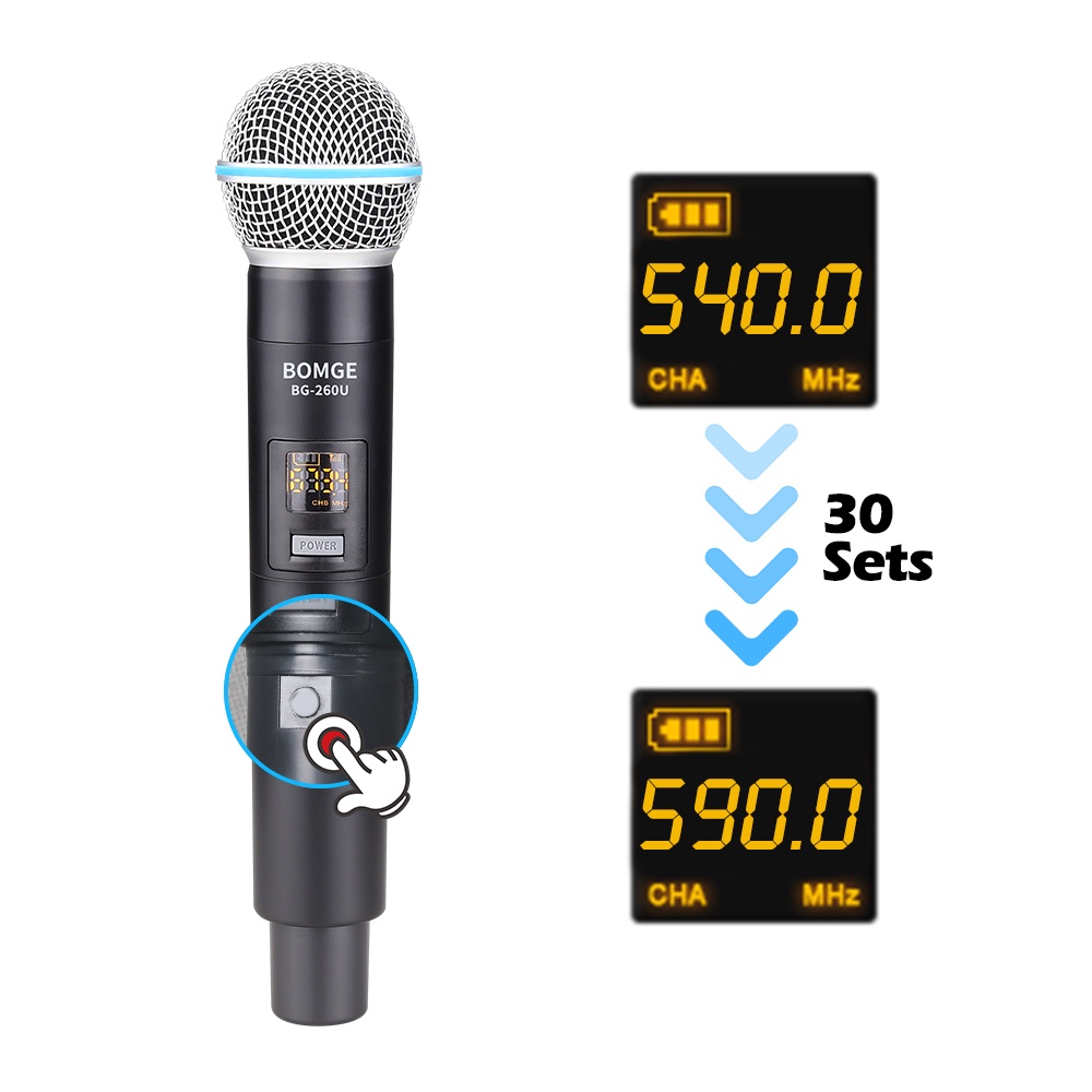 BOMGE UHF Dual Cordless Wireless Microphone System, 30 adjustable channels, with rechargeable receiver, suitable for karaoke singing, party, church, classroom use, 200 feet