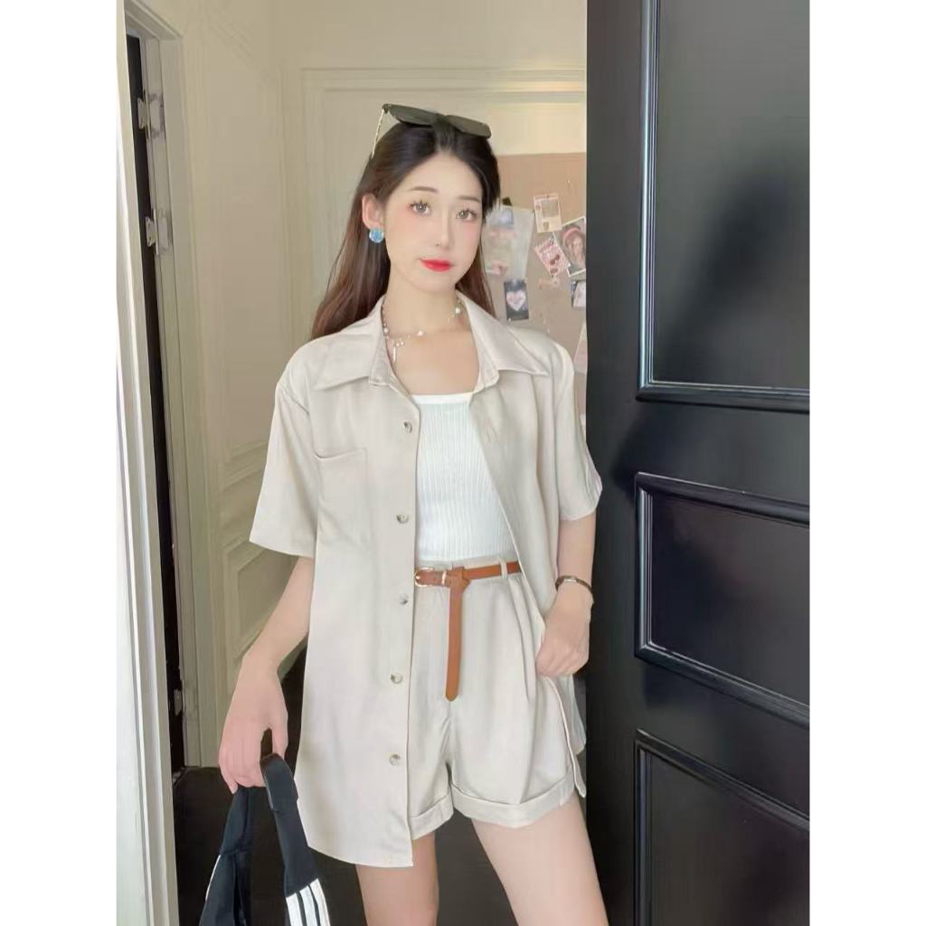 Miss Lucky BKK Embroidery Short Sleeve Shirt & Shorts Summer Coords Set (Free Belt) For Women 3338