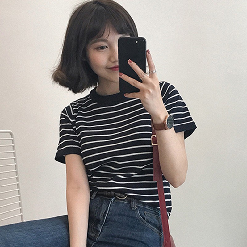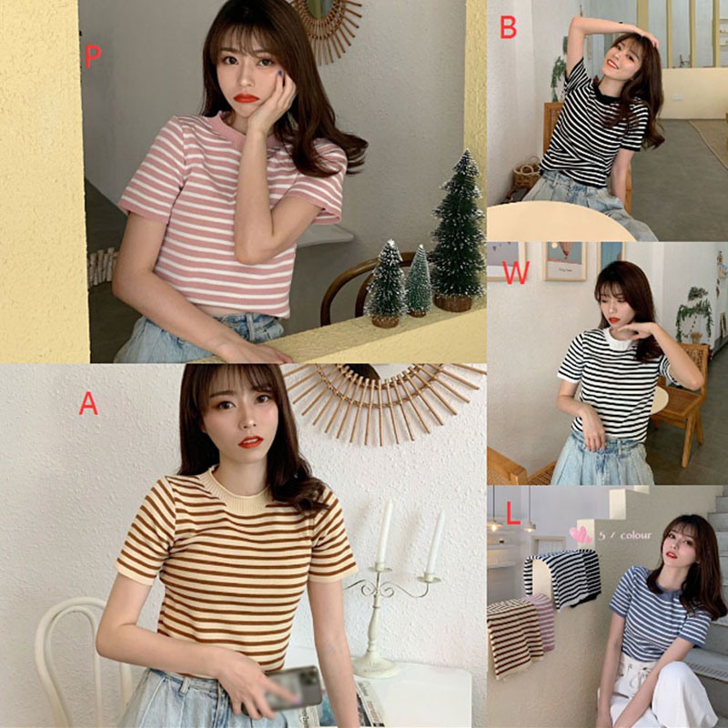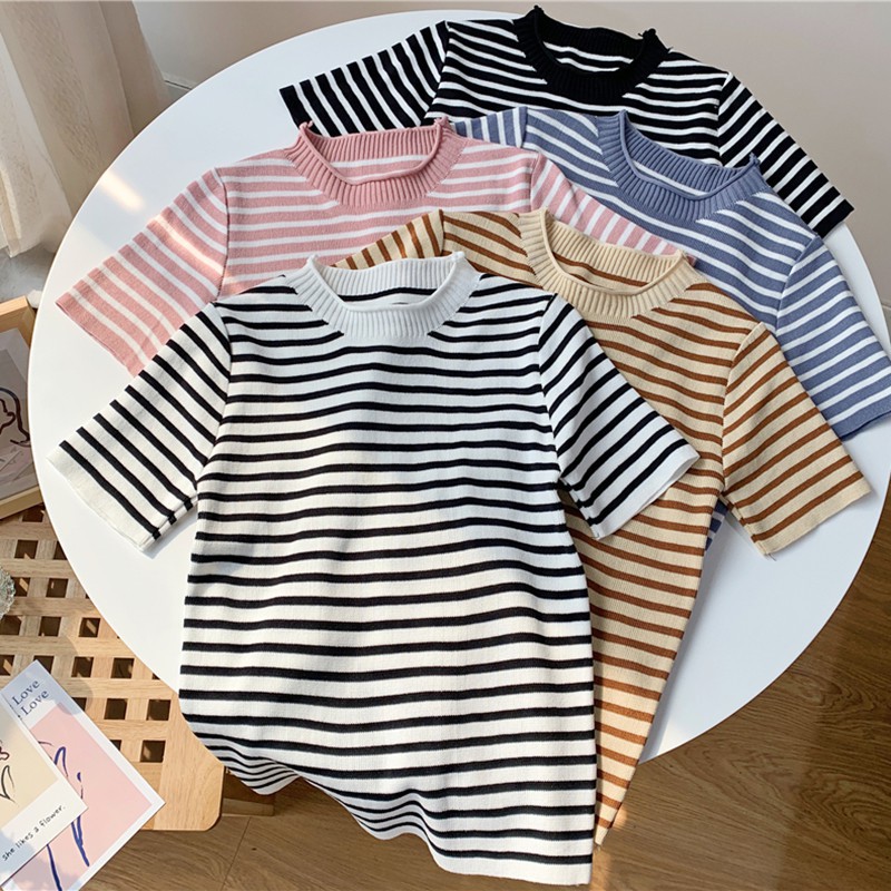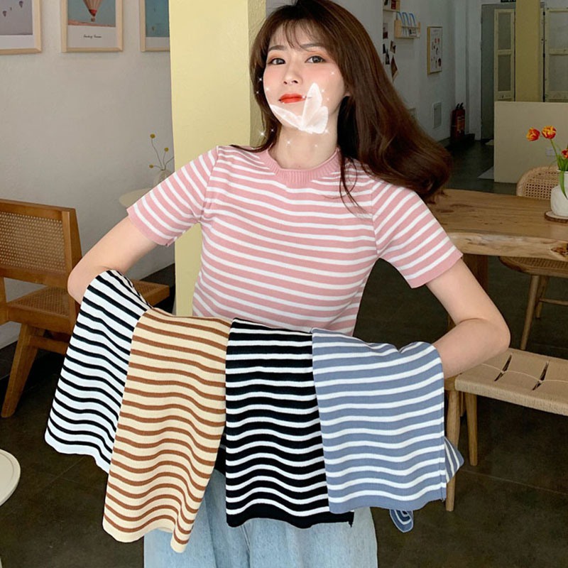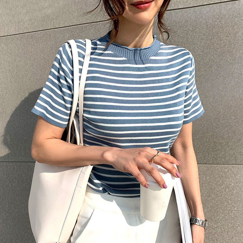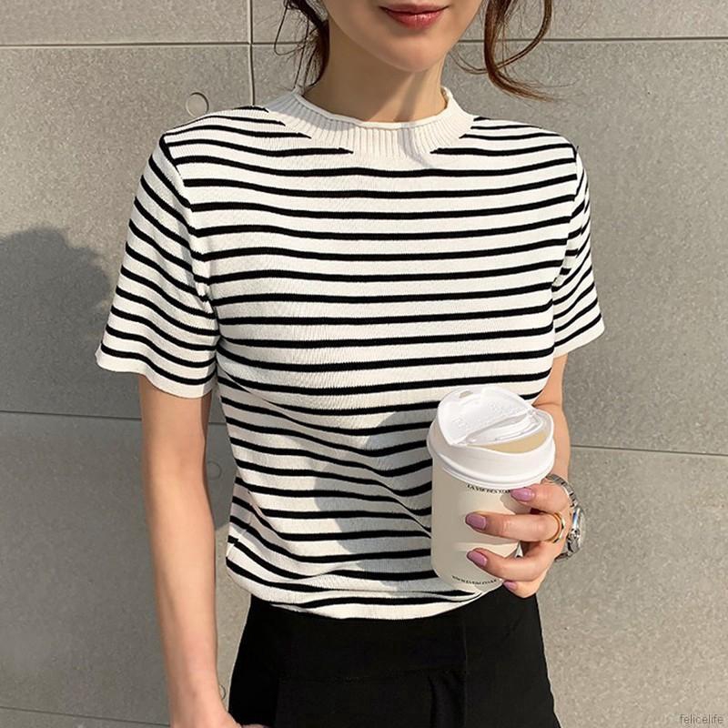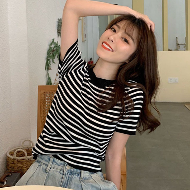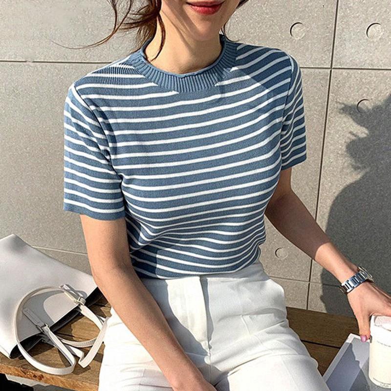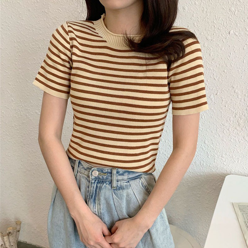 Women's Korean Style Casual O Neck Striped Short Sleeve Slim Knitted T-Shirt