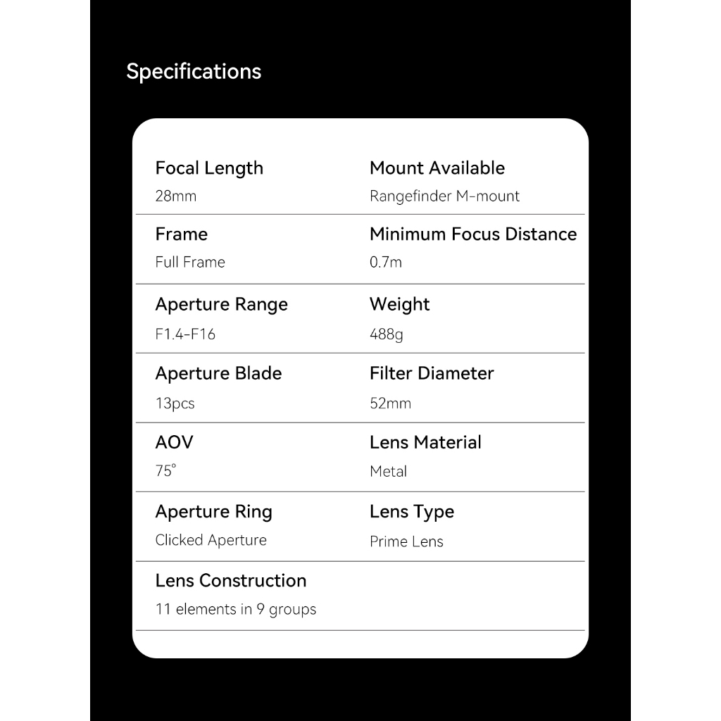 7Artisans 28mm f1.4 Manual Focus Lens for Leica M Mount