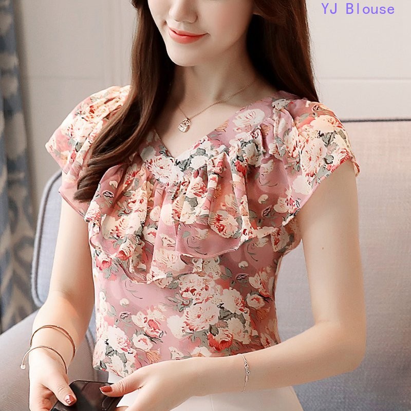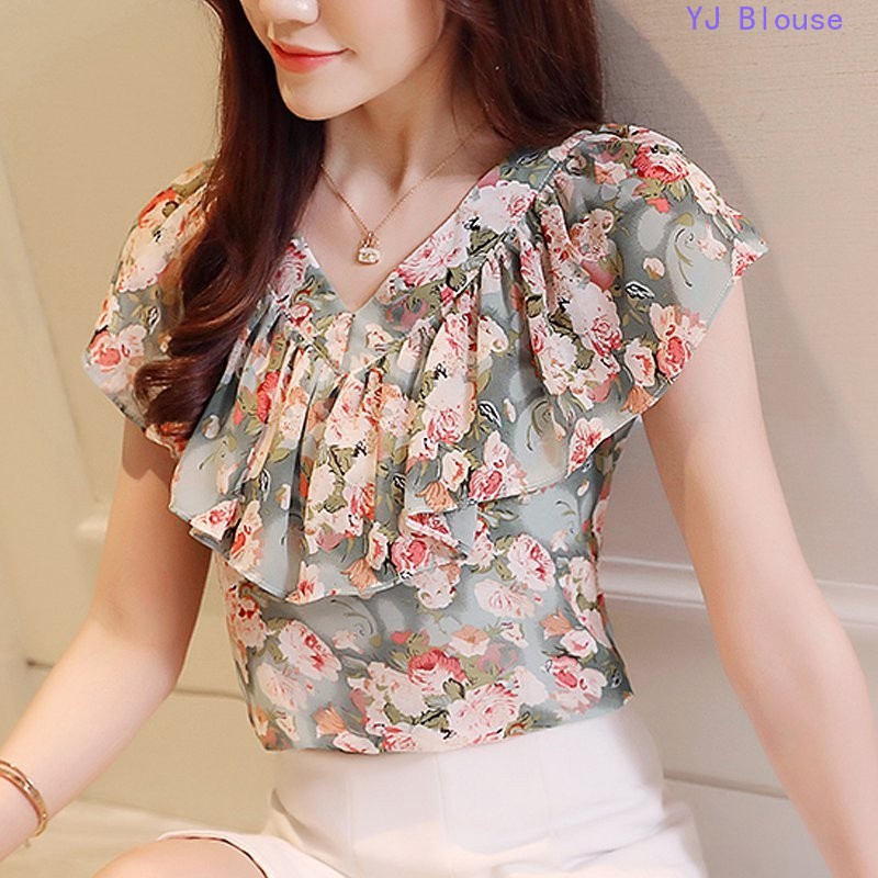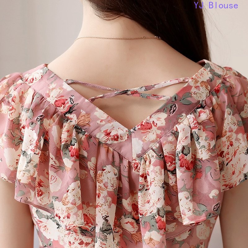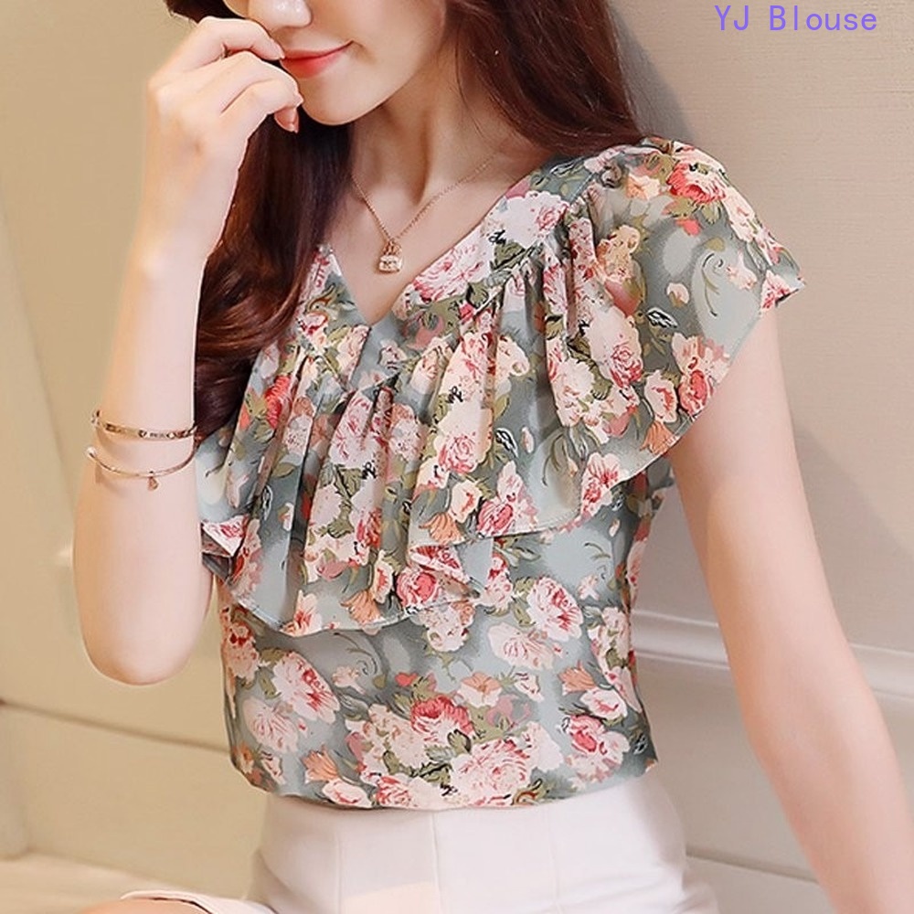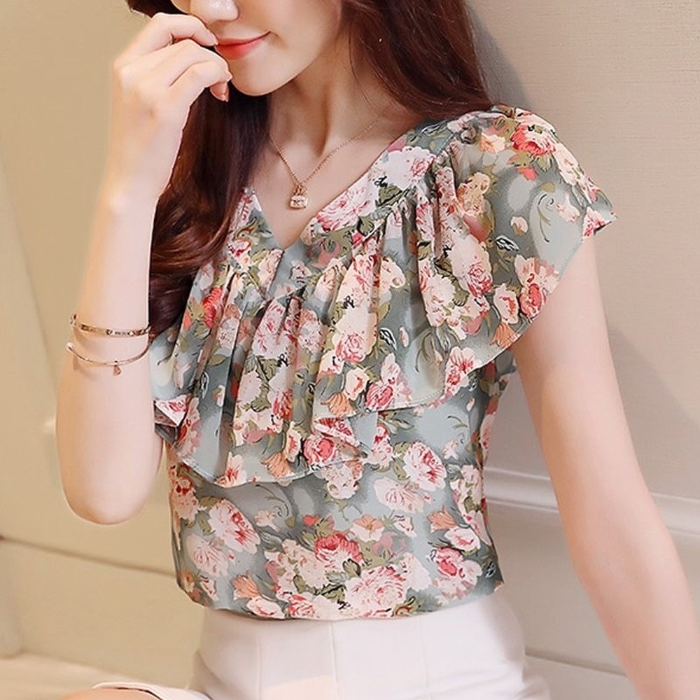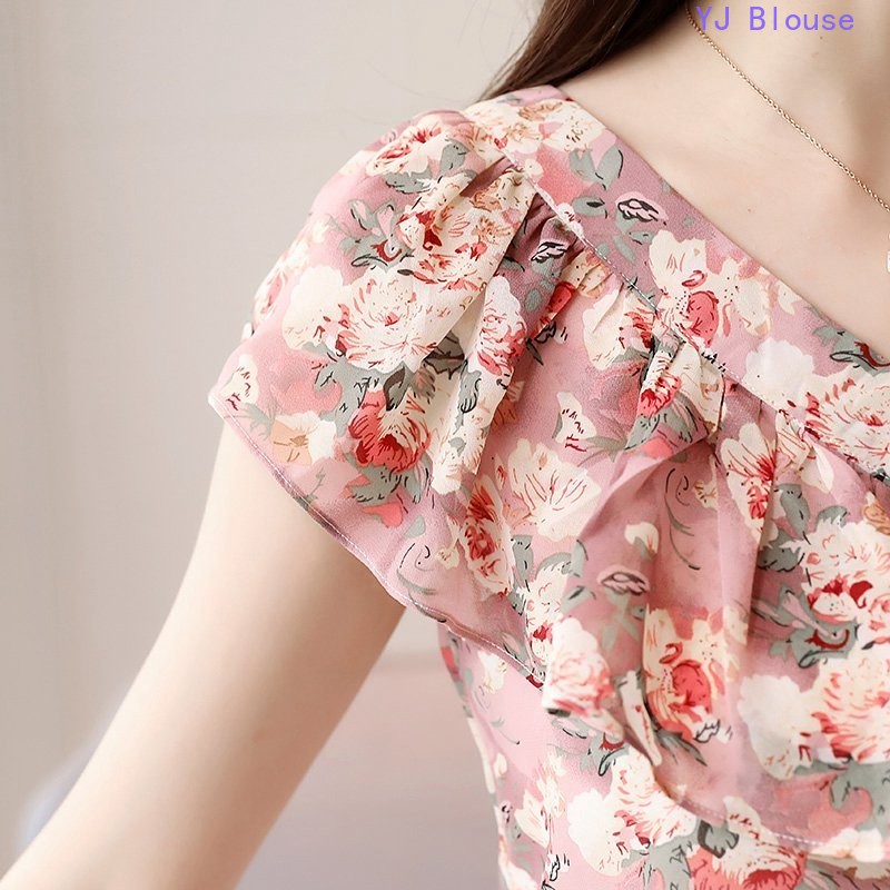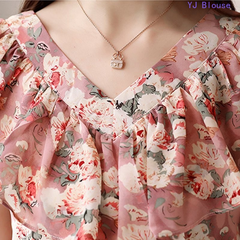 Chiffon Blouse Plus Size Women's Summer Korean Style Floral Printed V-Neck Blouse Tops