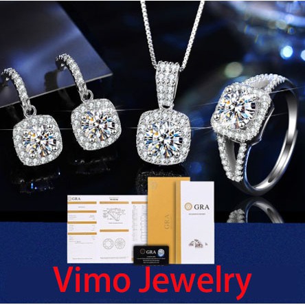 [With GRA certificate] One carat Mozanstone s925 sterling silver ring earring necklace wedding gift three-piece set