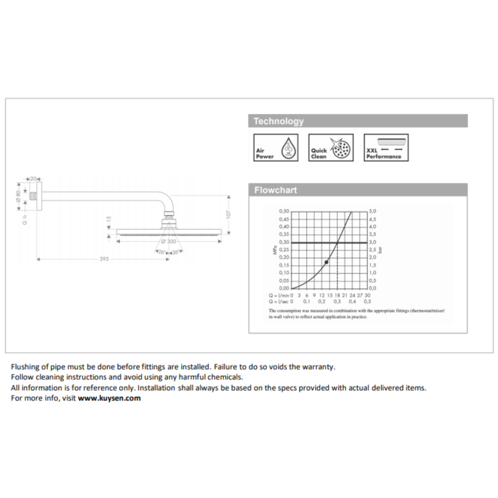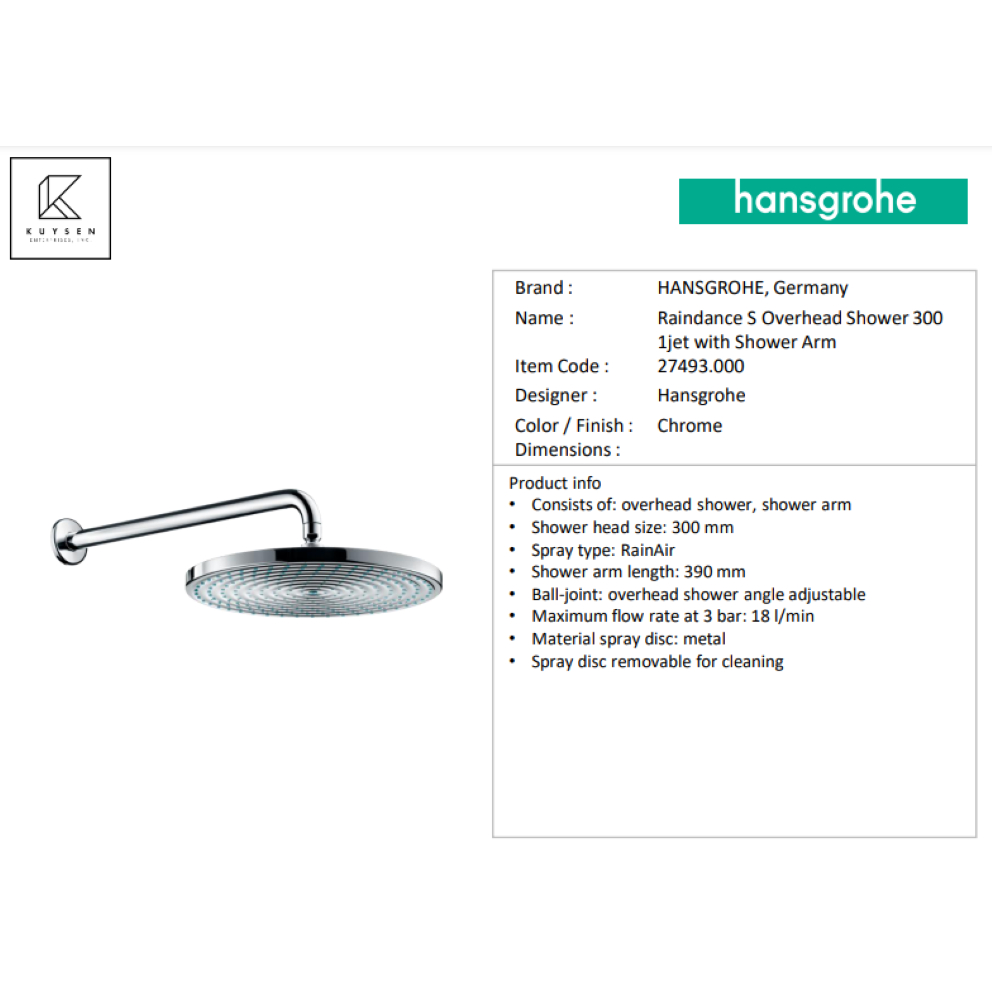 Hansgrohe Raindance S300 Air 1jet overhead shower with wall arm by Kuysen