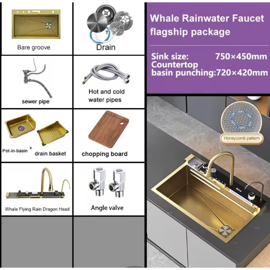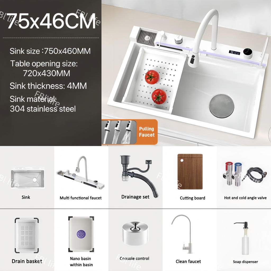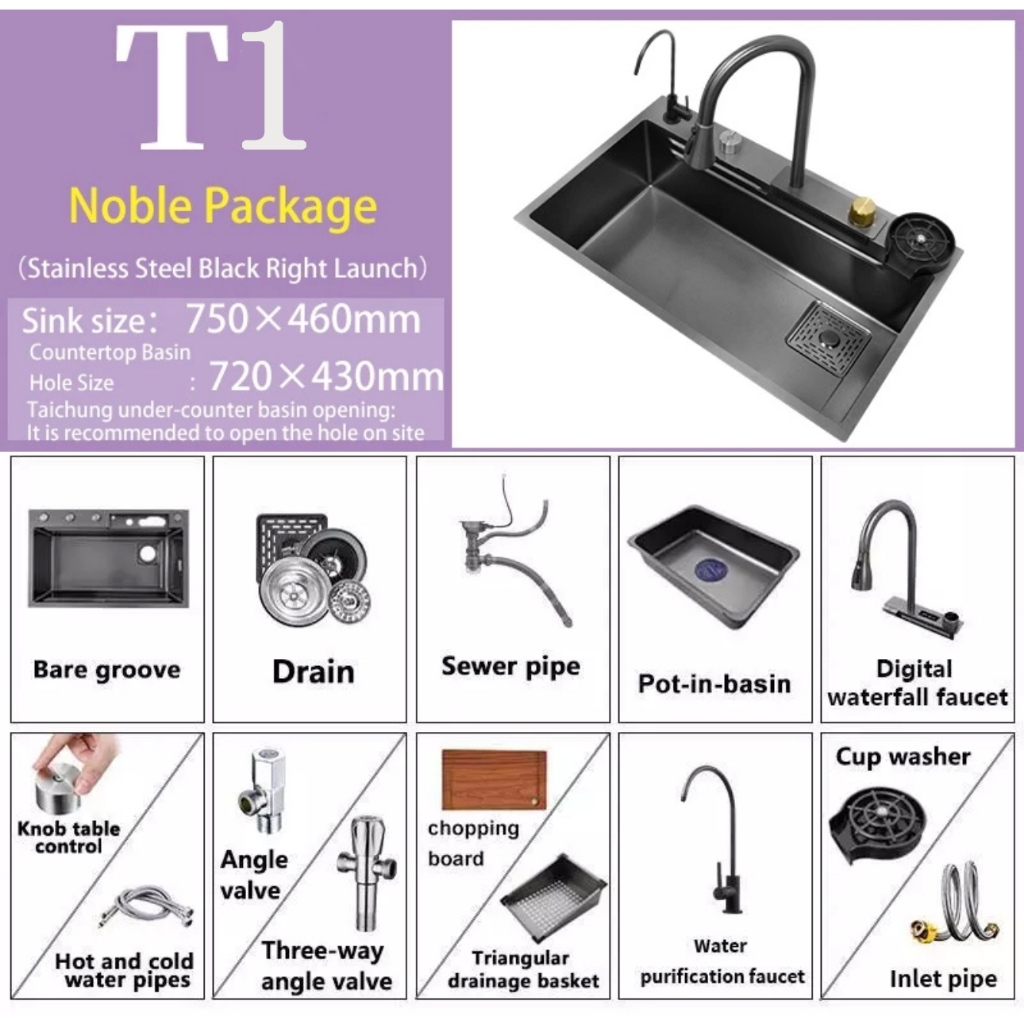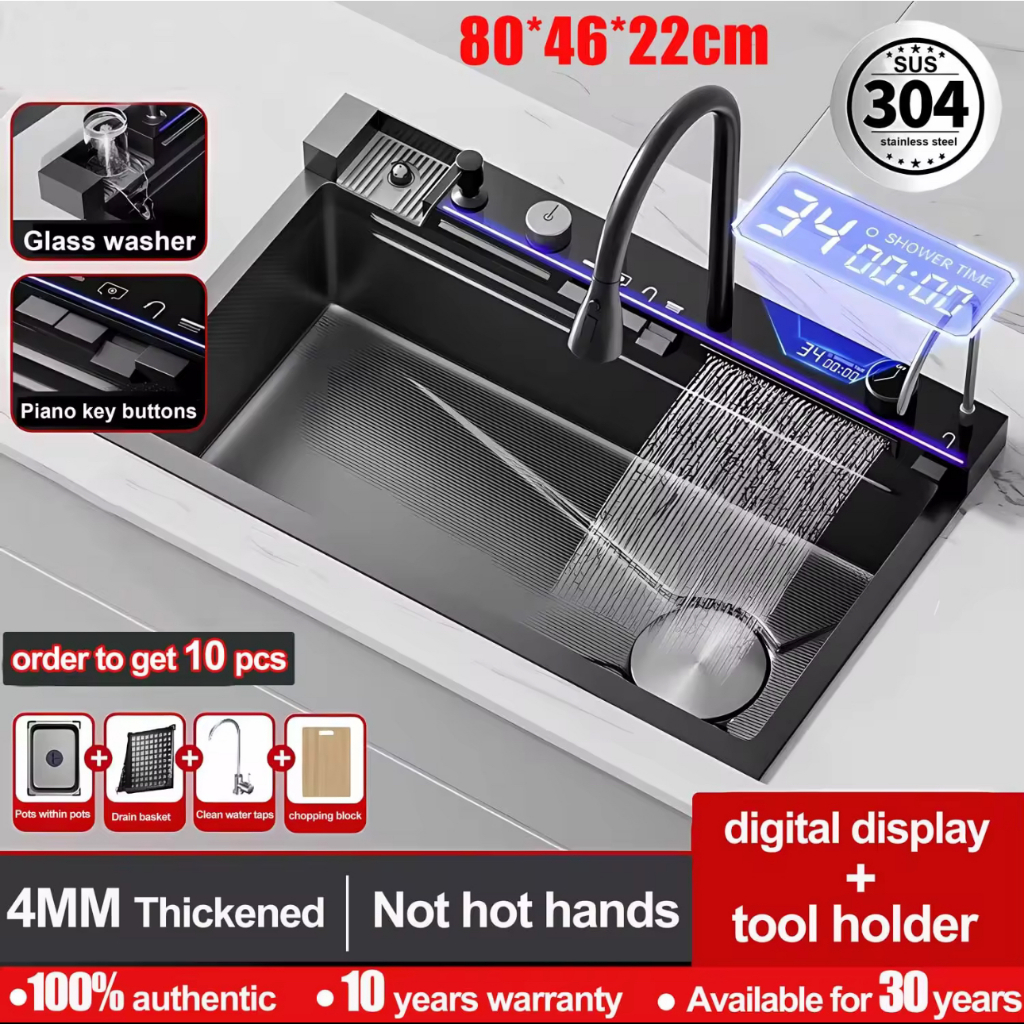 Stainless Steel Lababo Kitchen Sink Smart Digital Display Multifunctional Waterfall Sink Faucet Set