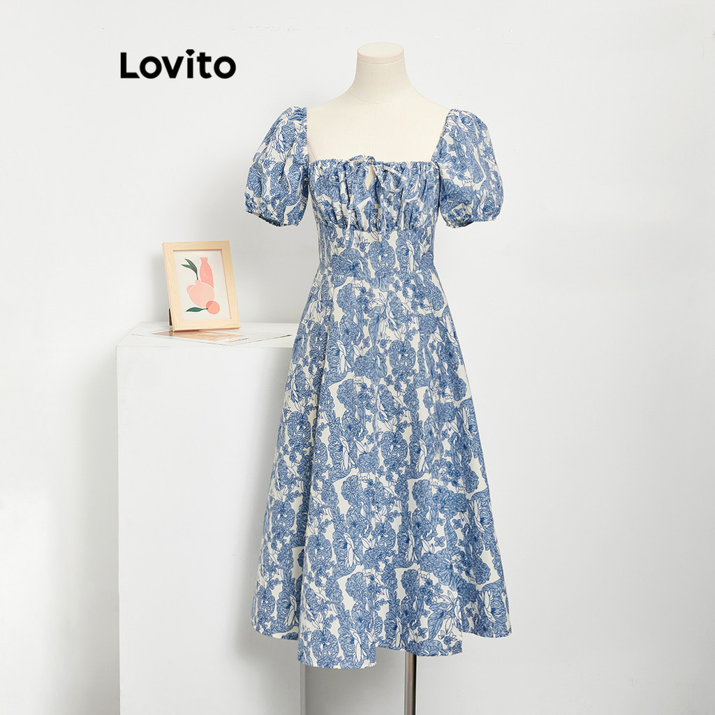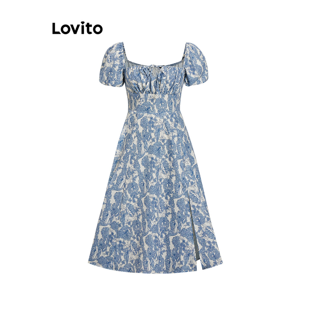 Lovito Party Dress Ditsy Floral Pleated Lace Up Puff Sleeve Split Dress for Women L77ED275 (Multicolor)