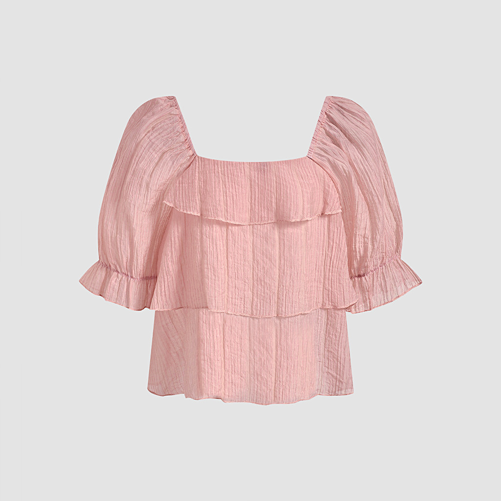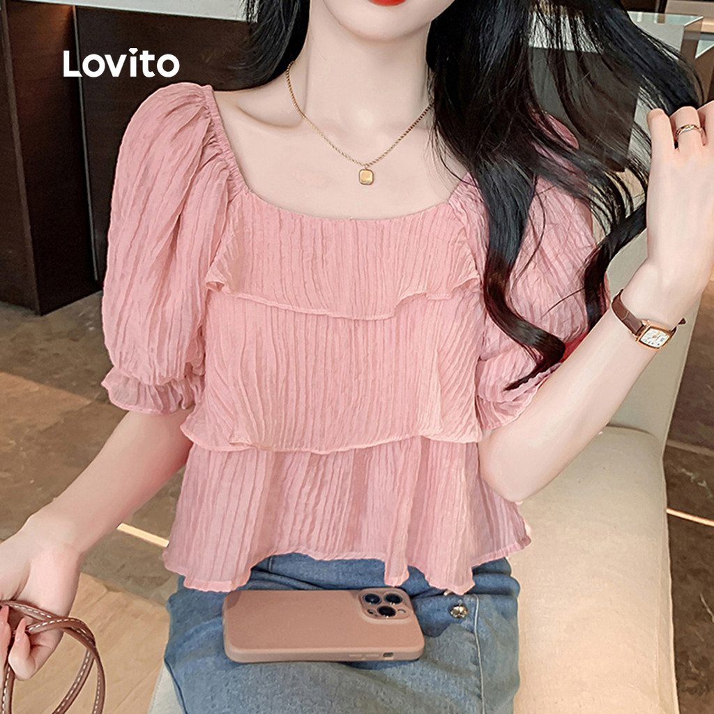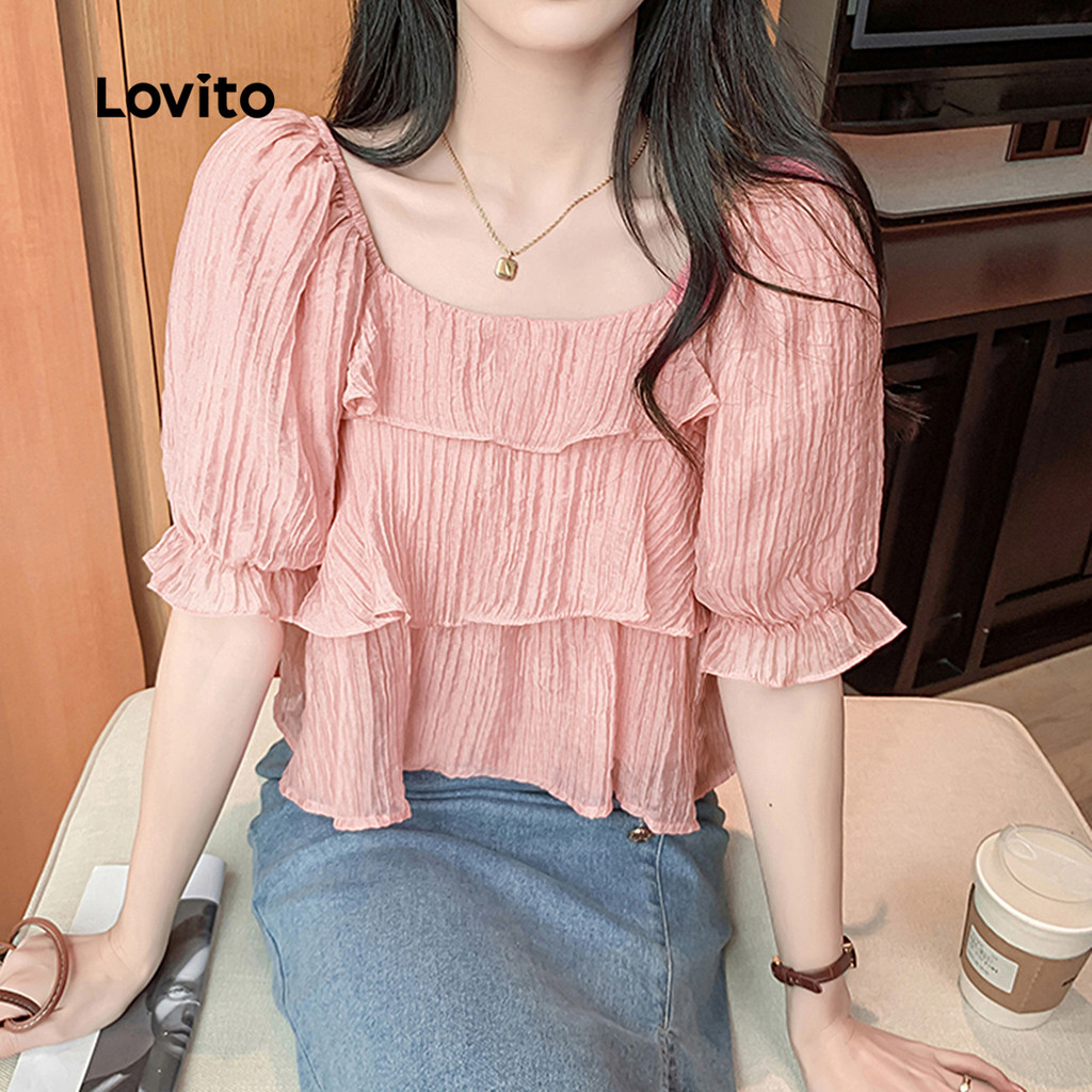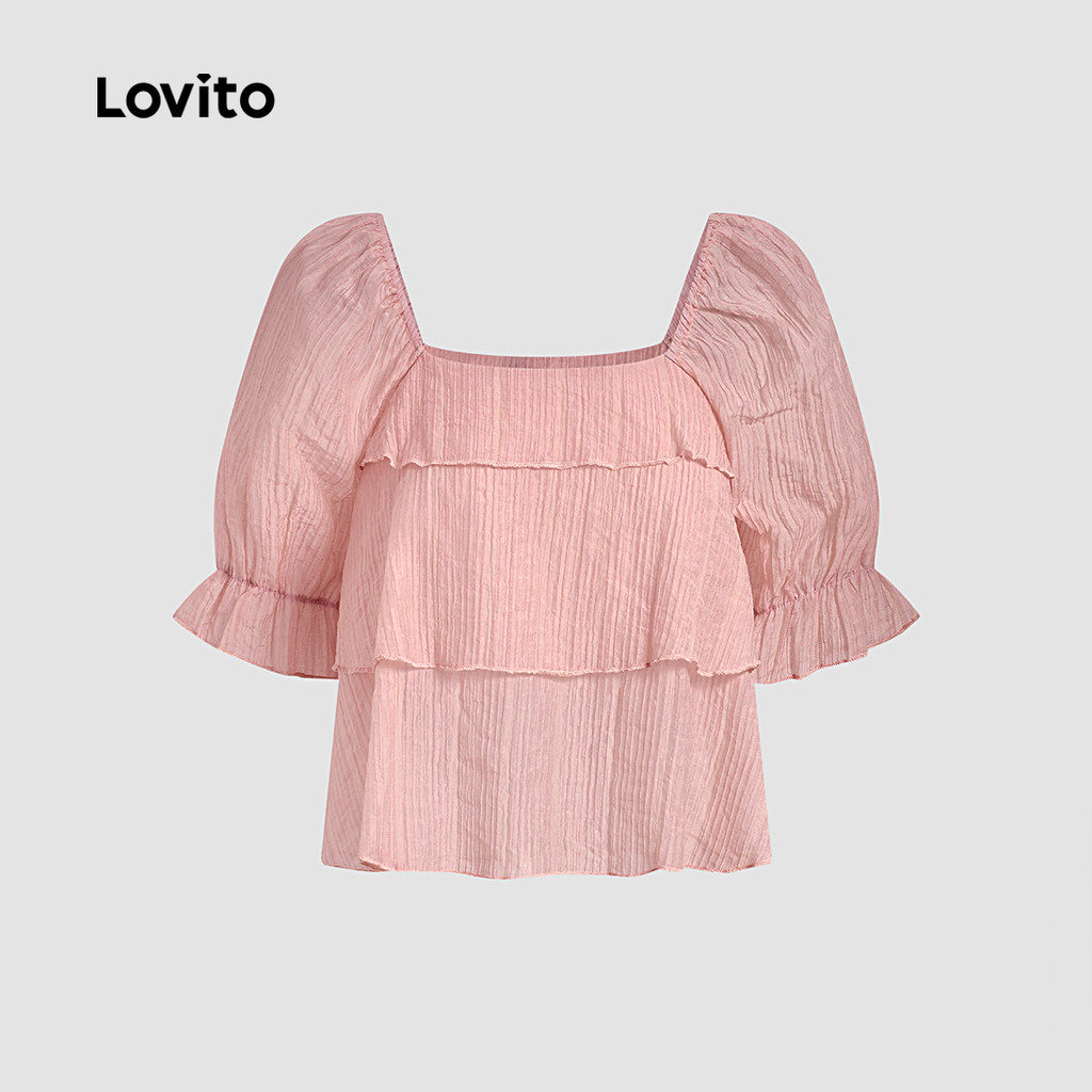 Lovito Women Casual Blouse Tiered Layer Jacquard Ruffle Spring/summer Pink Blouse L142ED090