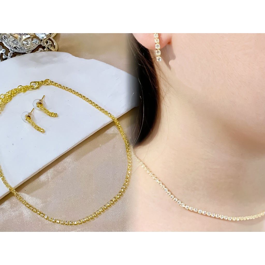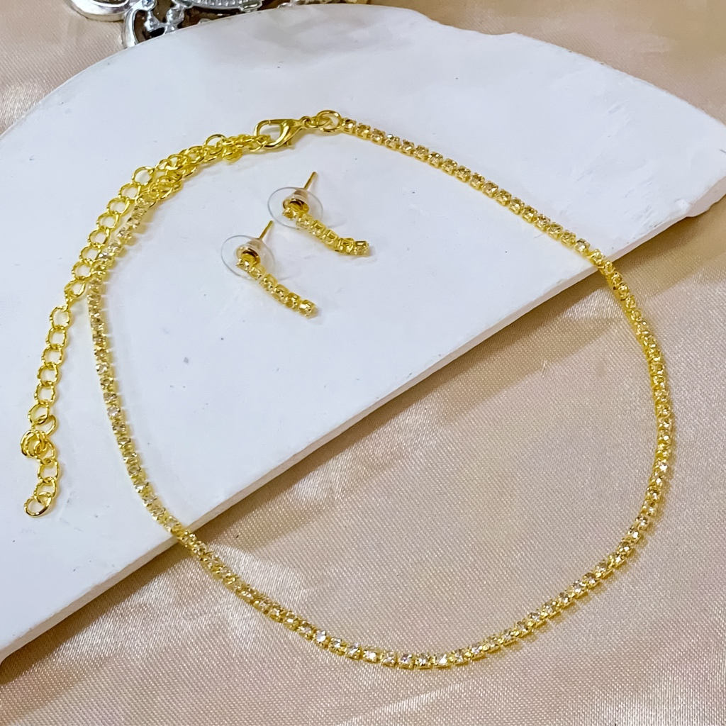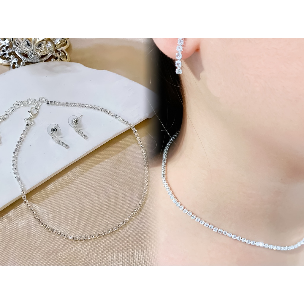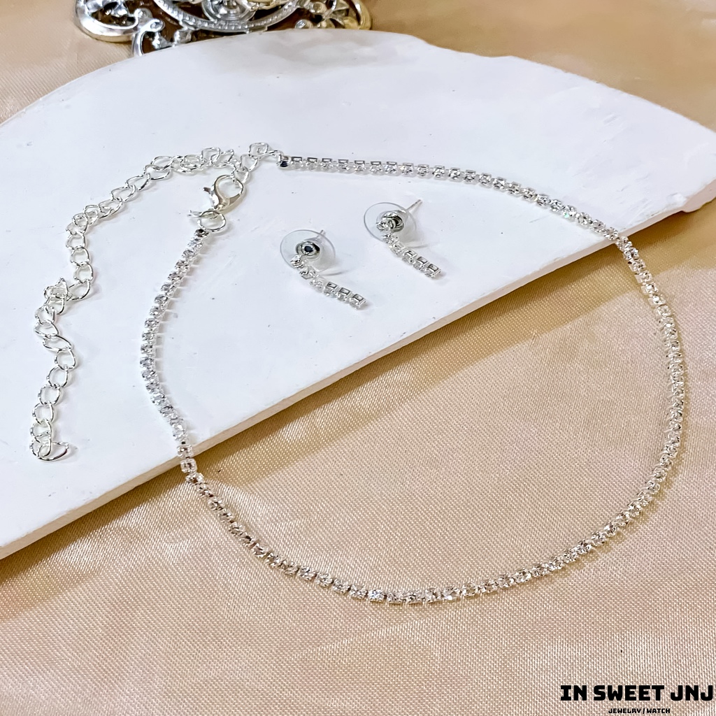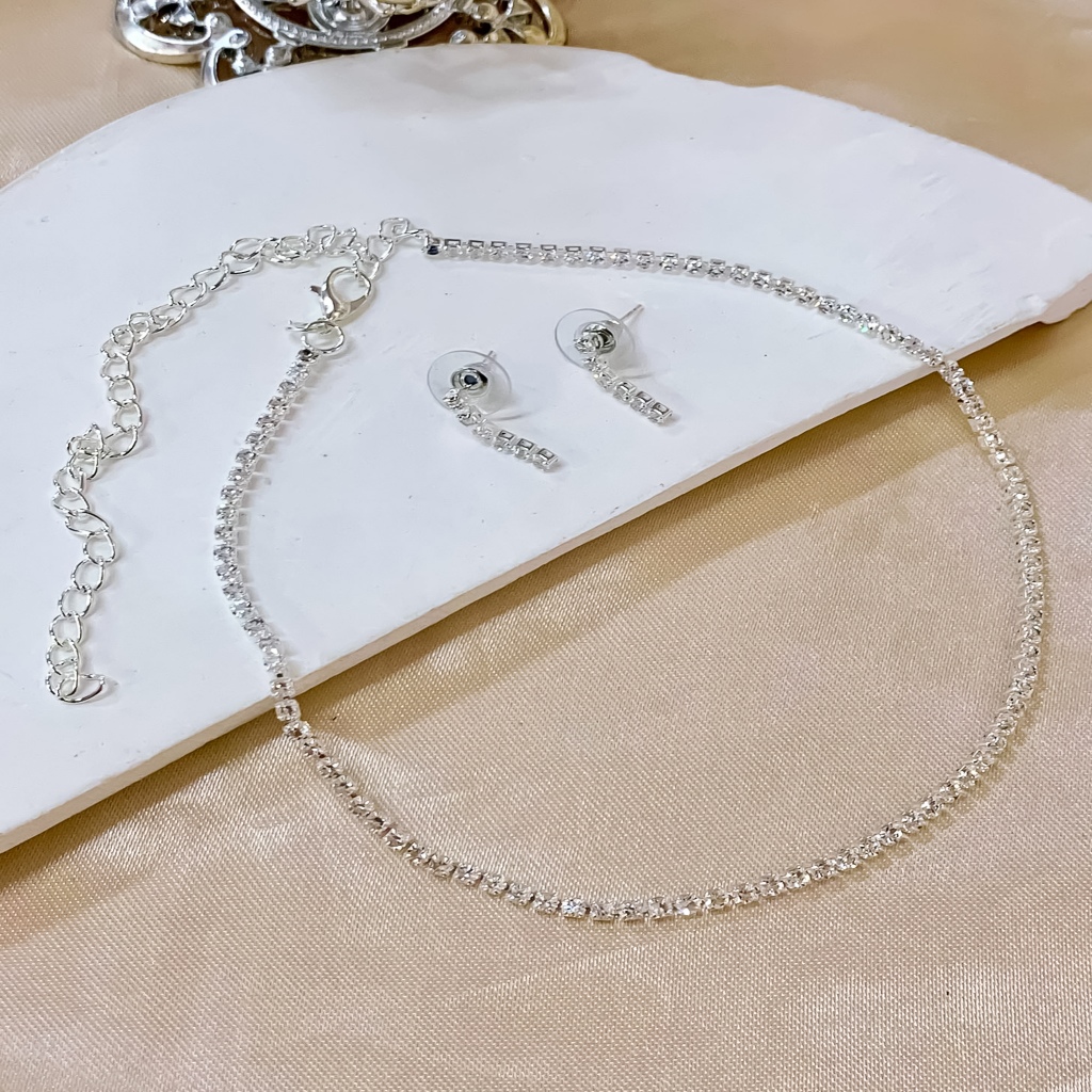 Silver Zircon Set Kwintas Hikaw Stainless Steel Adjustable Pang Araw-Araw na Alahas Pambabae