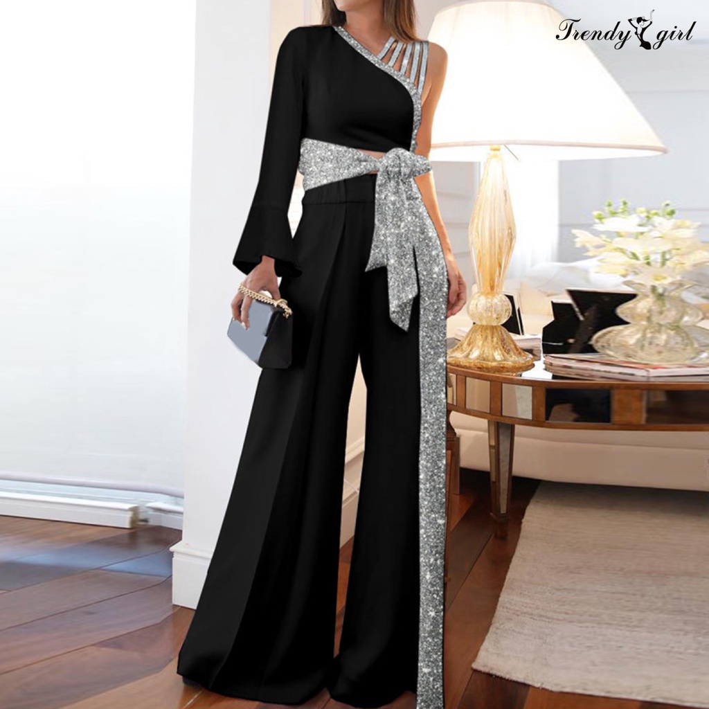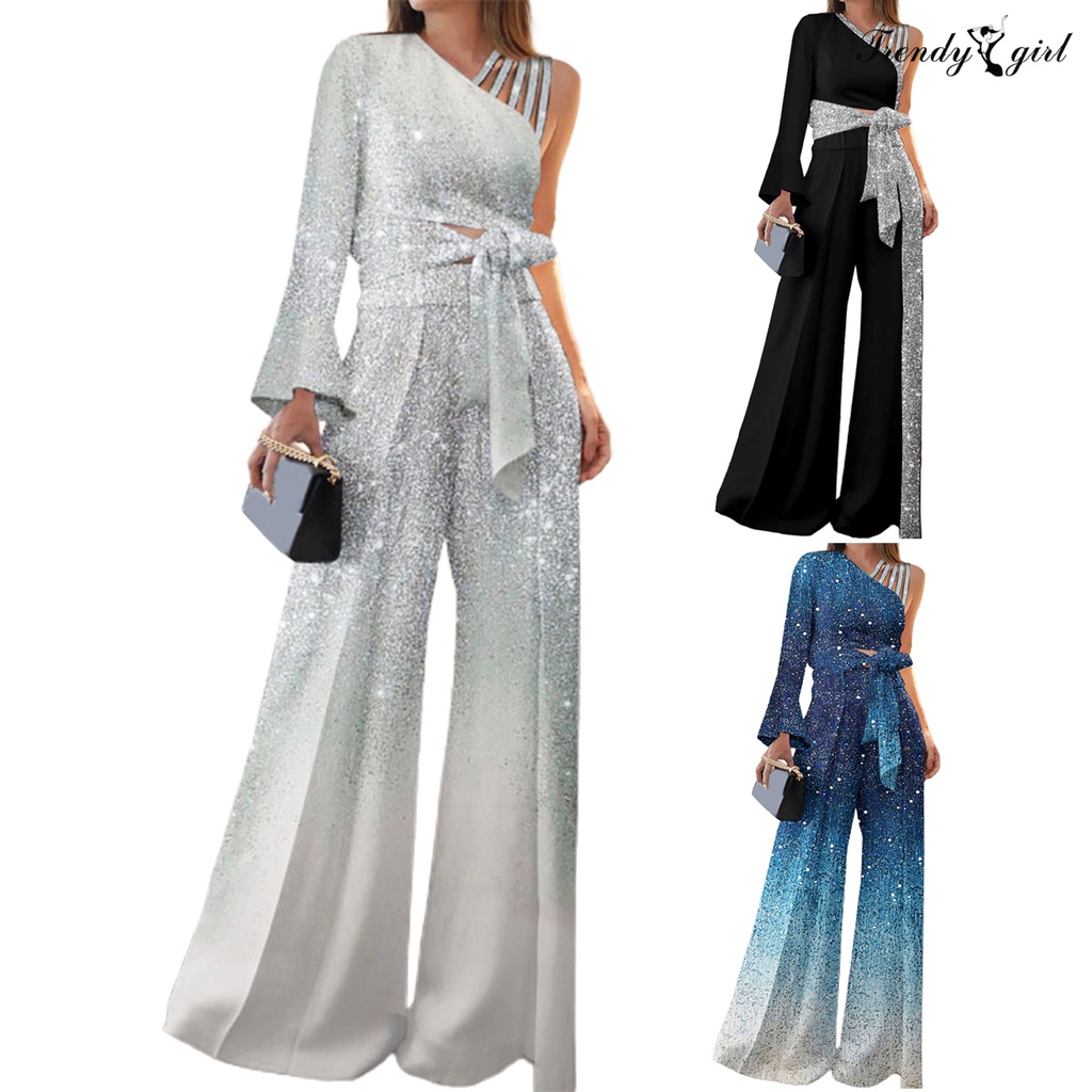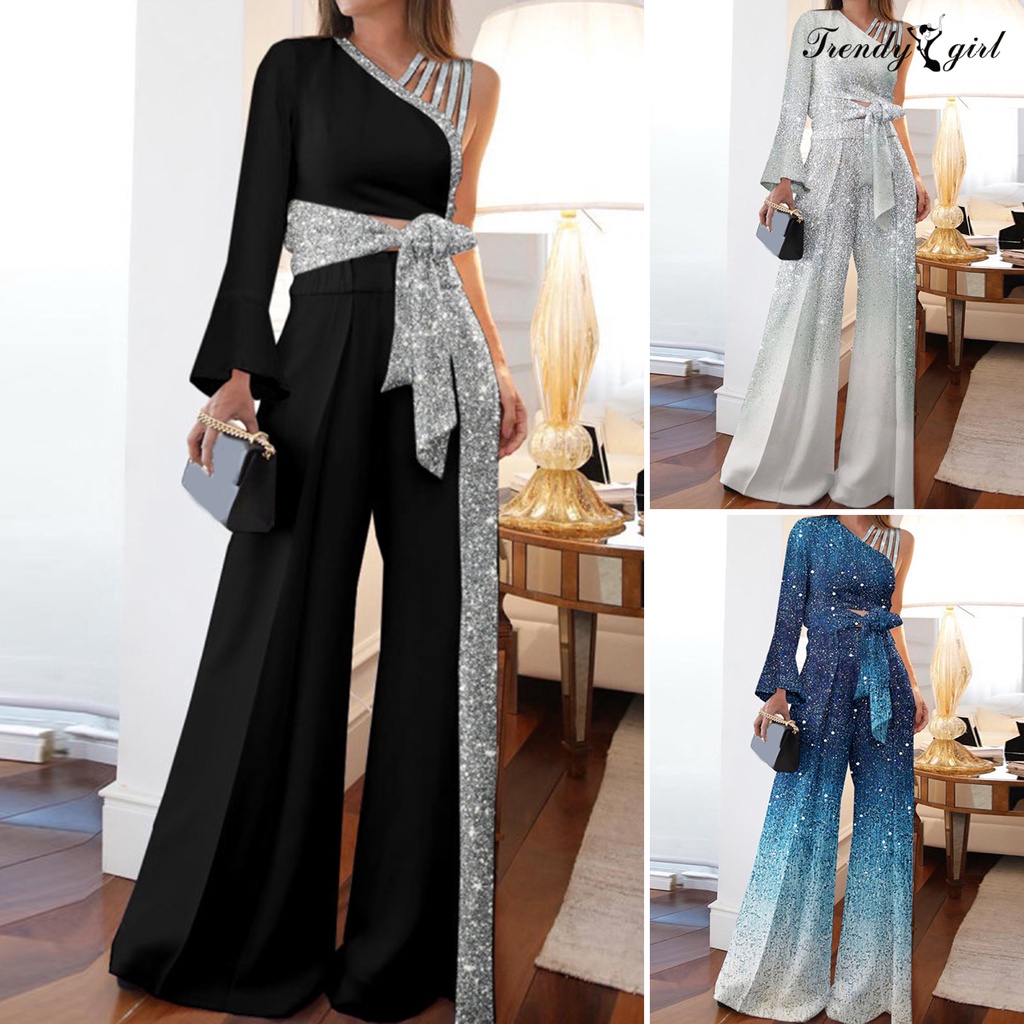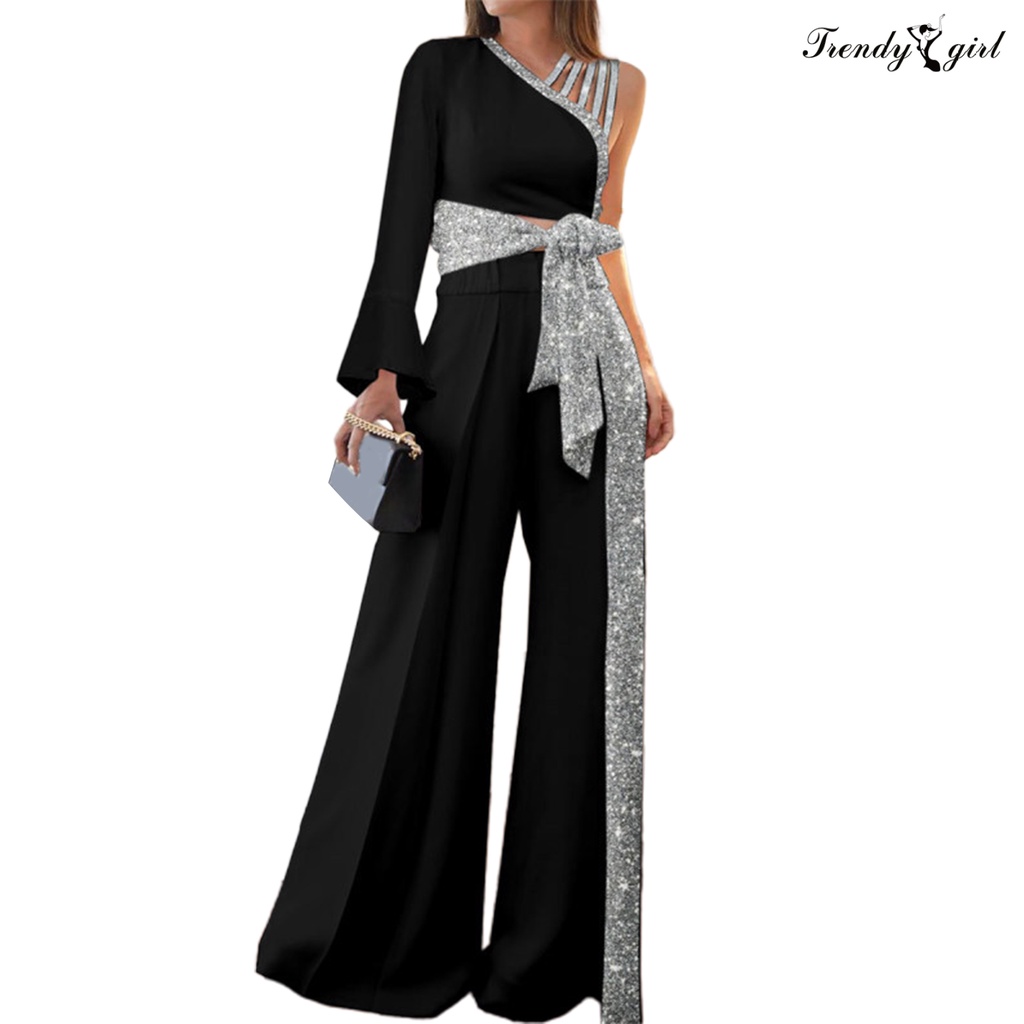 [TDG]2Pcs/Set Women Outfit Bandage Bowknot High Waist Wide Leg One Shoulder Top Patchwork Shiny Pants Set Streetwear
