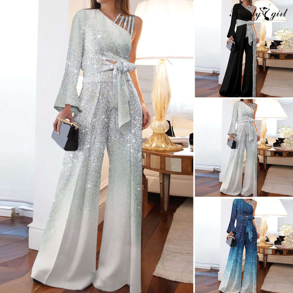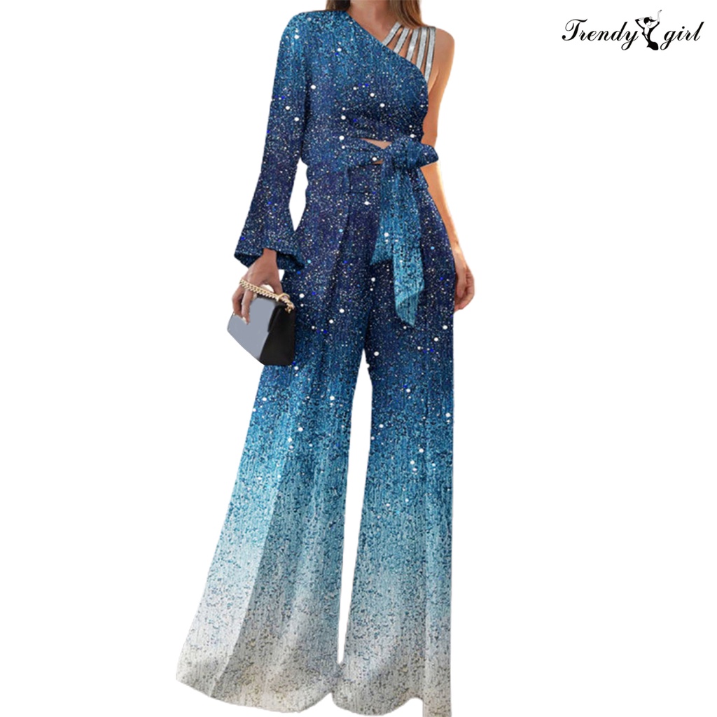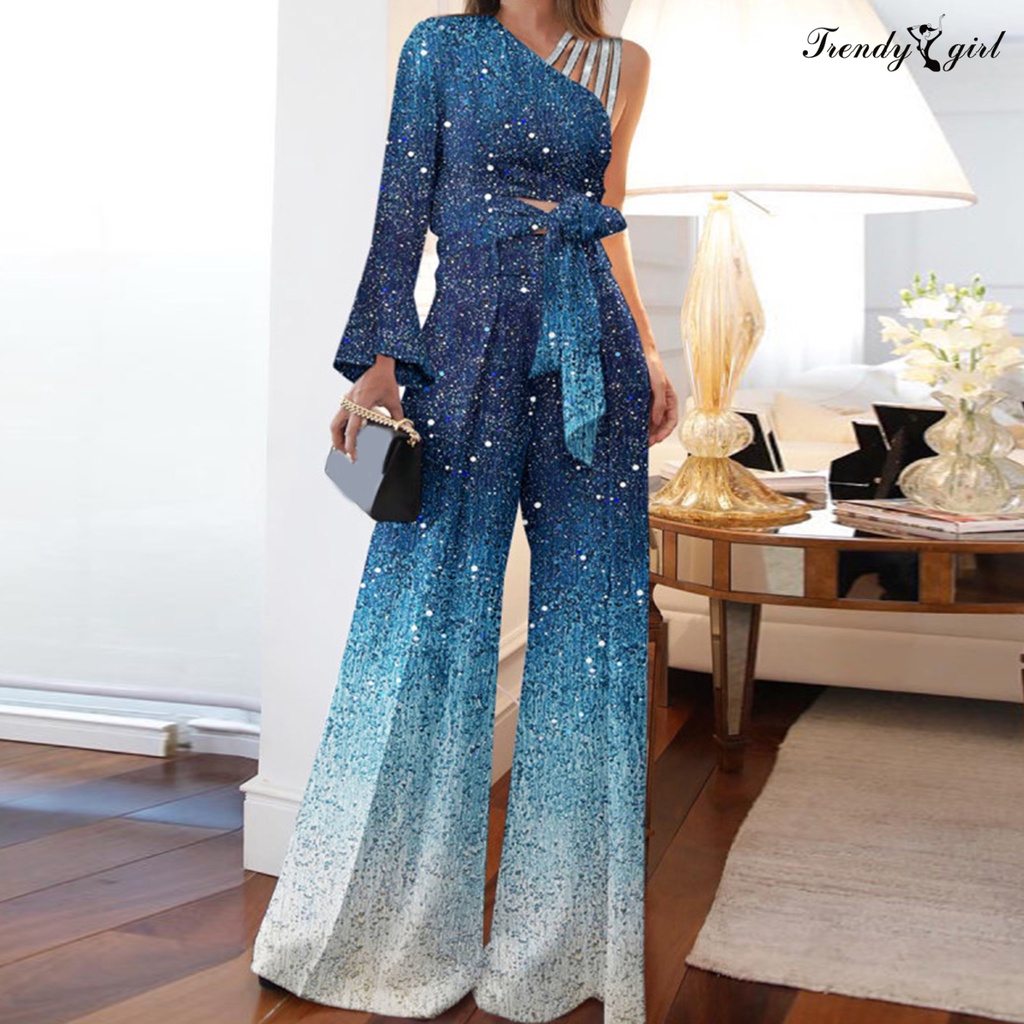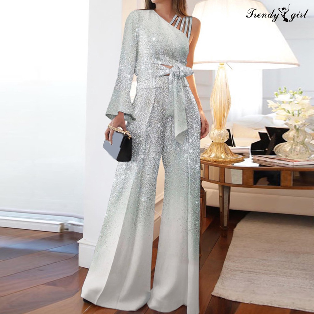 [TDG]2Pcs/Set Women Outfit Bandage Bowknot High Waist Wide Leg One Shoulder Top Patchwork Shiny Pants Set Streetwear