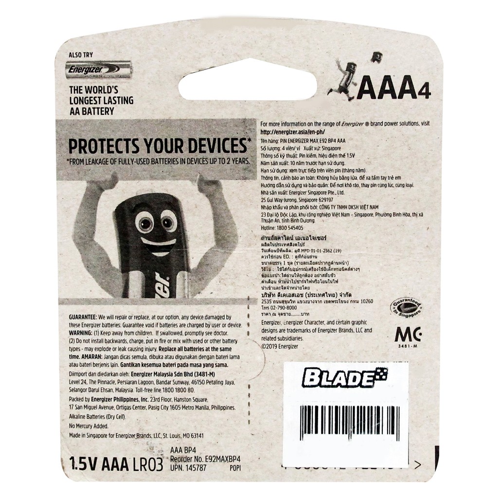Energizer Batteries E92 MAX BP-4 AAA 4 Pack 1.5V