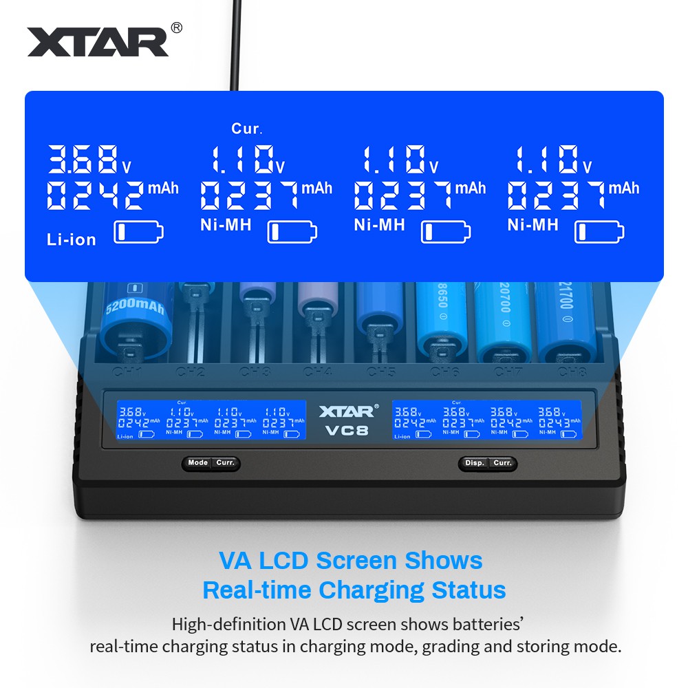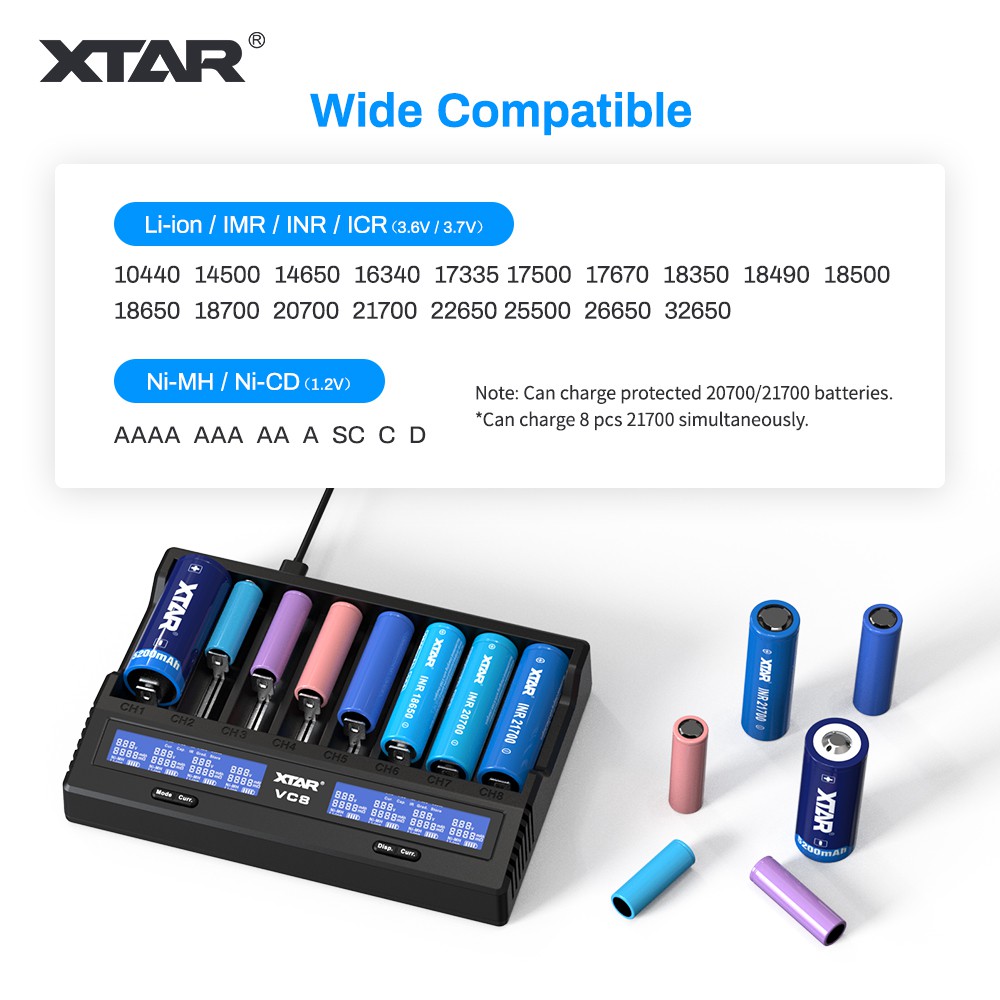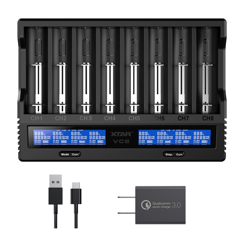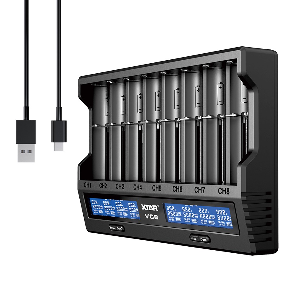 18650 Battery Charger,XTAR VC8(VC4+VC4S) 8 Bay USB C Fast Charger for Rechargeable Li-ion IMR Ni-MH Ni-Cd AA AAA C 21700 26650 14500 16340 18350 18700 32650