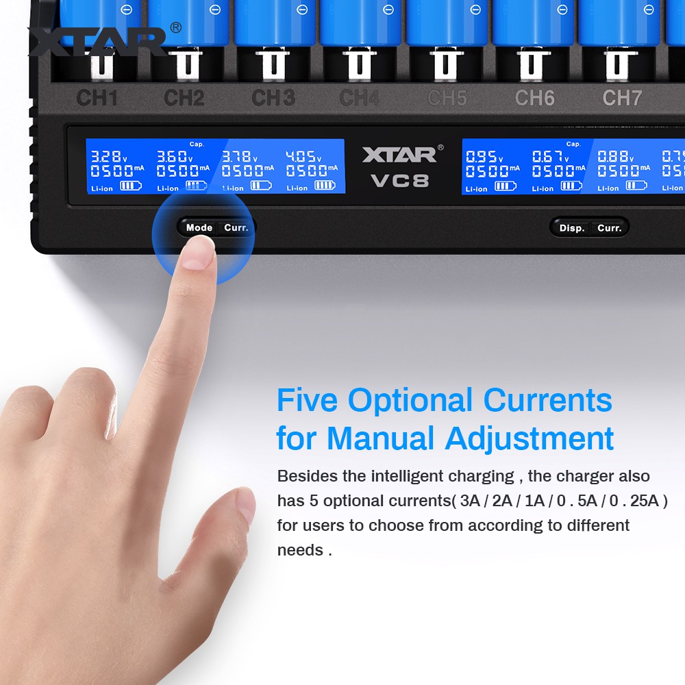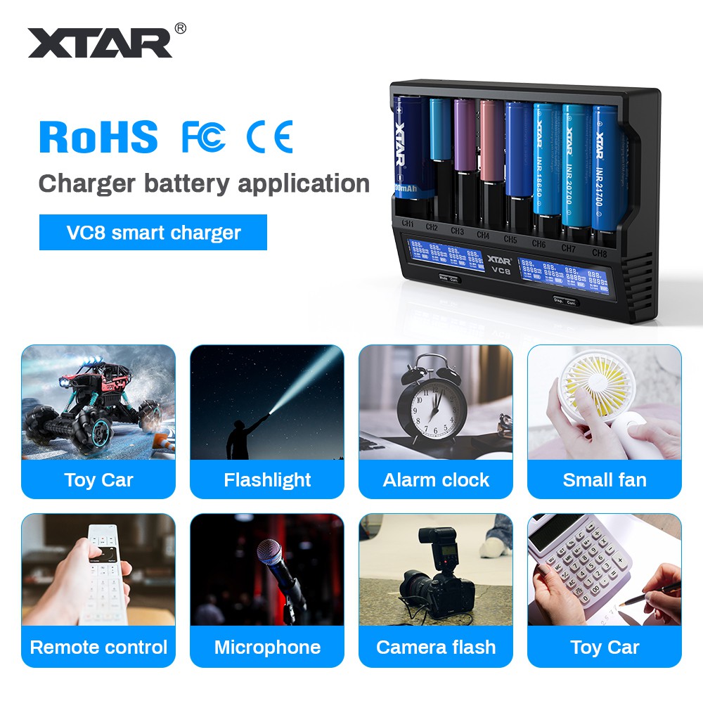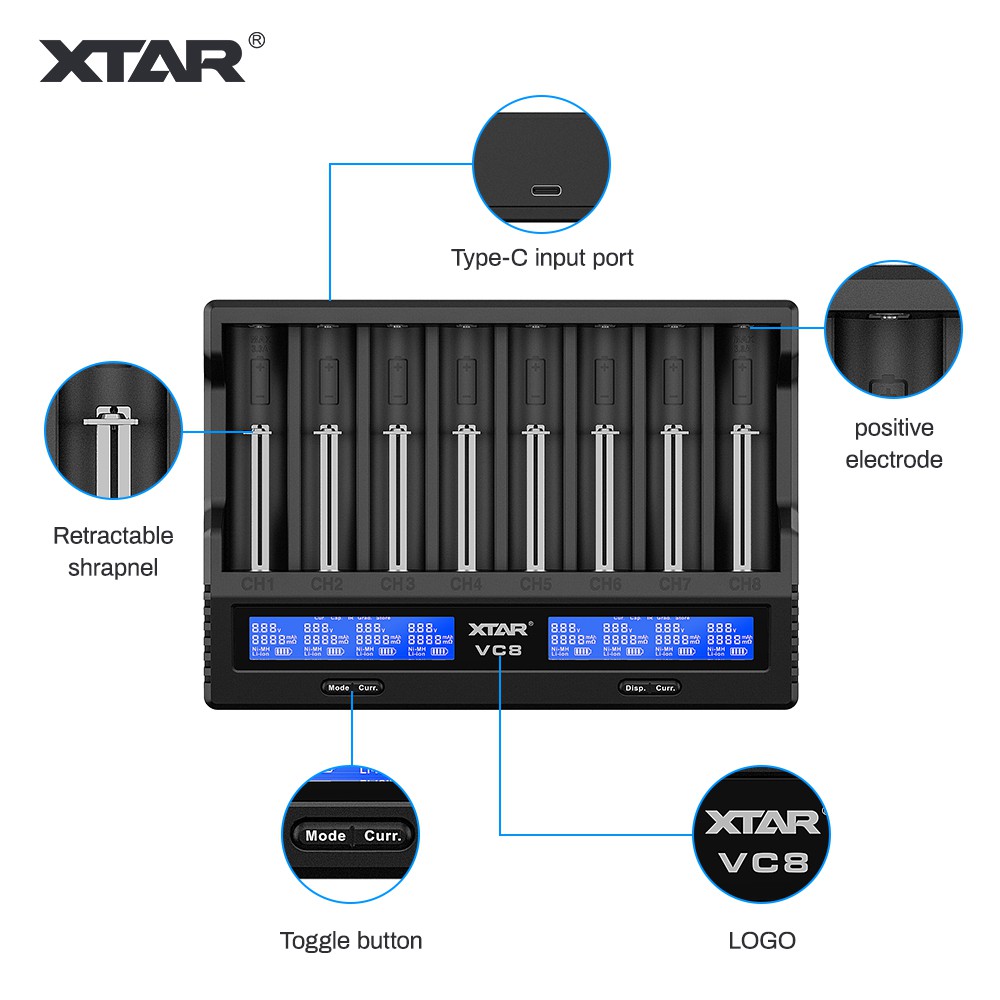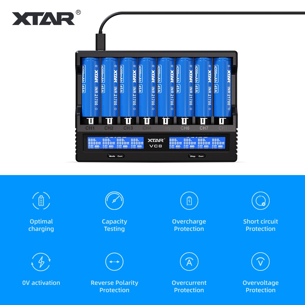 18650 Battery Charger,XTAR VC8(VC4+VC4S) 8 Bay USB C Fast Charger for Rechargeable Li-ion IMR Ni-MH Ni-Cd AA AAA C 21700 26650 14500 16340 18350 18700 32650