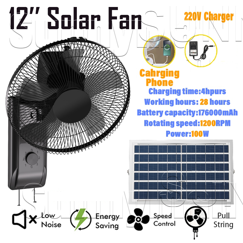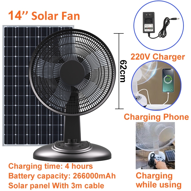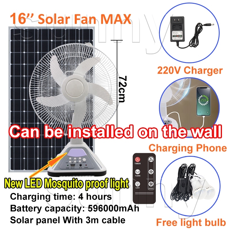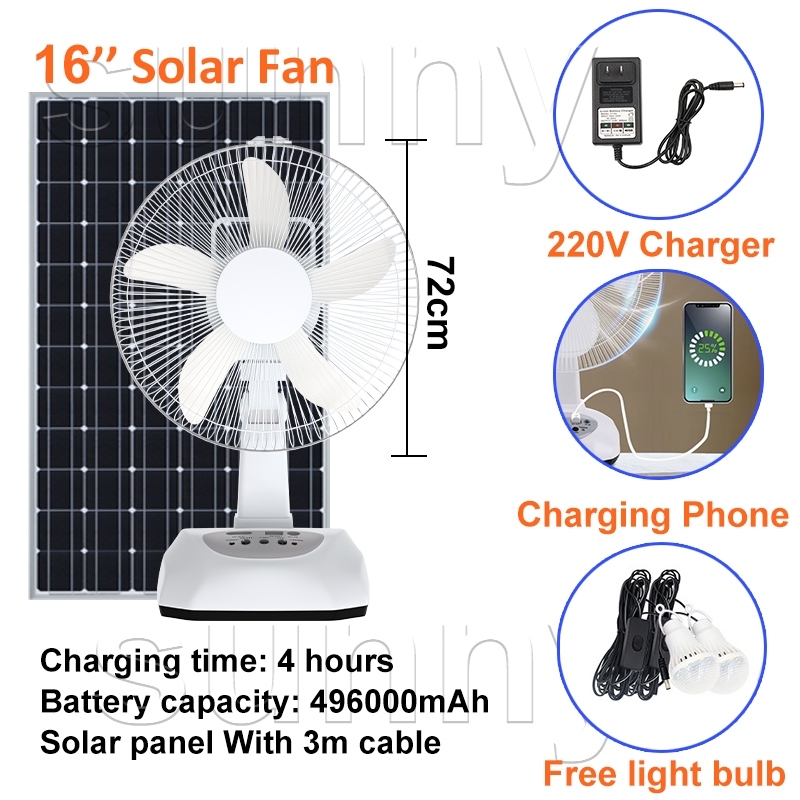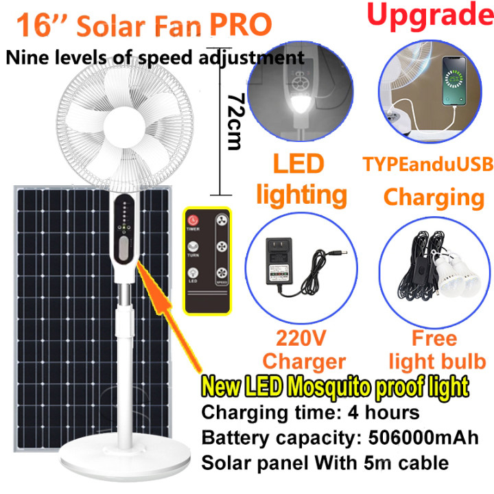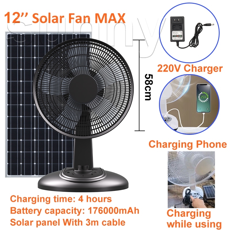 solar electric fan with panel 12 inch solar fan LED lighting solar charging 3m long cable