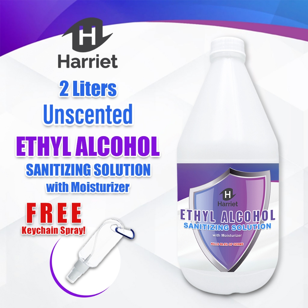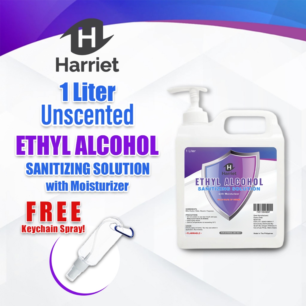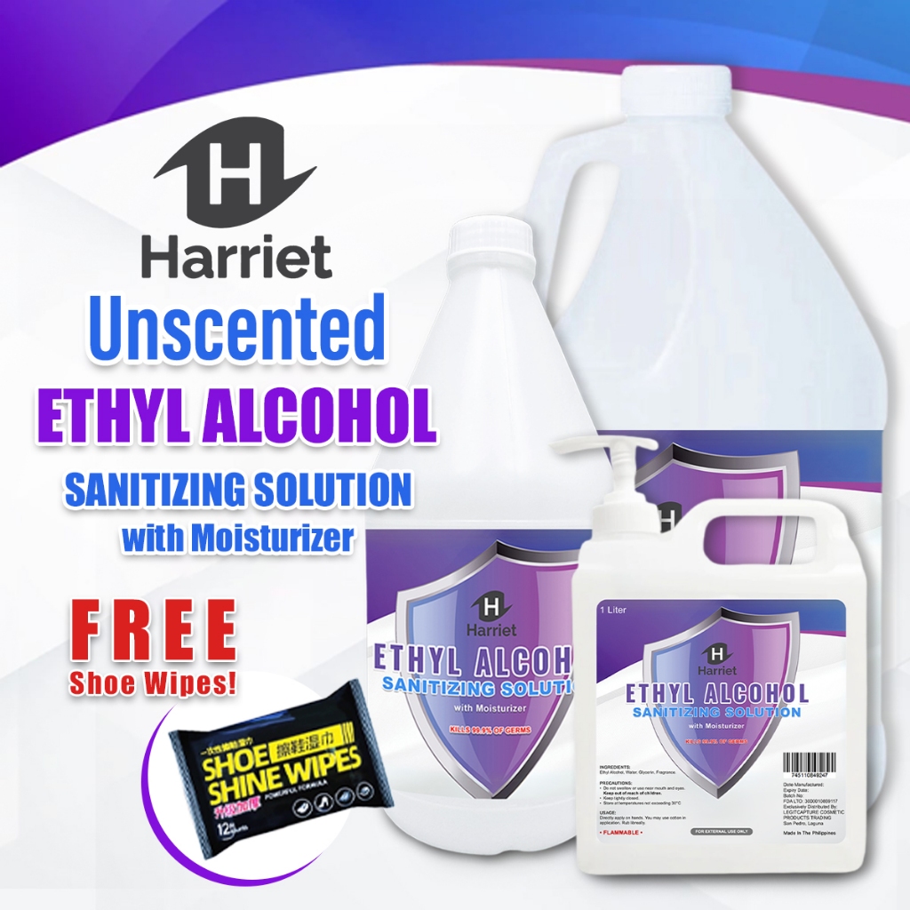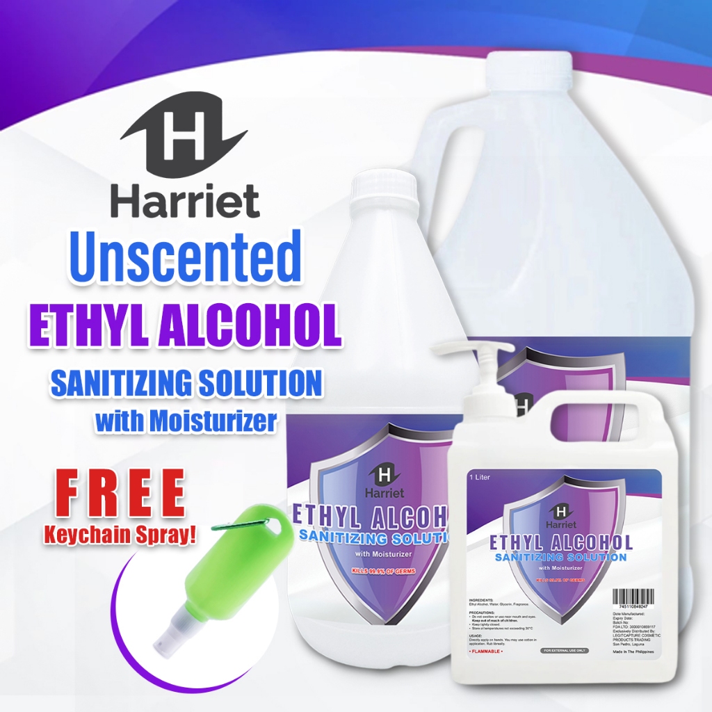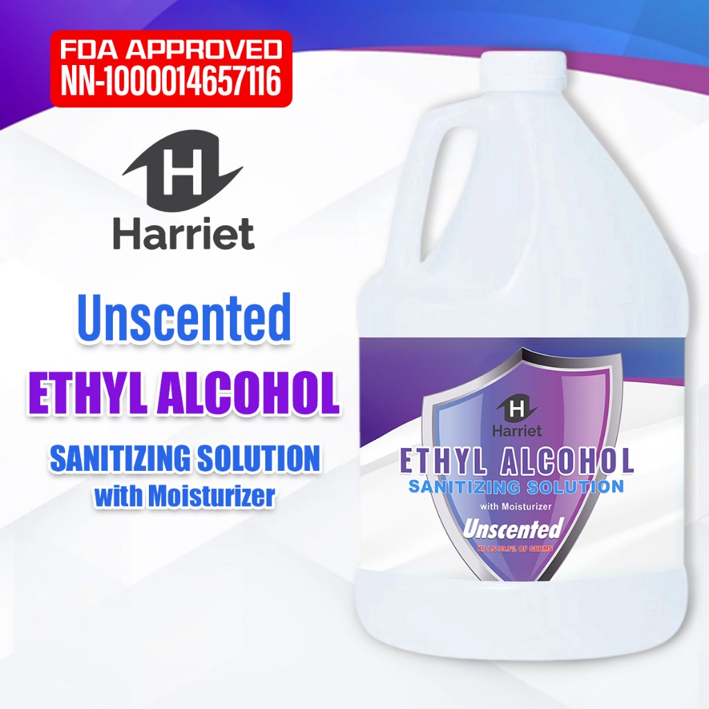 UNSCENTED HARRIET ETHYL ALCOHOL SANITIZING SOLUTION WITH FREEBIES 1 Gallon, 1 Liter, half Gallon