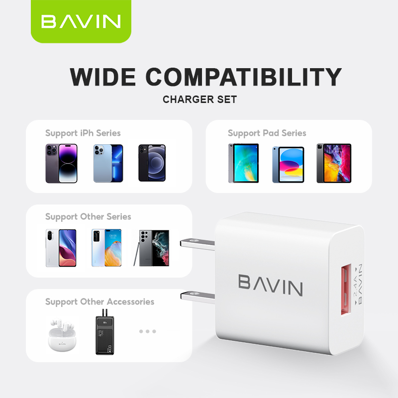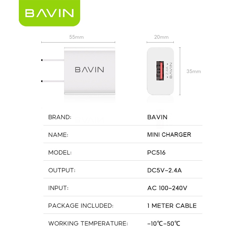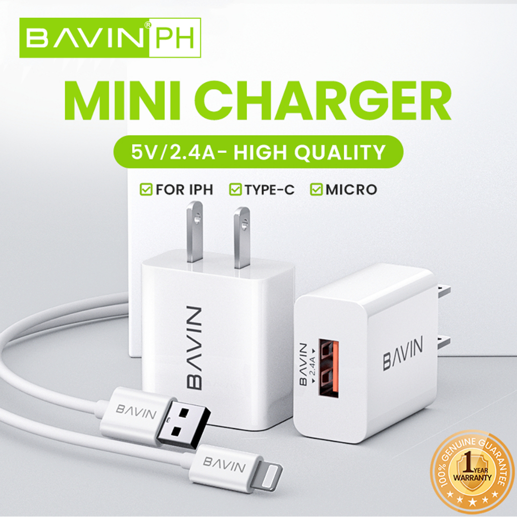 BAVIN PC516 2.4A Universal Mini Wall Charger | Adapter w/ 1m Cable for Android, Type-C & iPh