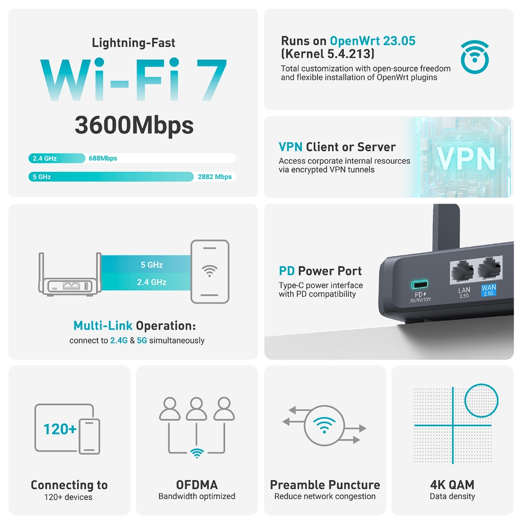 GL.iNet GL-BE3600 (Slate 7) Portable Travel Router, Pocket Dual-Band Wi-Fi 7, 2.5G Router, Portable VPN Routers WiFi for Travel, Public Computer Routers, Business Trip, Moblie/RV