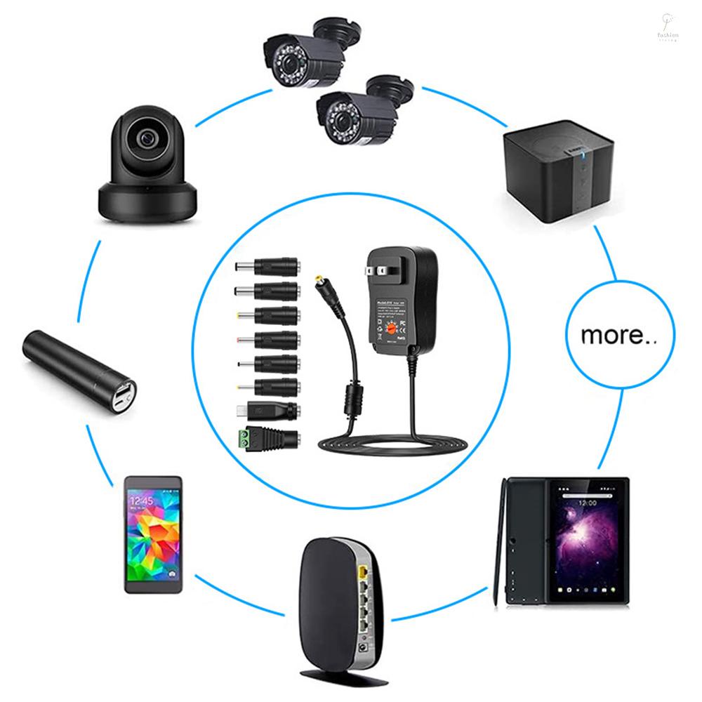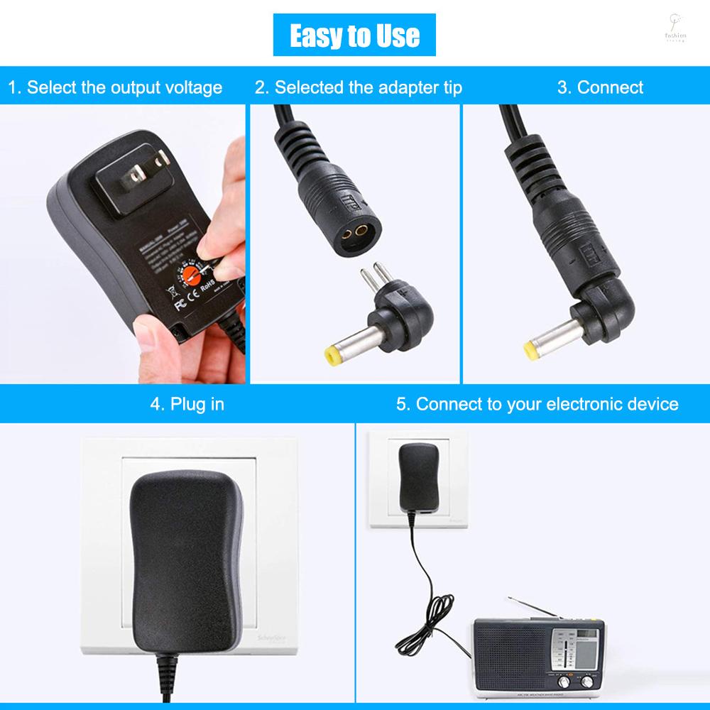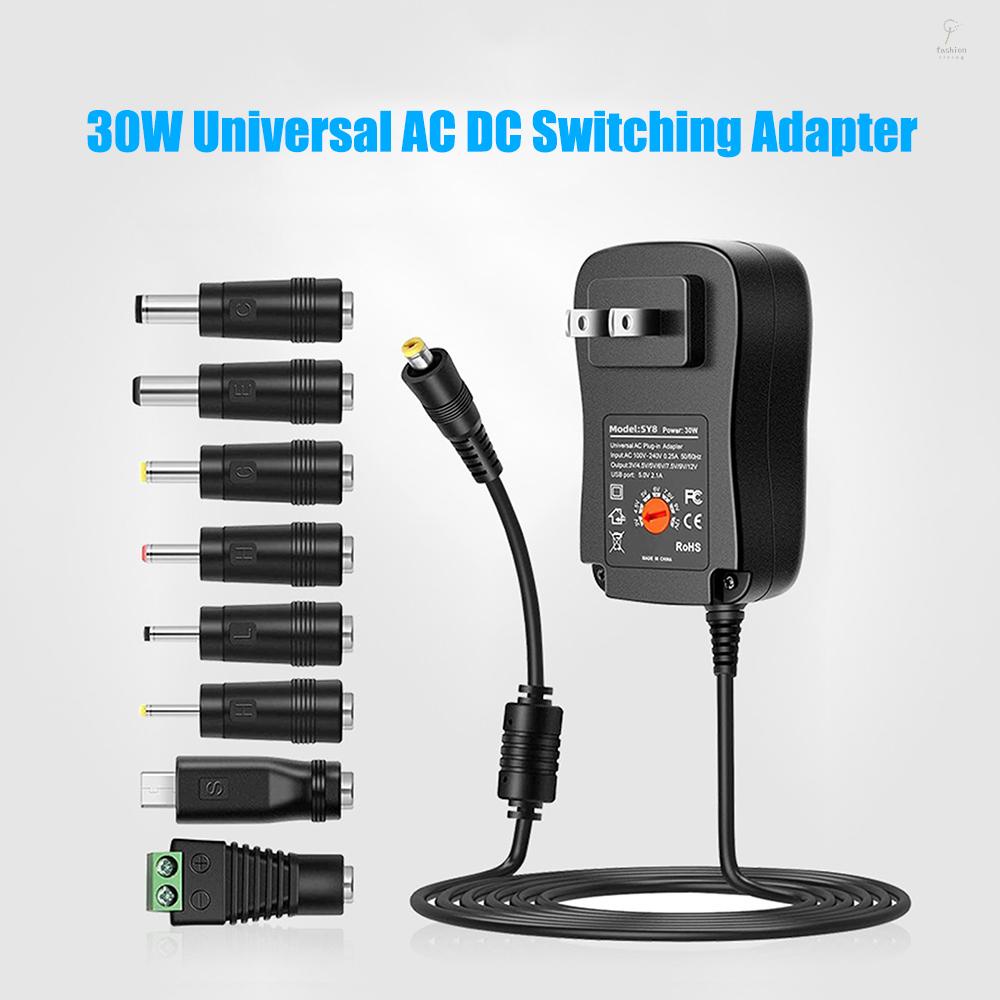 FLP 30W Universal AC to DC Power Supply Adapter with 5V 2.1A USB Port, AC Plug-in Power Charger 3V to 12V Adjustable Output Voltage with 8 DC Adapter Tips for Household Electronics