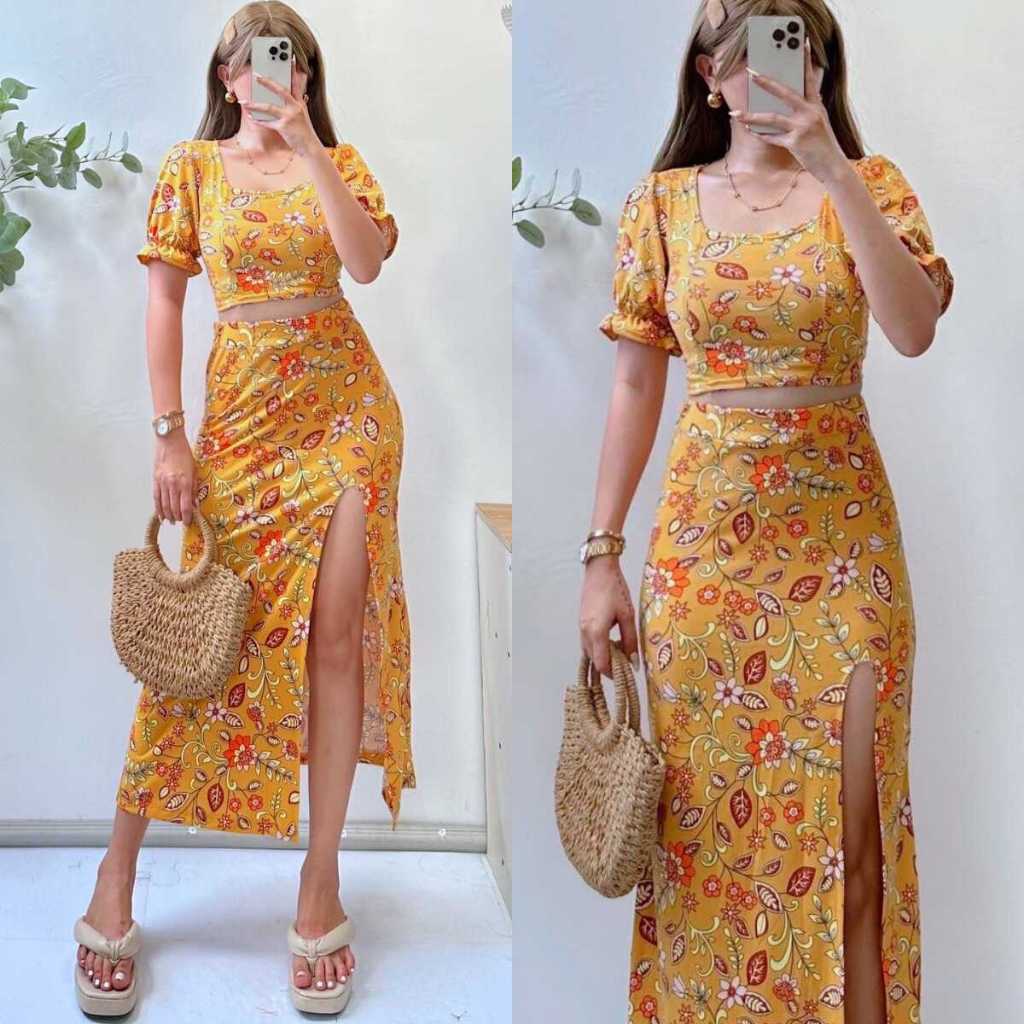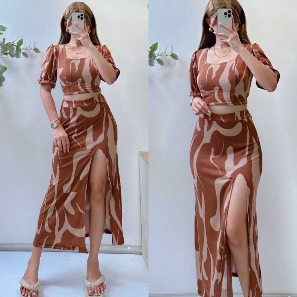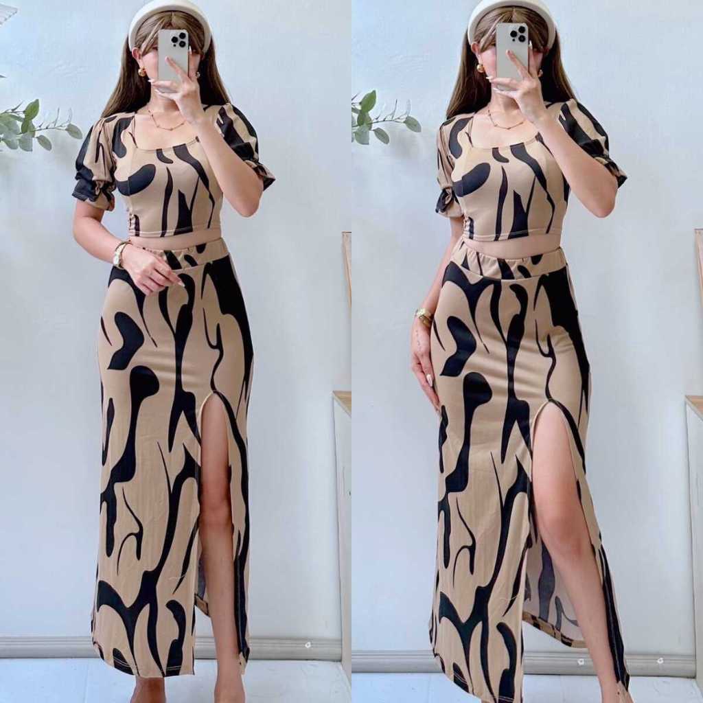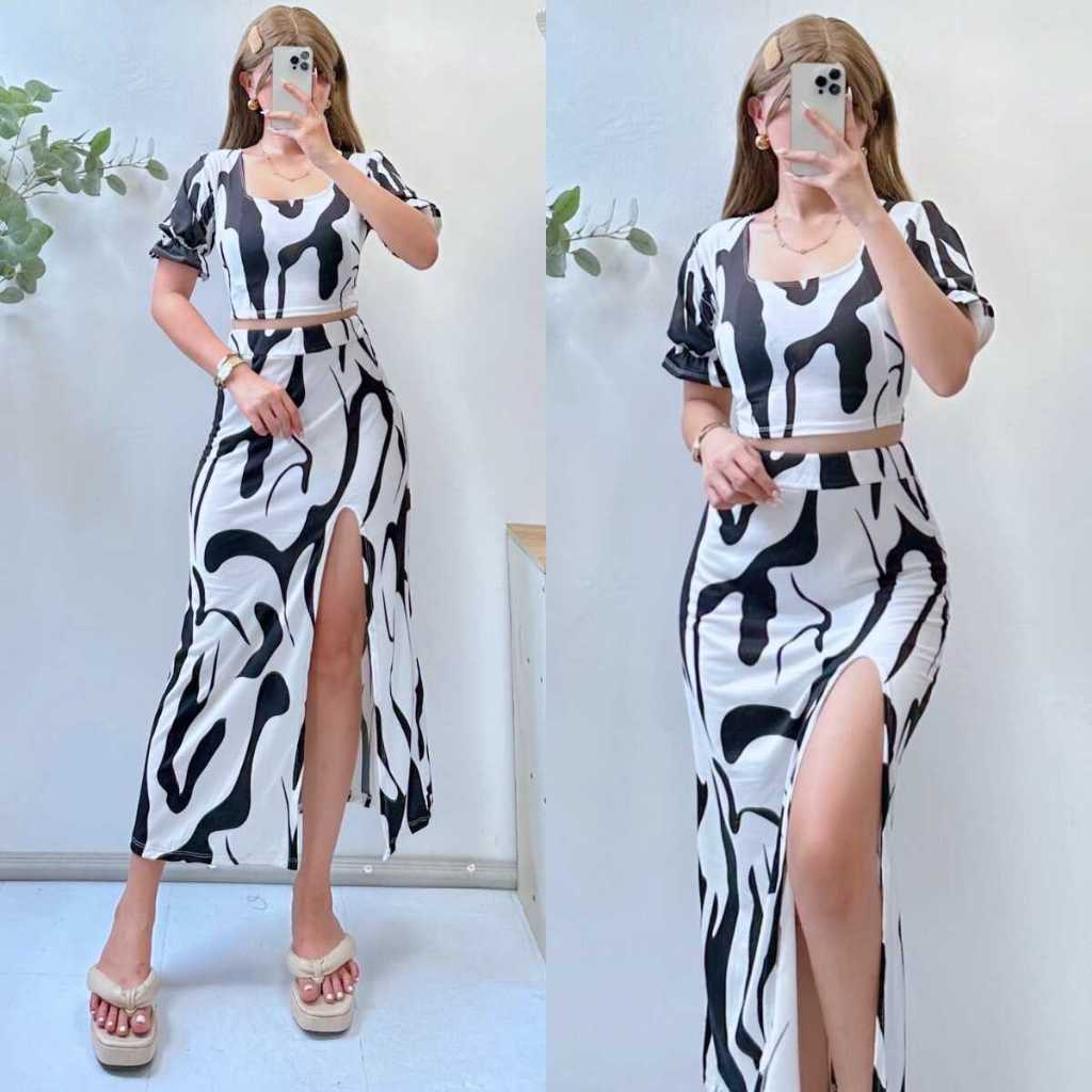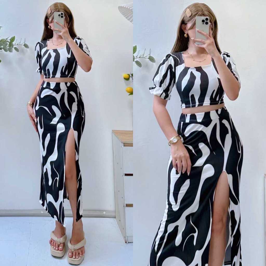 Summer Puff Sleeves Top & Slit Skirt Dress Sexy Set Terno