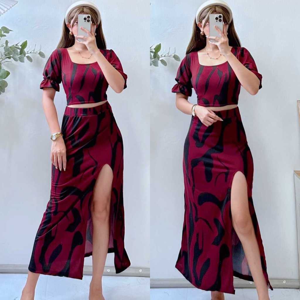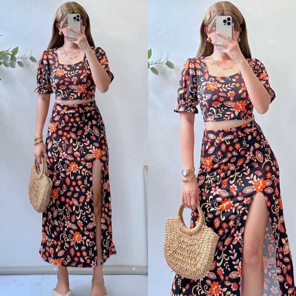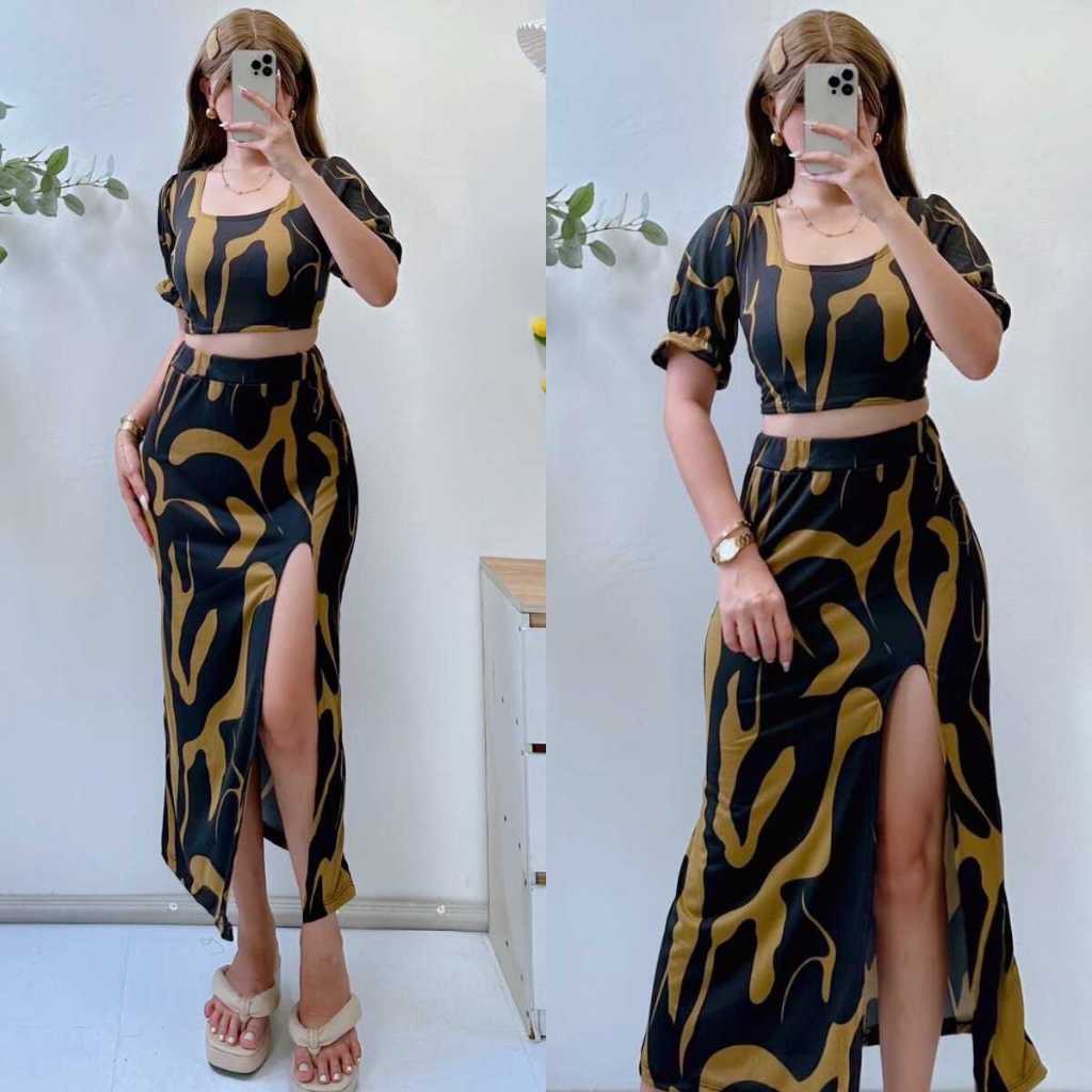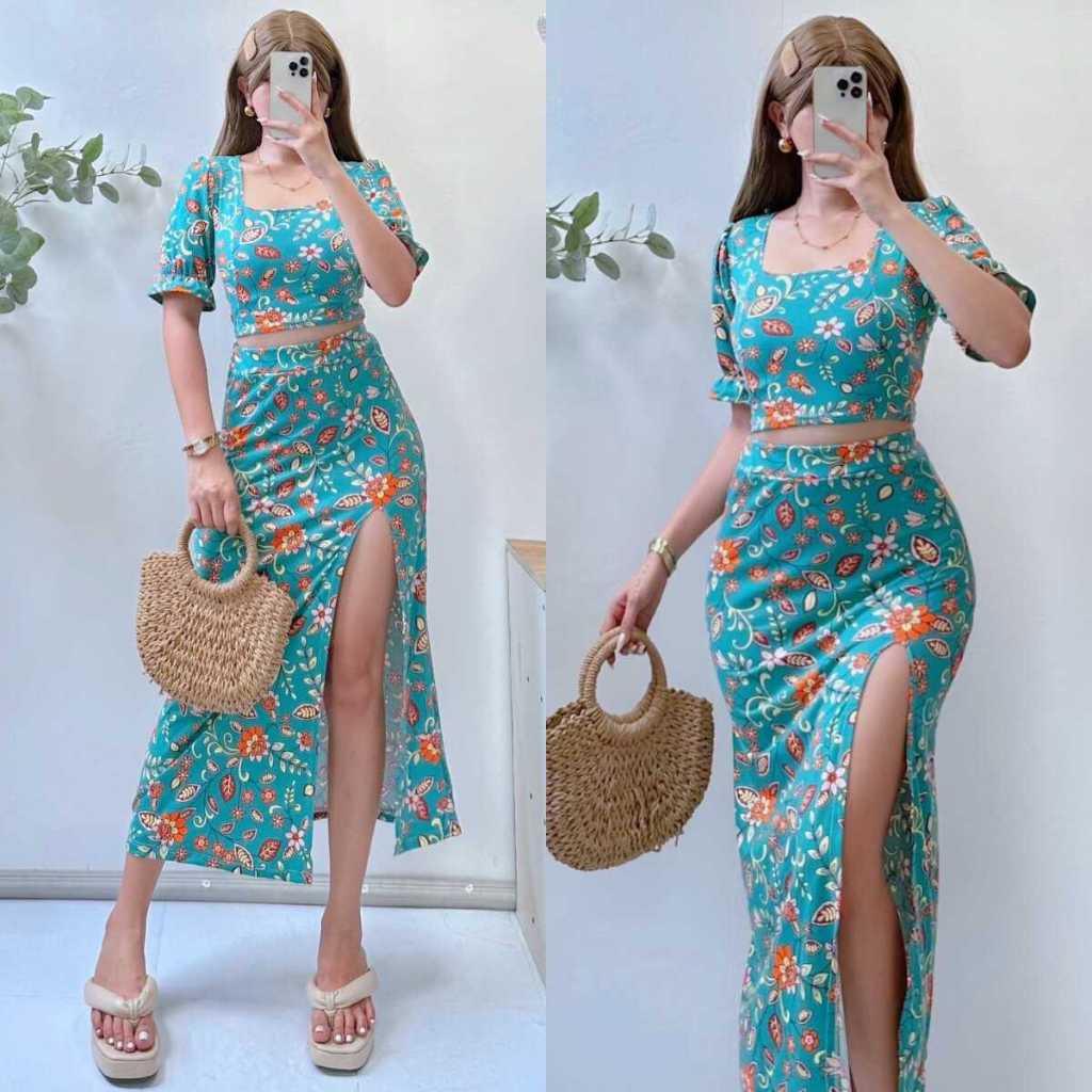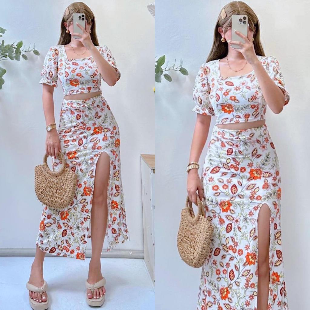Summer Puff Sleeves Top & Slit Skirt Dress Sexy Set Terno