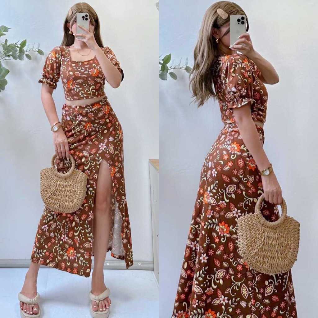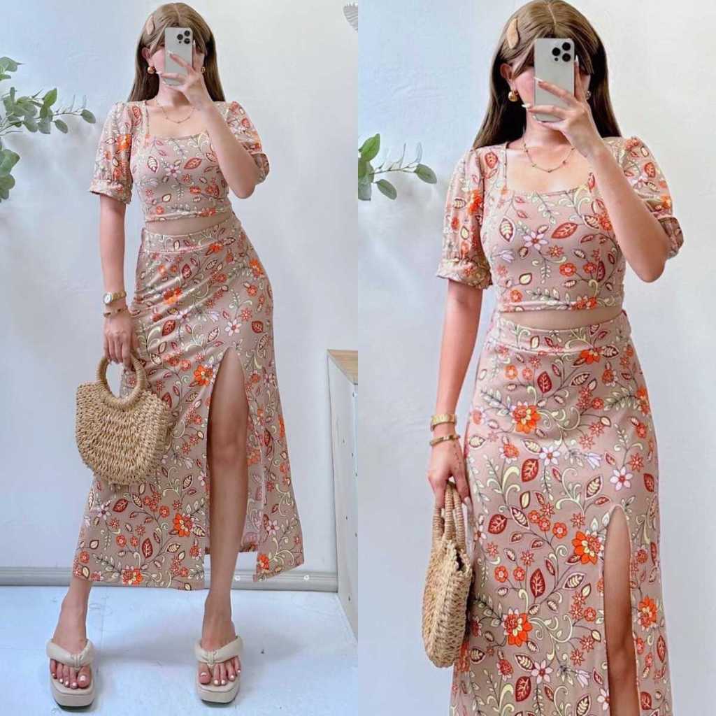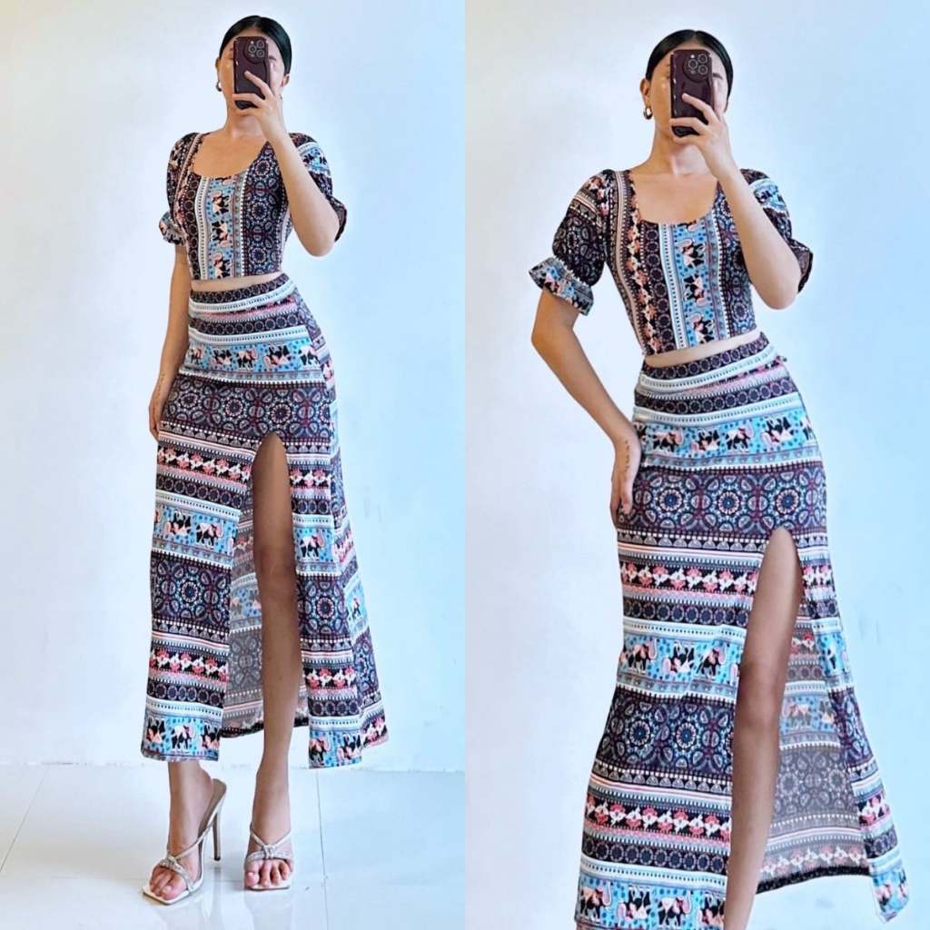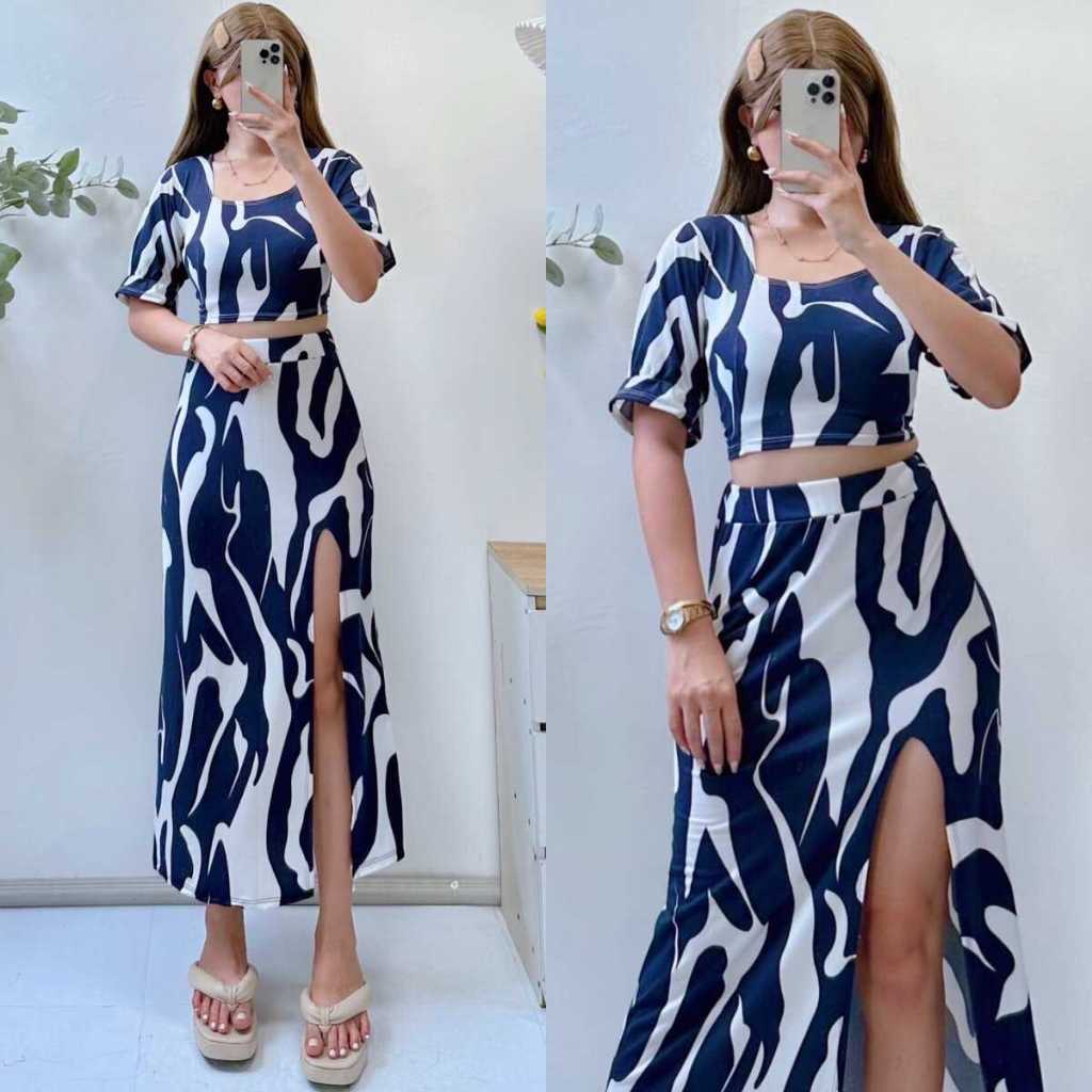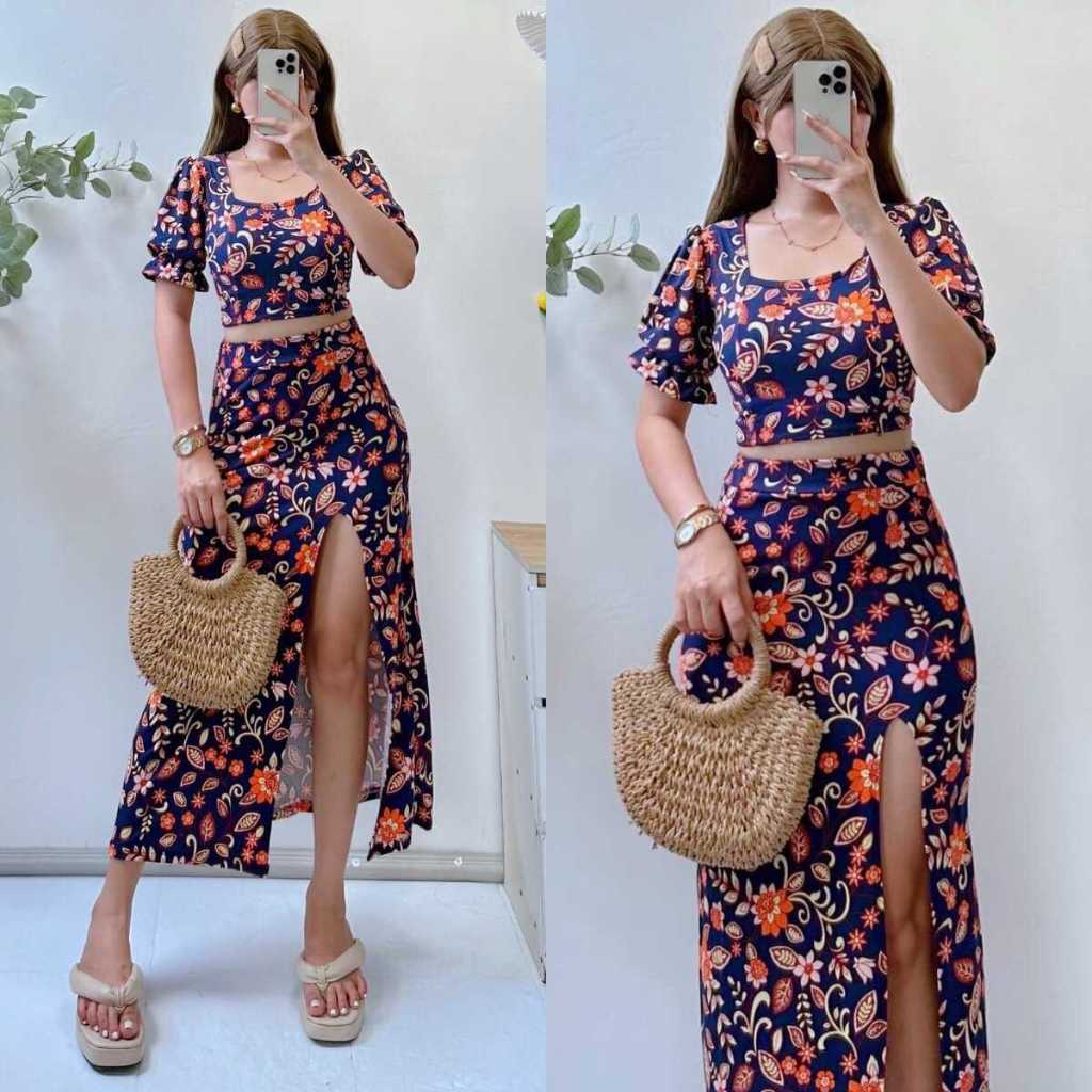 Summer Puff Sleeves Top & Slit Skirt Dress Sexy Set Terno