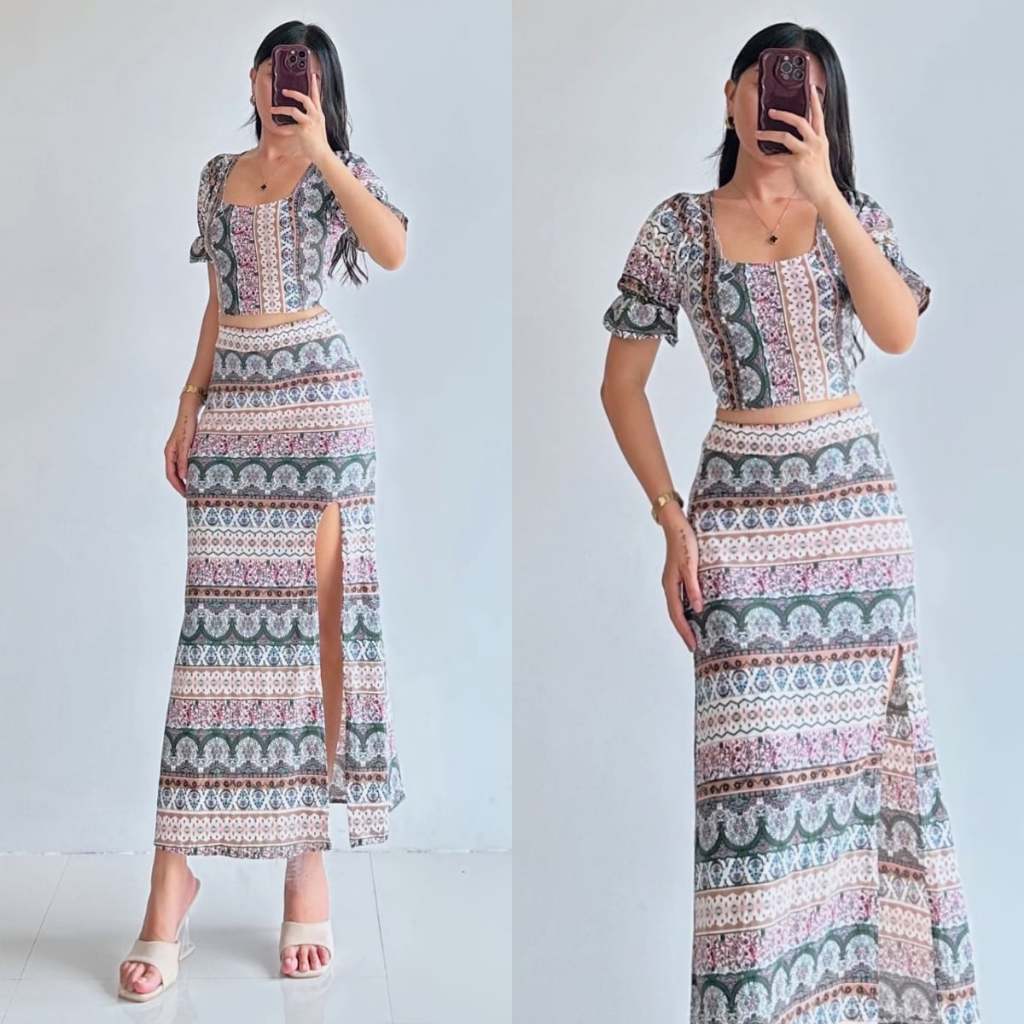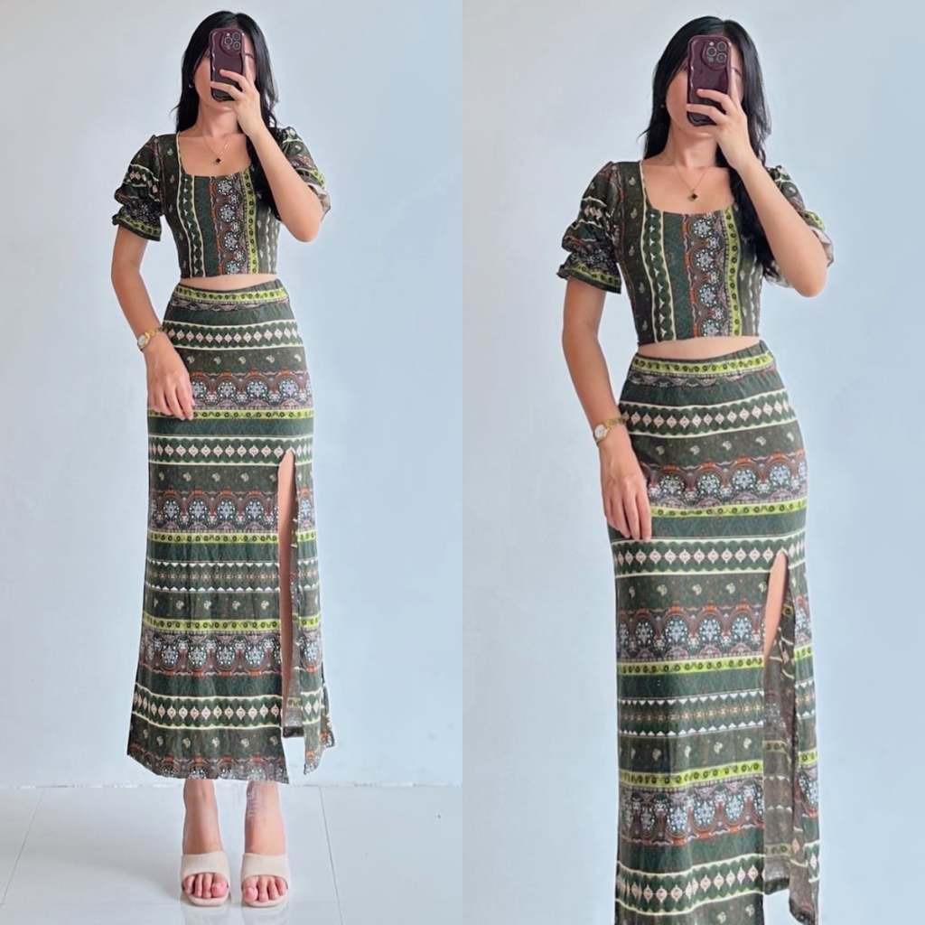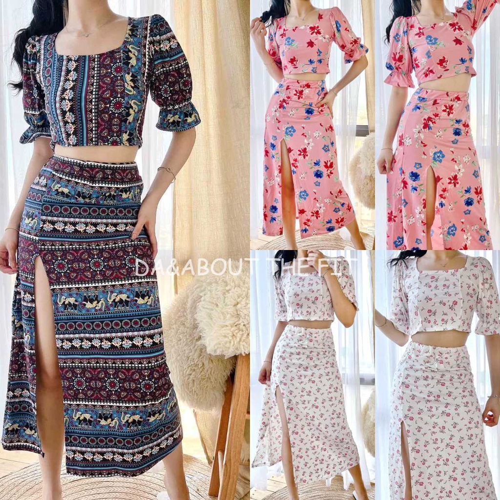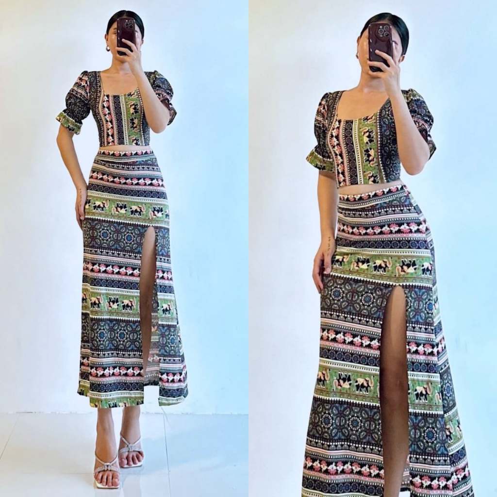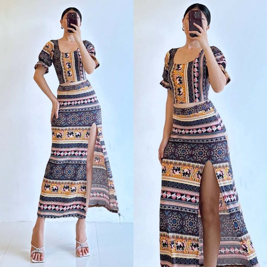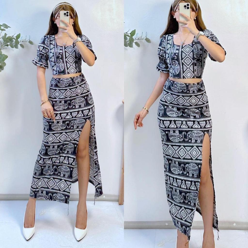 Summer Puff Sleeves Top & Slit Skirt Dress Sexy Set Terno
