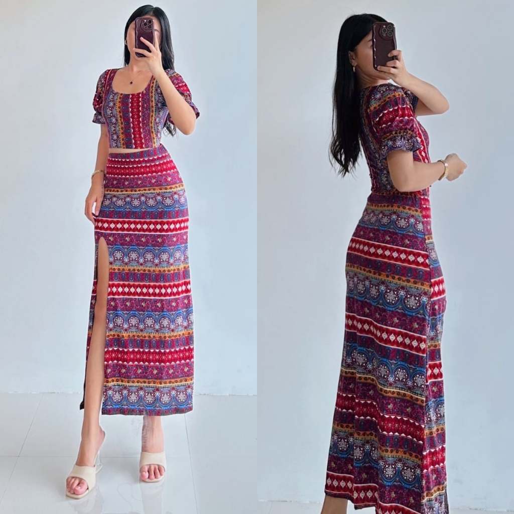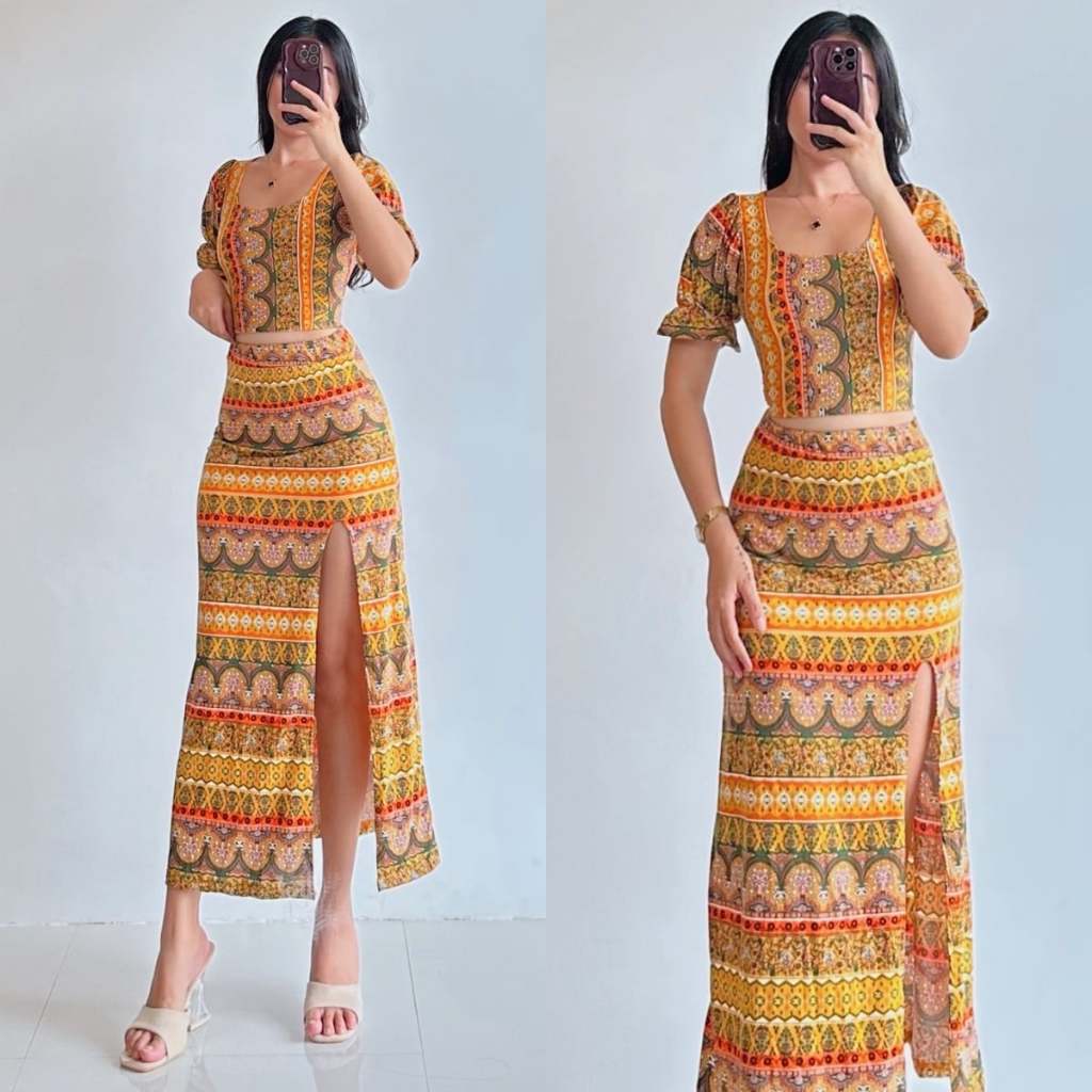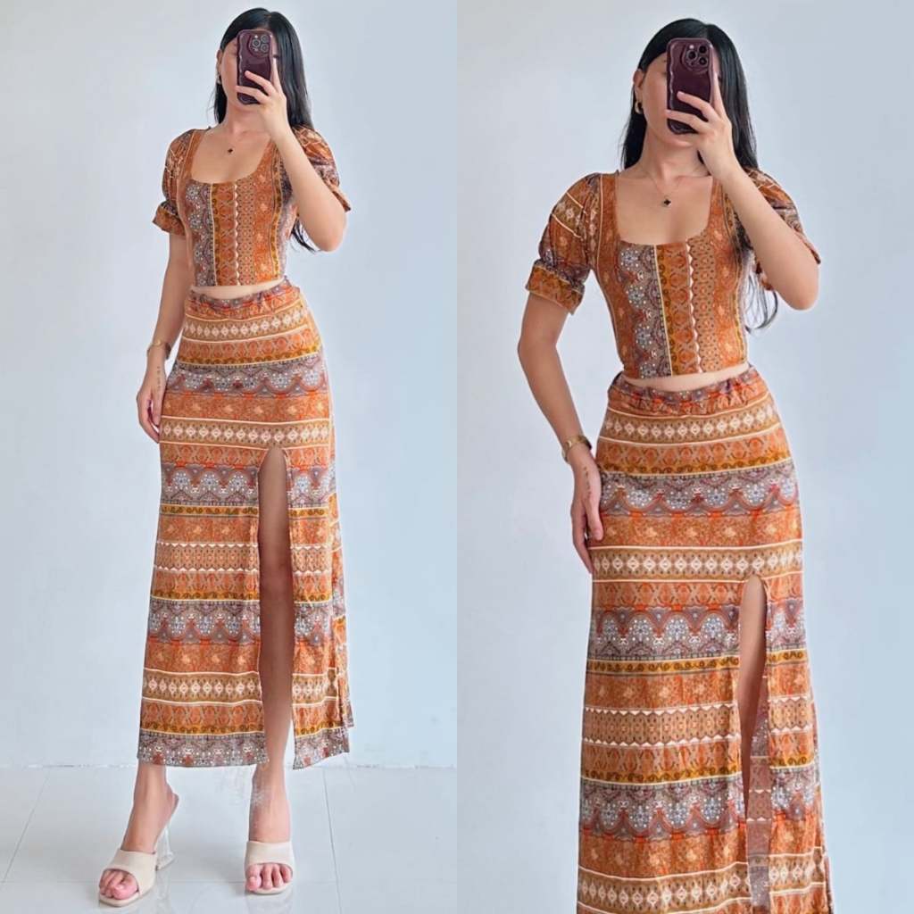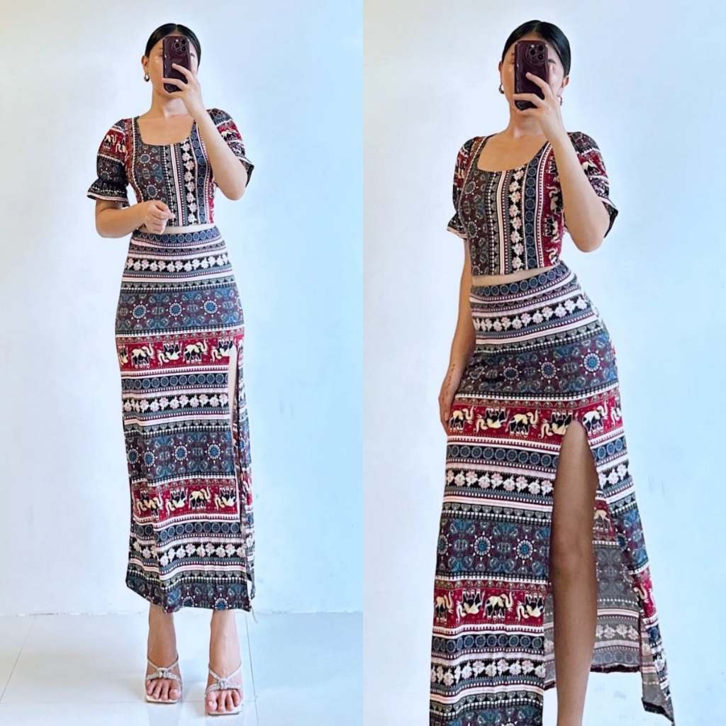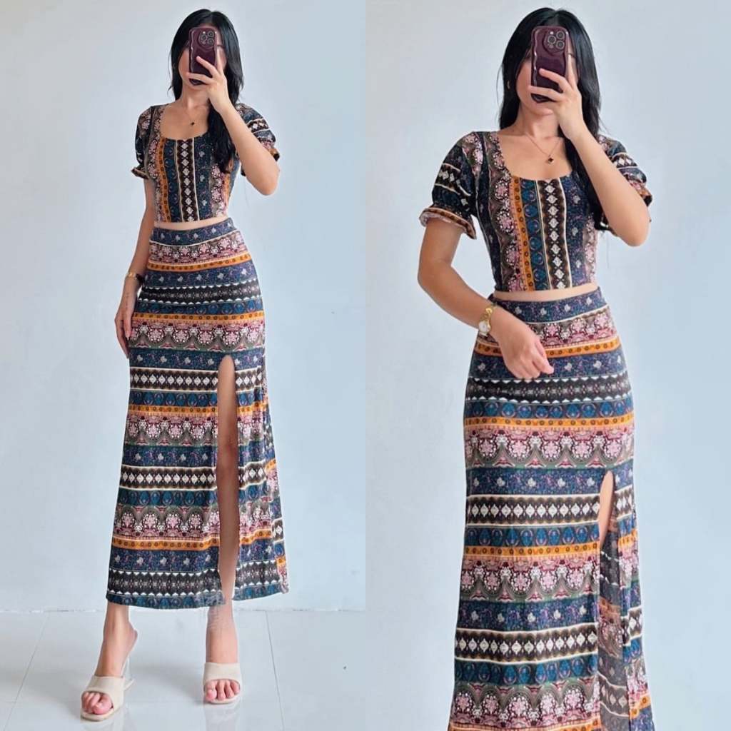 Summer Puff Sleeves Top & Slit Skirt Dress Sexy Set Terno