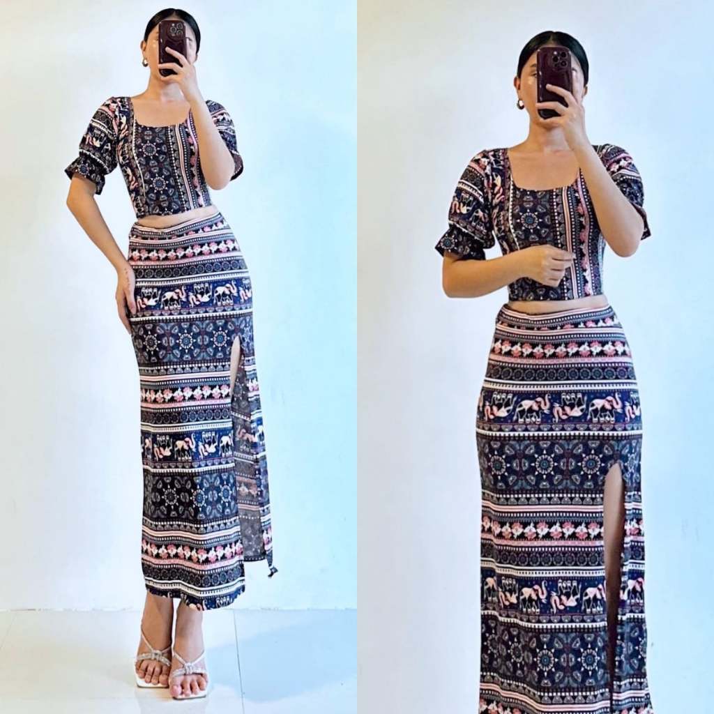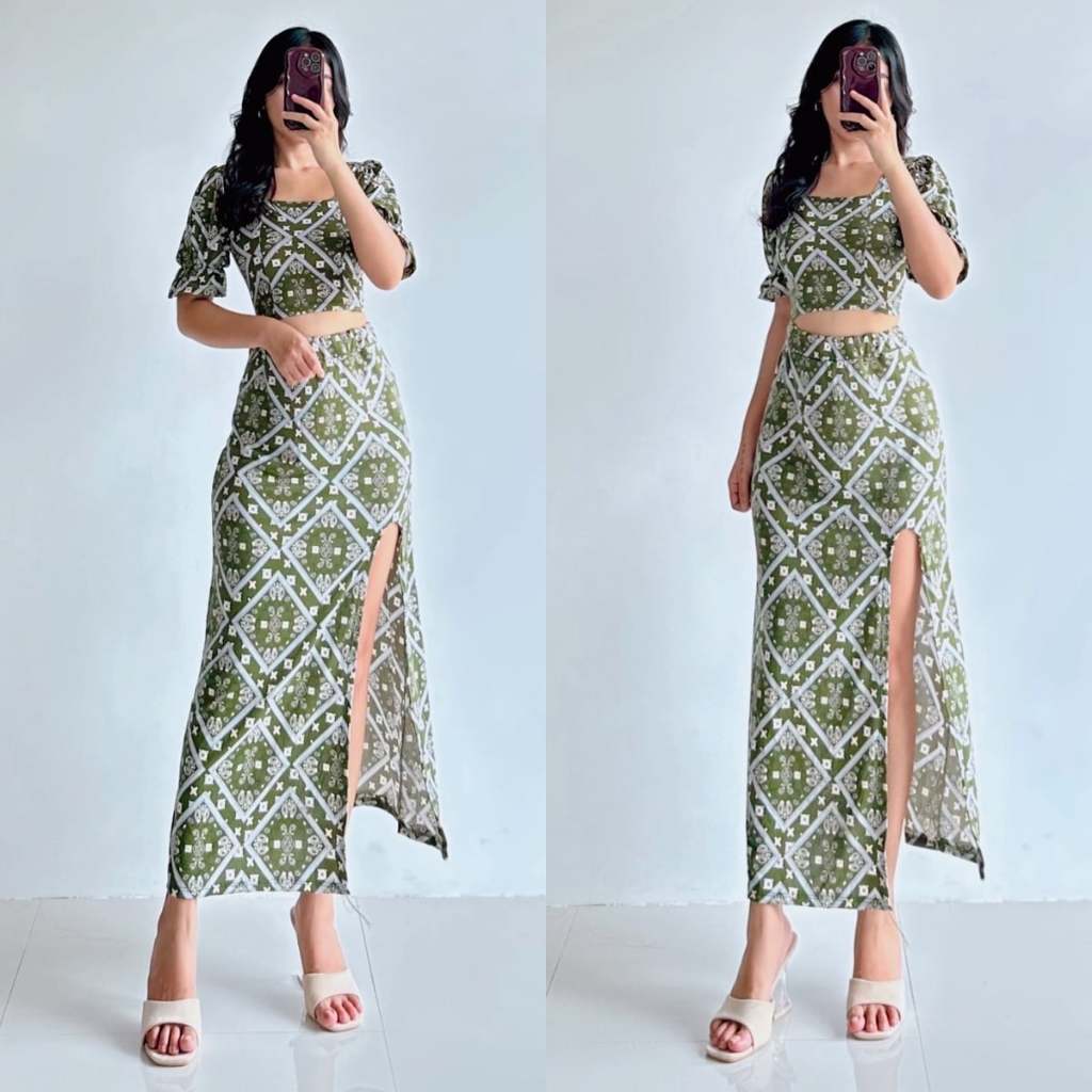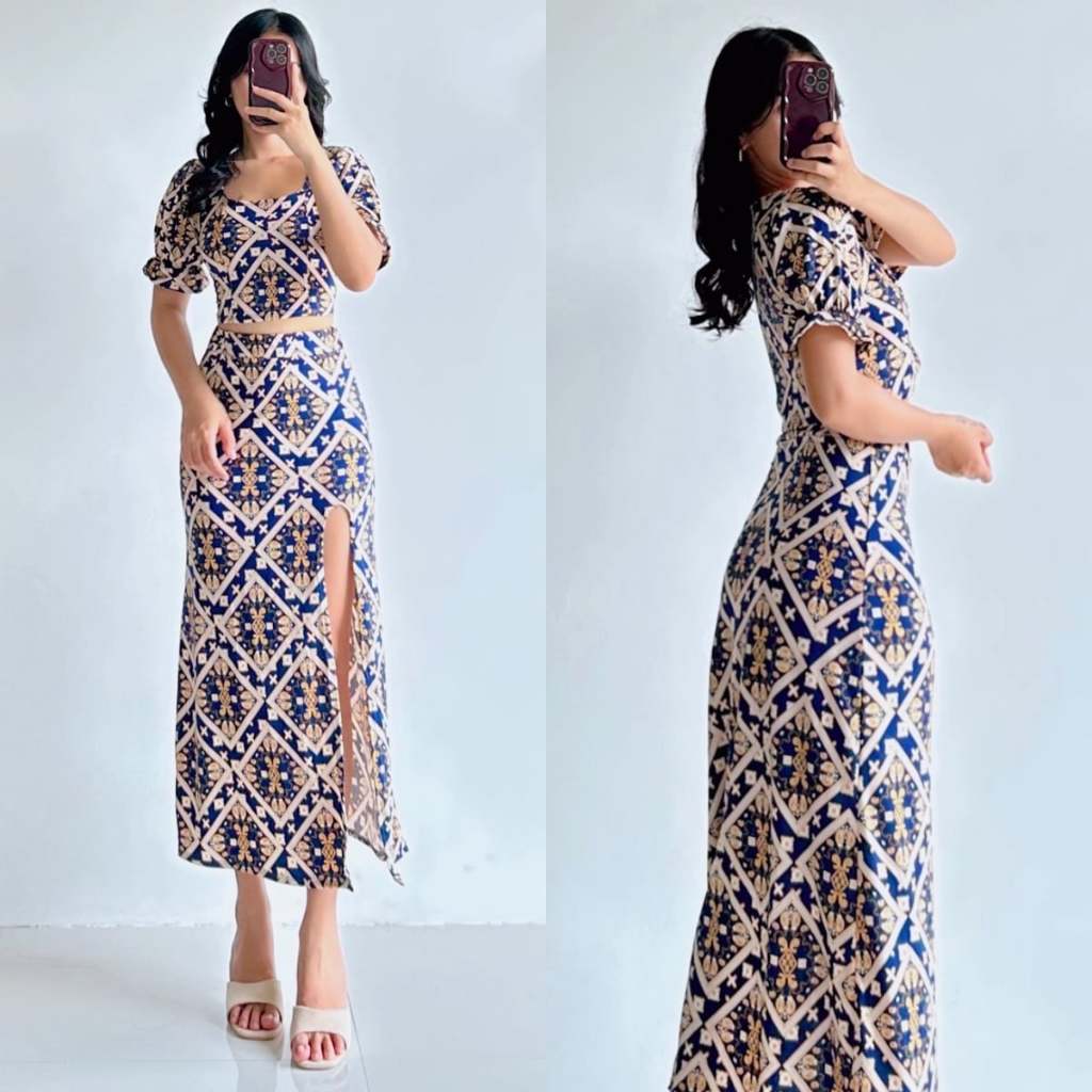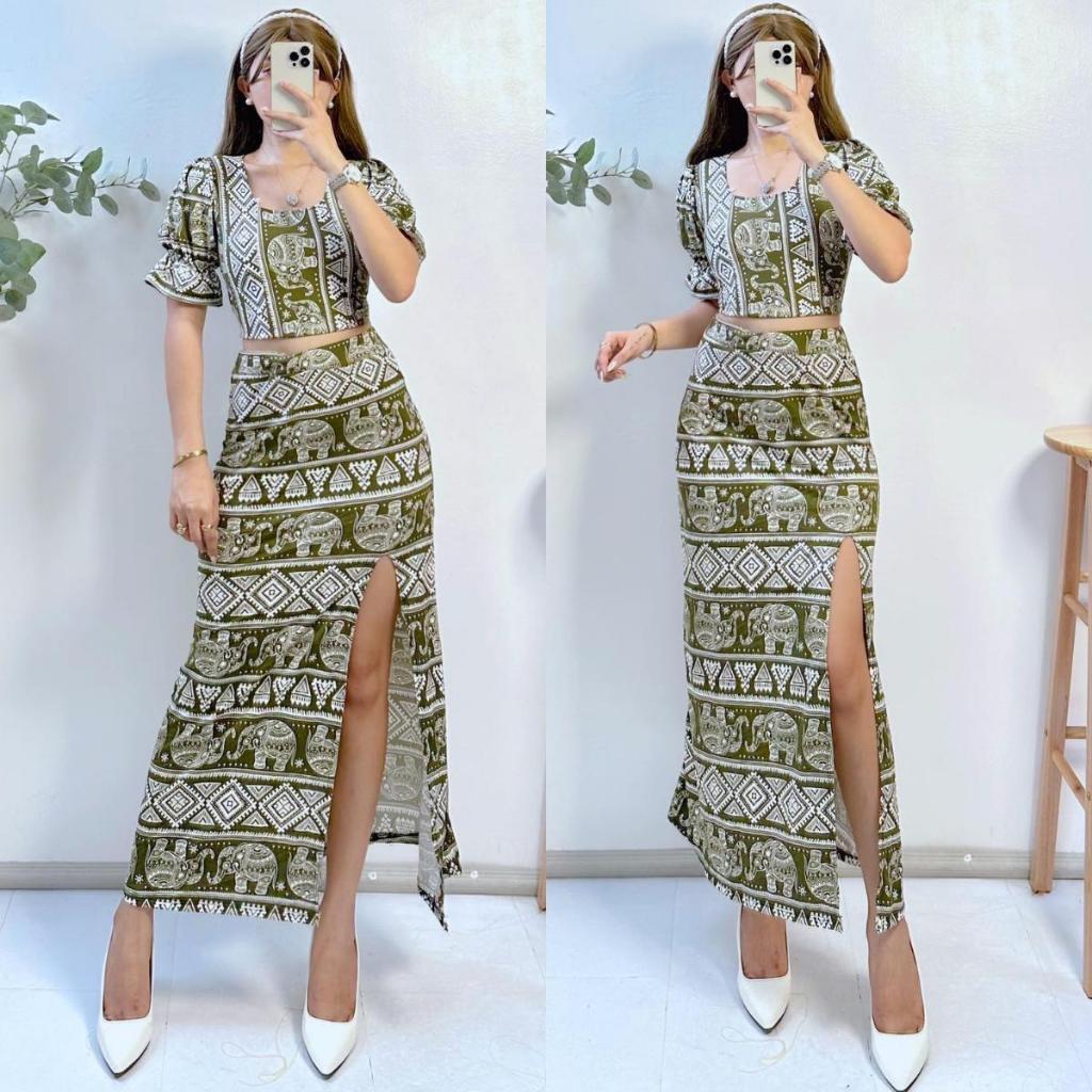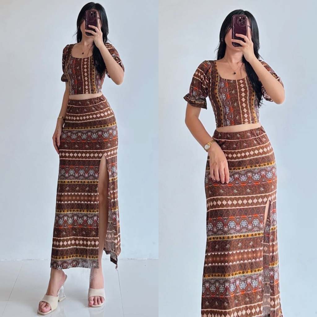 Summer Puff Sleeves Top & Slit Skirt Dress Sexy Set Terno