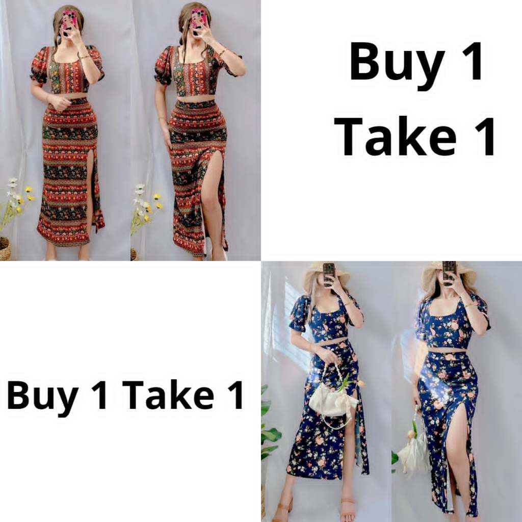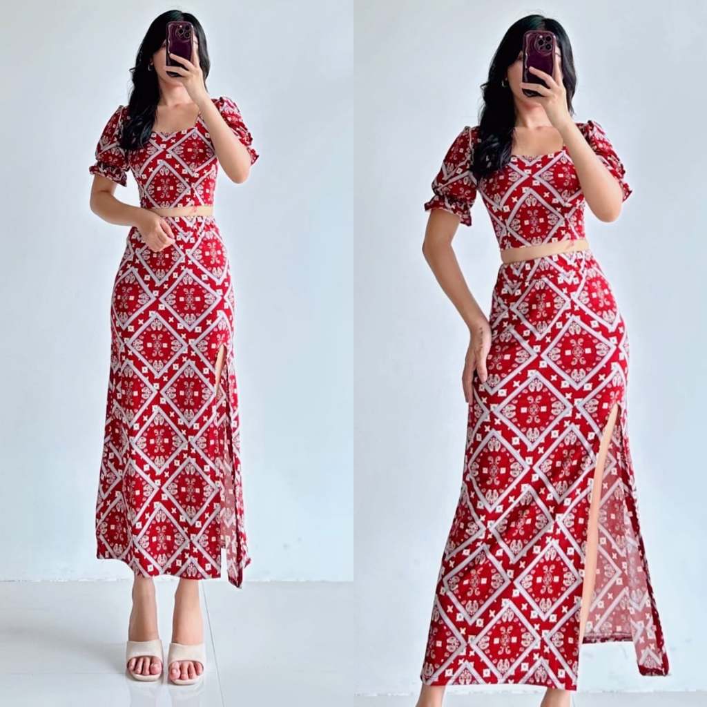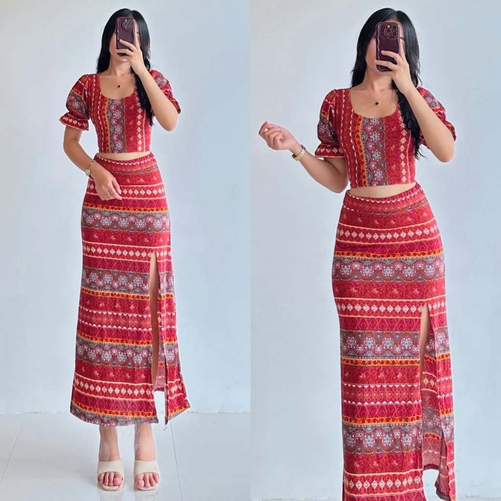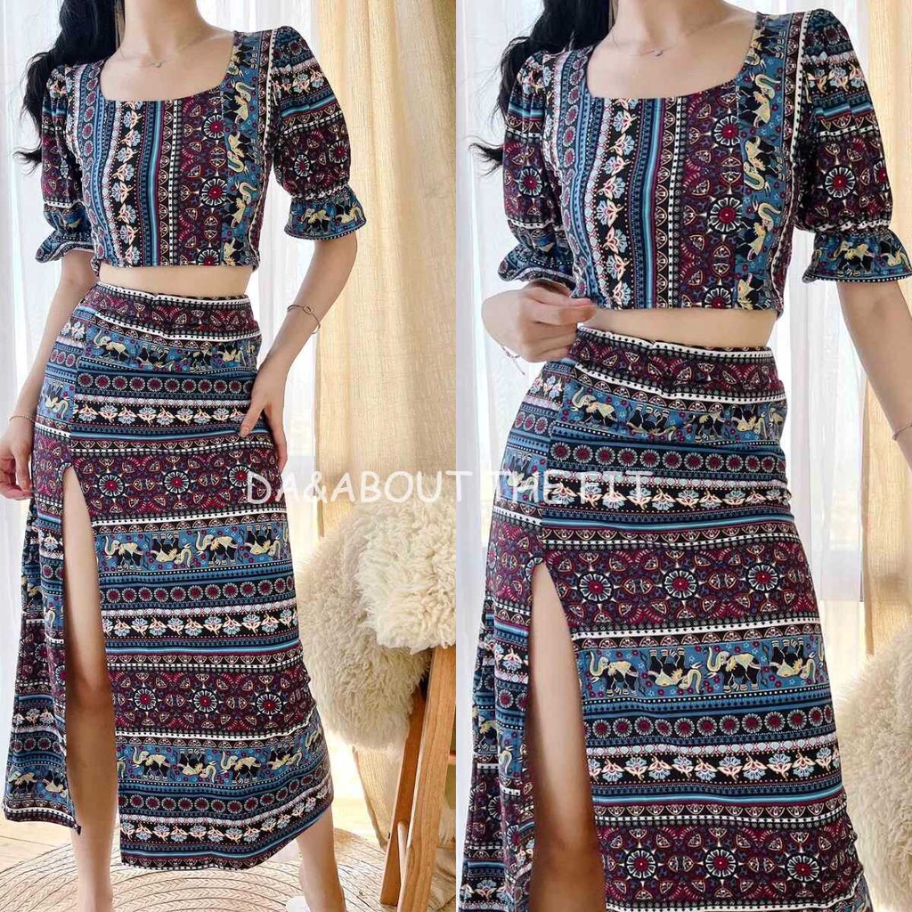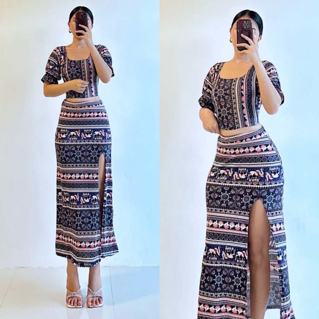 Summer Puff Sleeves Top & Slit Skirt Dress Sexy Set Terno