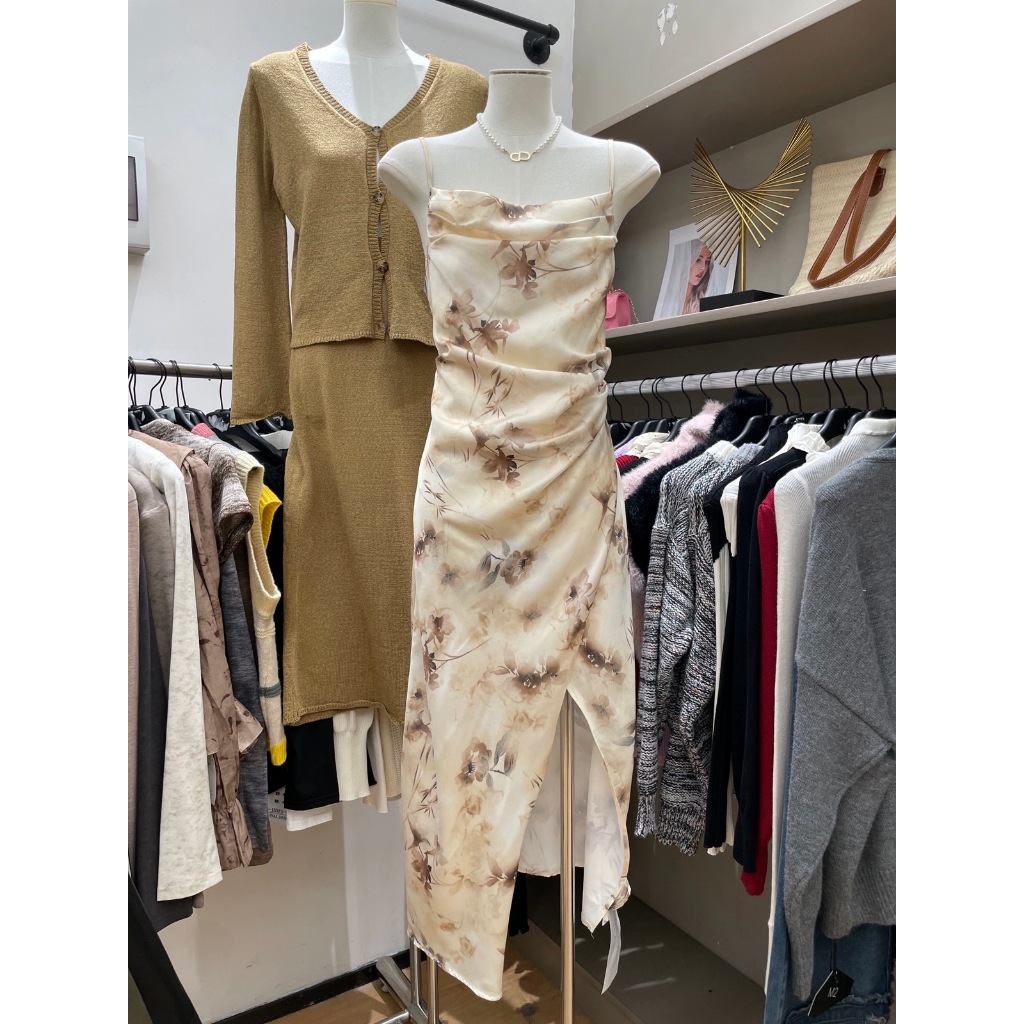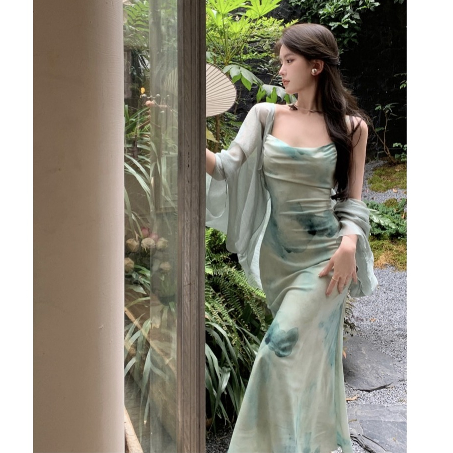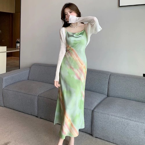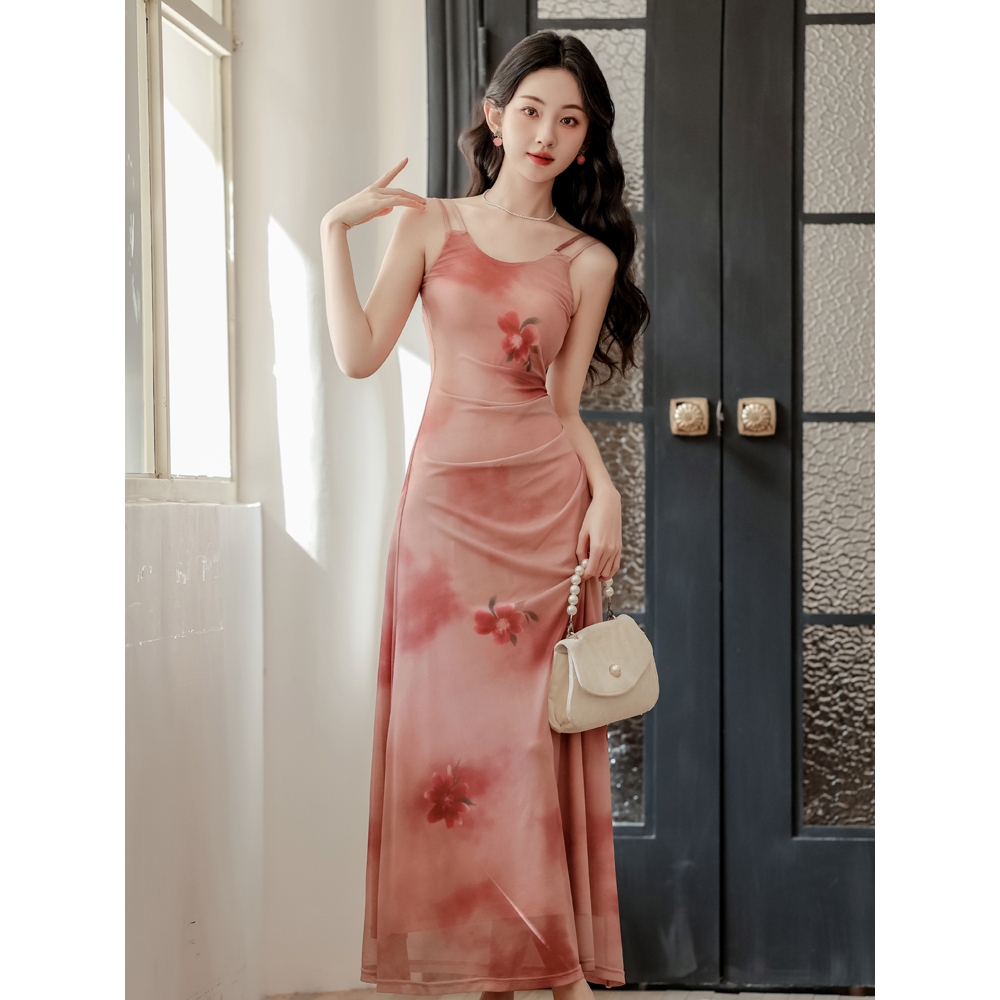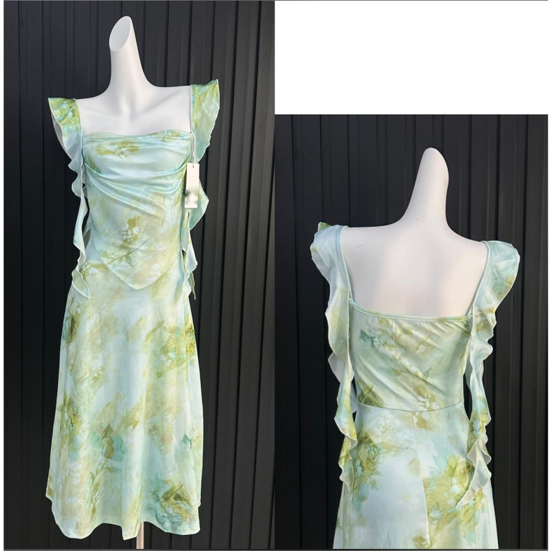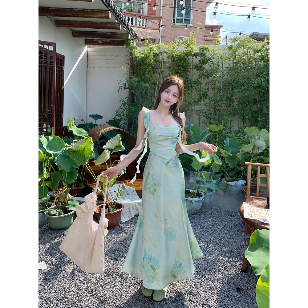 summer green floral midi korean Sleeveless dress for women elegant Strendy backless sunday dress xs