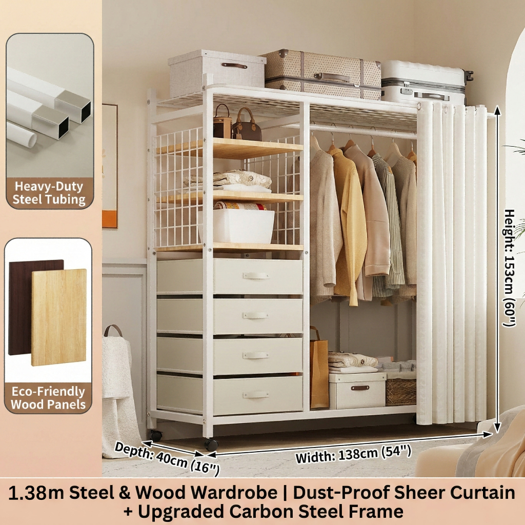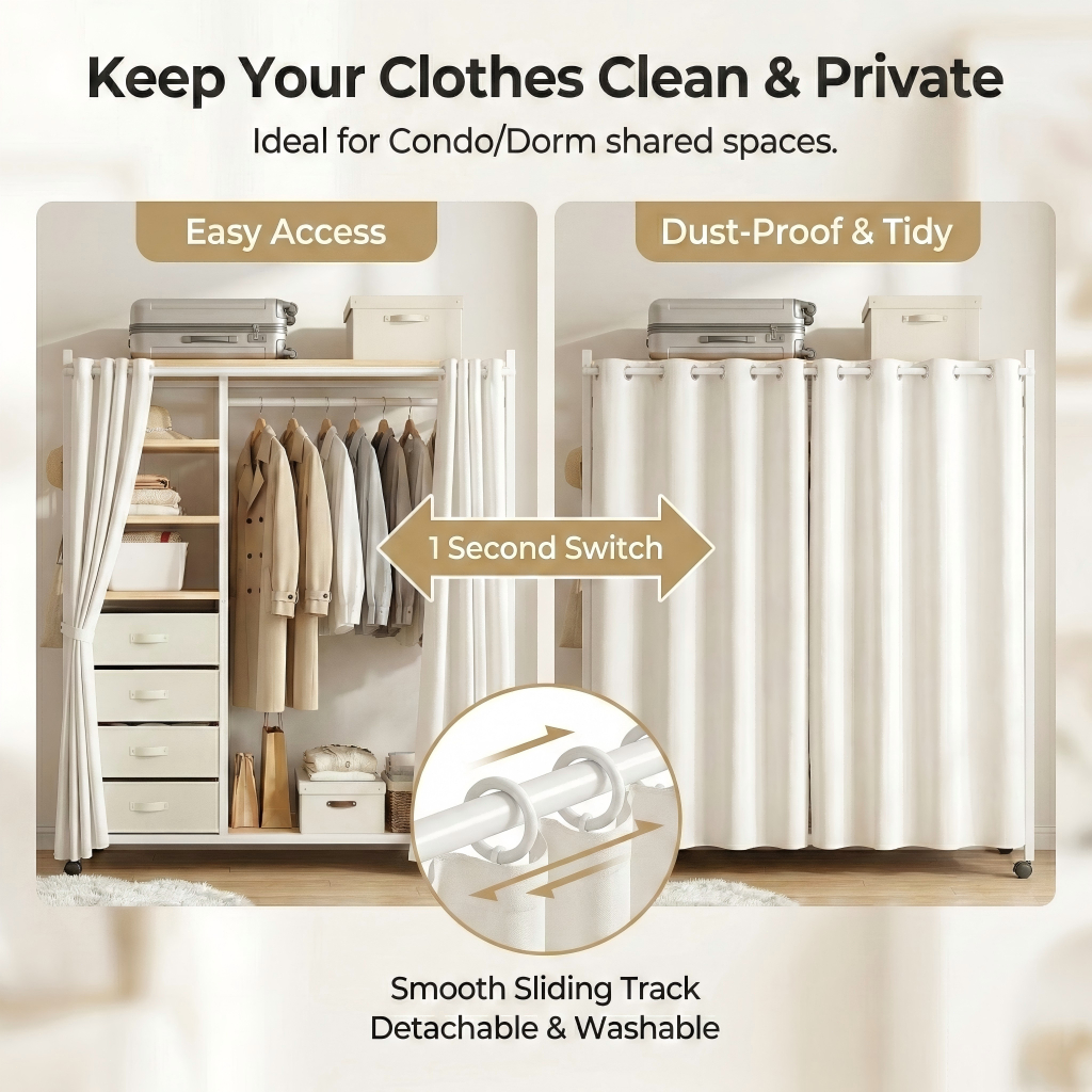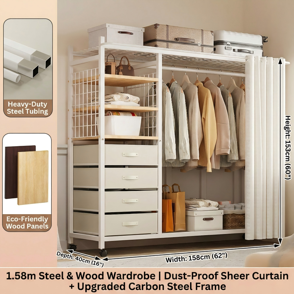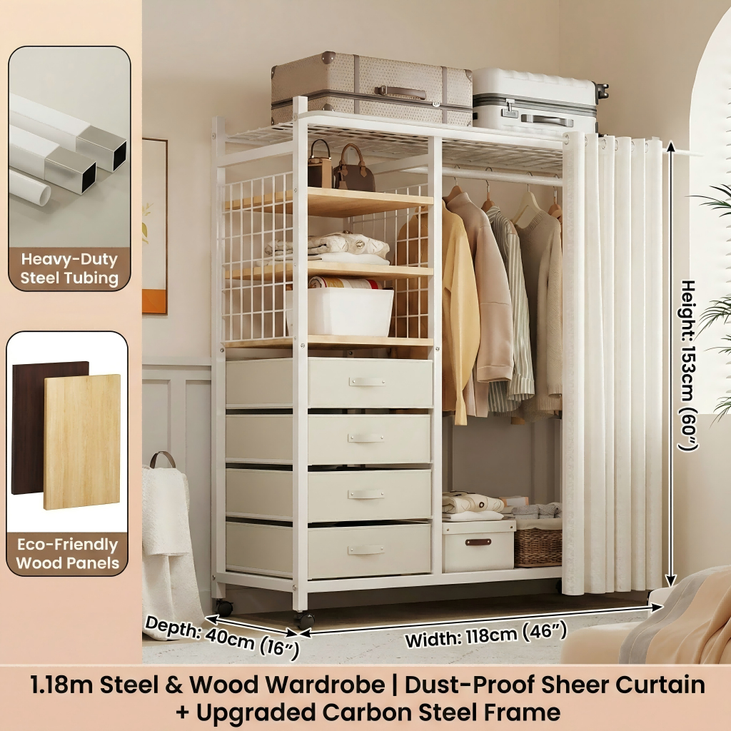 Nordic Mobile Coat Stand Heavy Duty Carbon Steel Clothes Organizer With Curtain&Drawer Wardrobe Rack