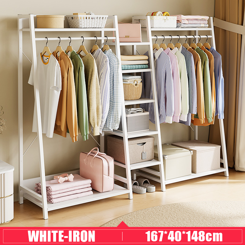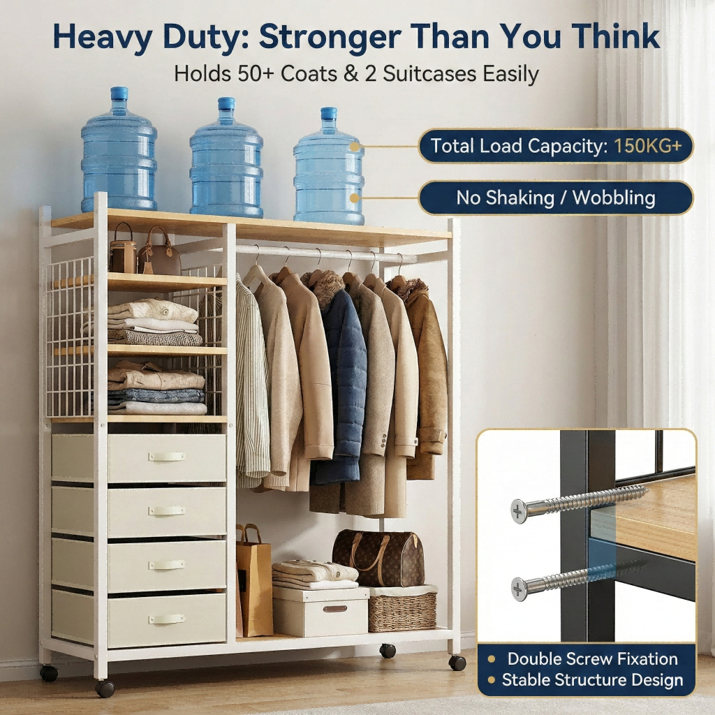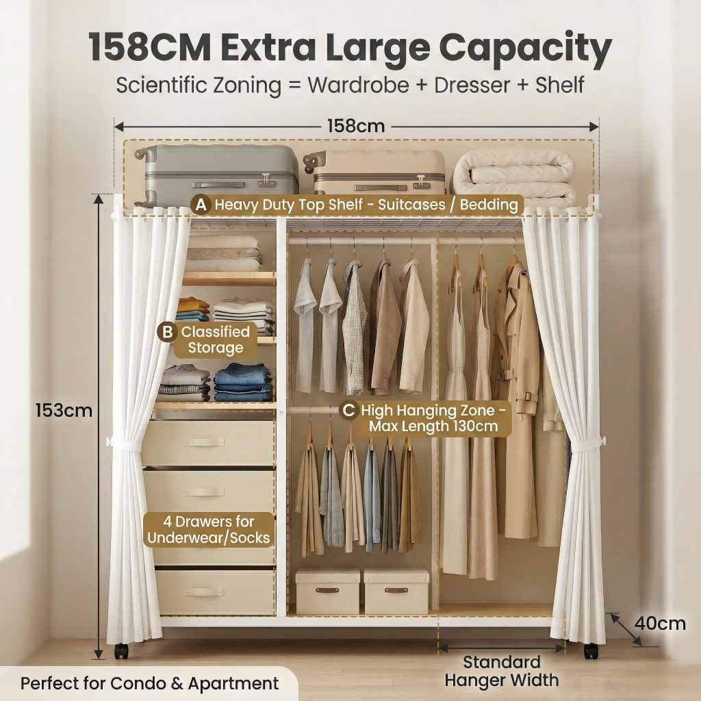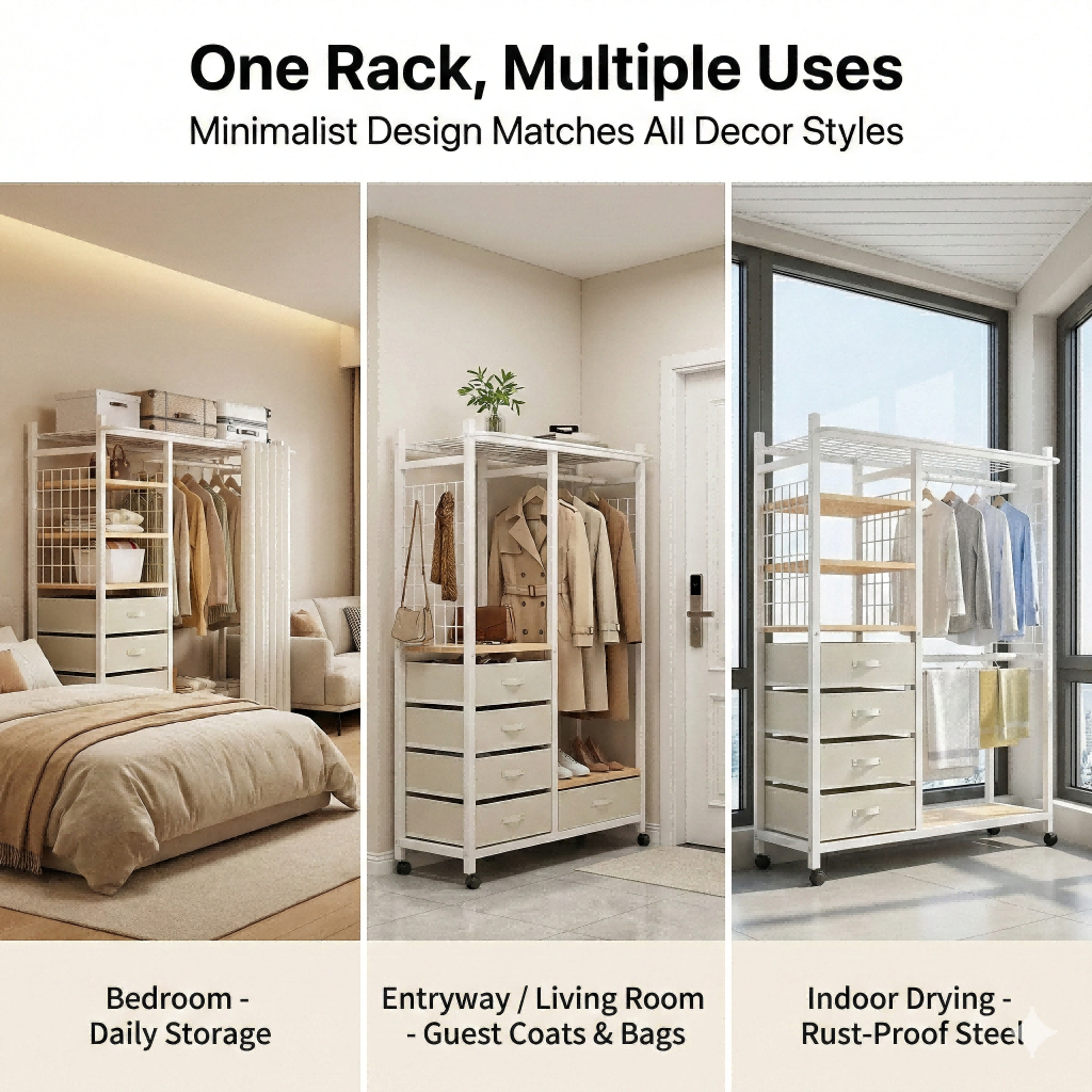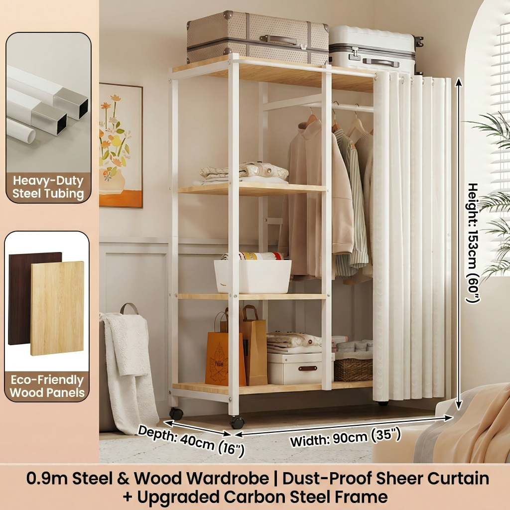 Nordic Mobile Coat Stand Heavy Duty Carbon Steel Clothes Organizer With Curtain&Drawer Wardrobe Rack