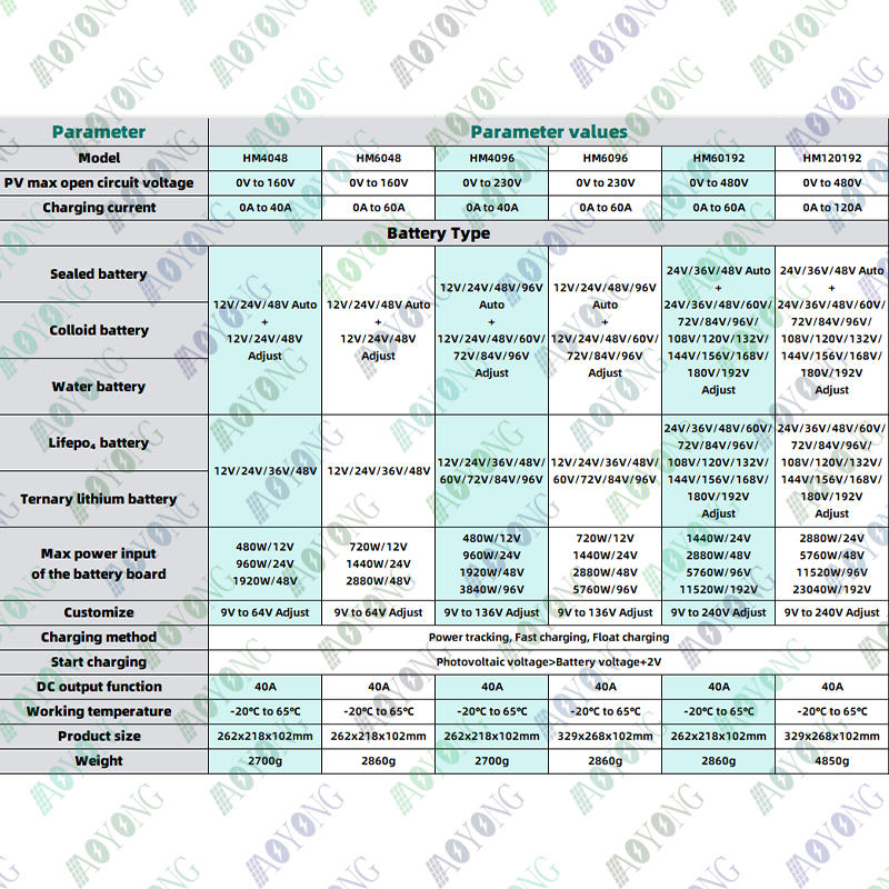 Aoyang MPPT Solar Charge Controller 480V High PV Max 12V/24V/48V Auto and 24V to192V Adjust Battery