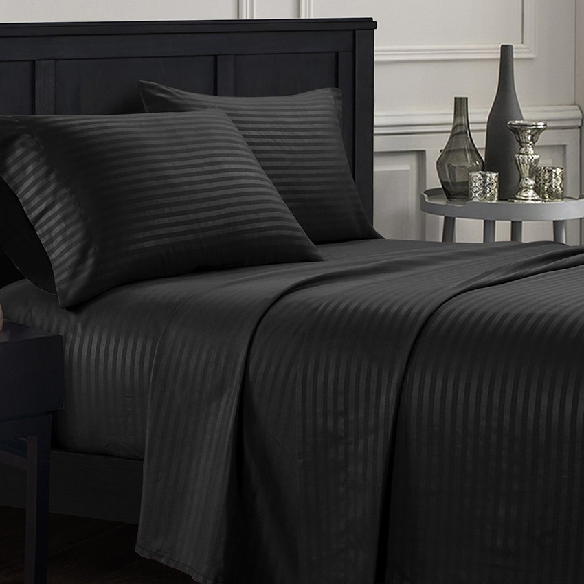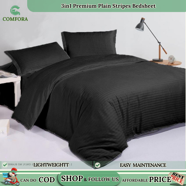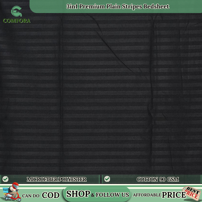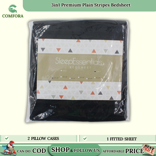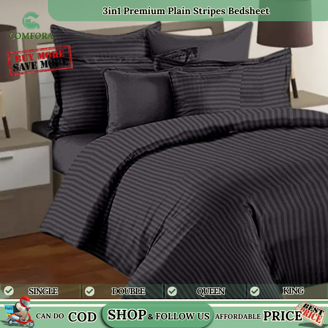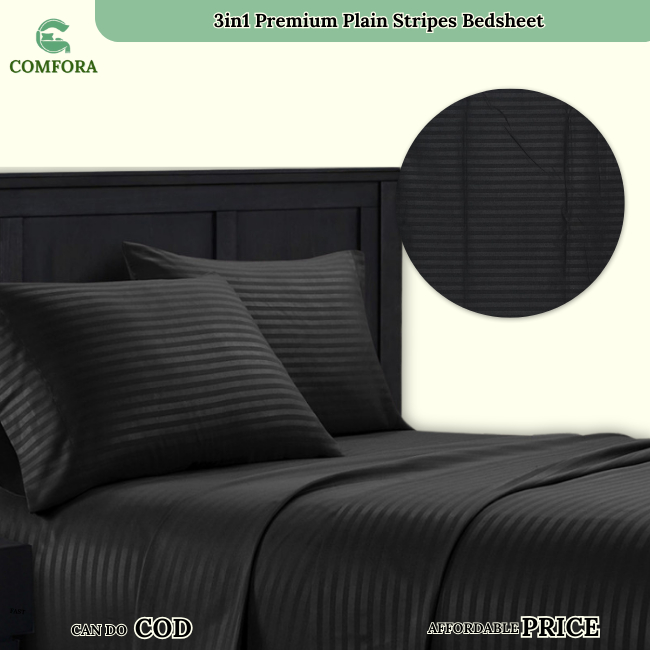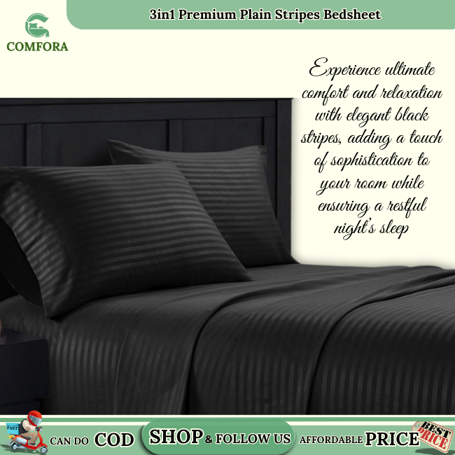Comfora 3in1 Bed sheet Premium Stripes Bedsheet Beddings (2 Pillowcases 1 Fitted Sheet) BlackStripes
